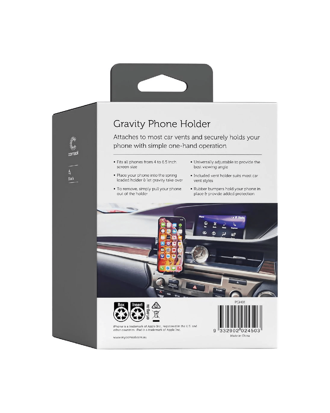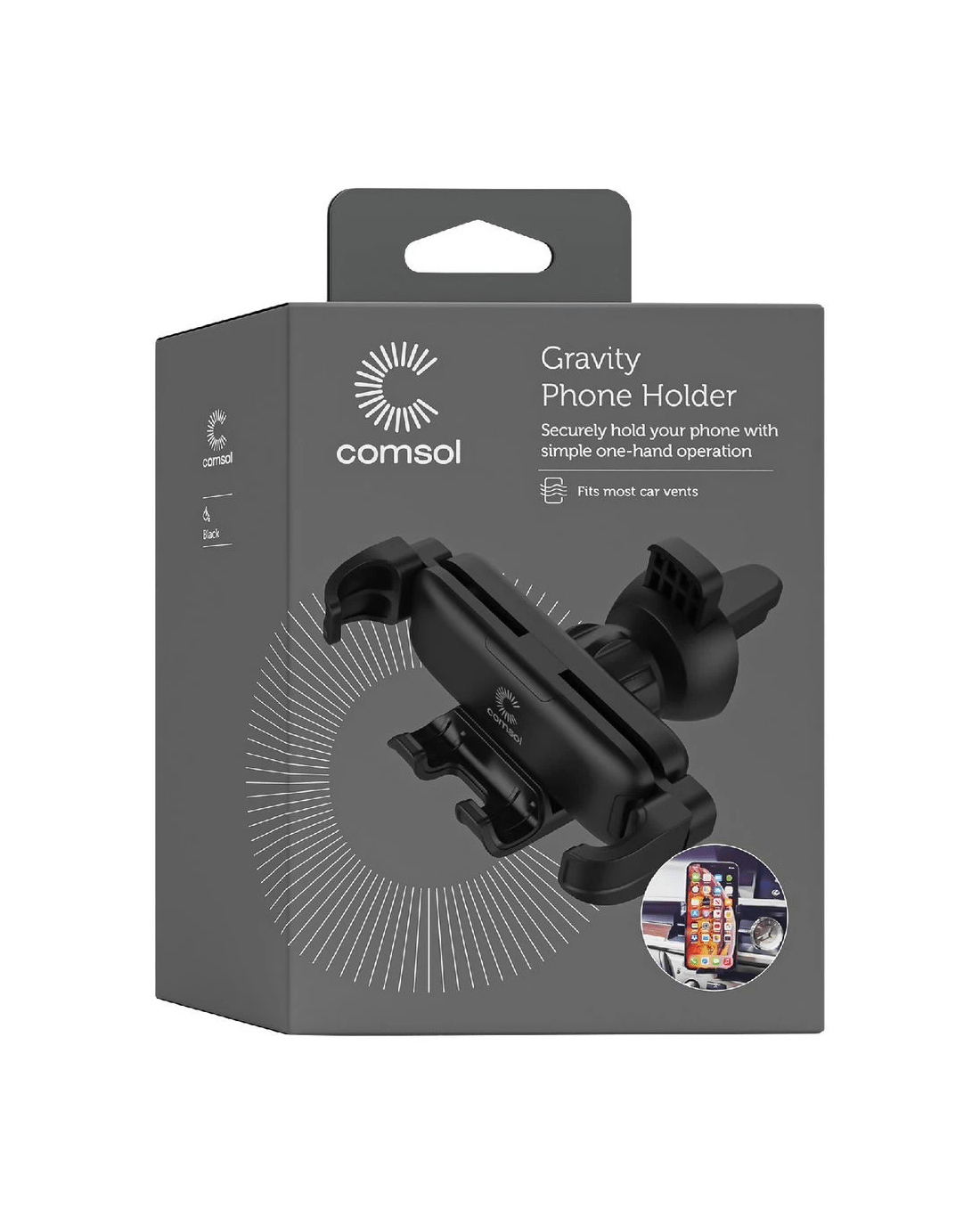 This Comsol Gravity Vent Mount attaches to most car vents and securely holds your phone with simple one-hand operation. It fits all phones with a screen size measuring between 4 and 6.5" and is universally adjustable to provide the best viewing angle.
