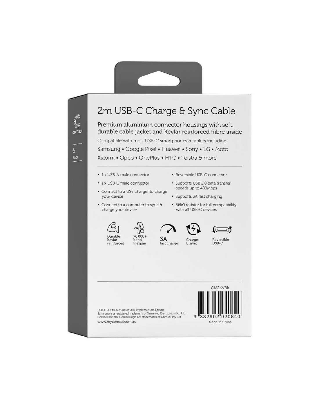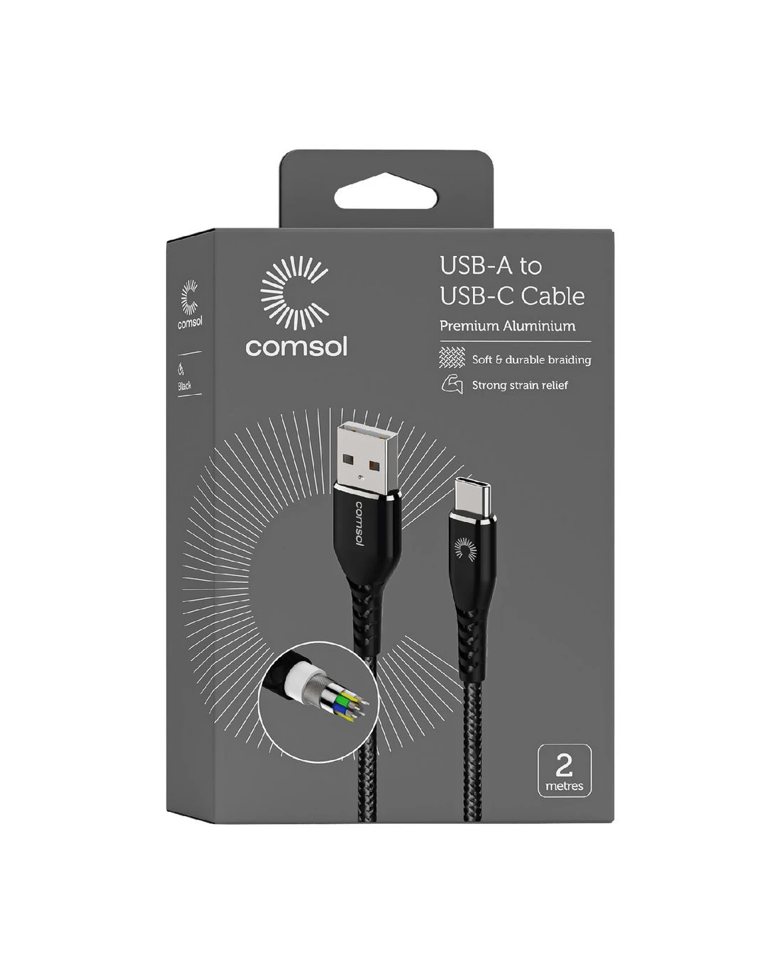 Sold by OfficeworksComsol Kevlar USB-A to USB-C Cable 2m Black