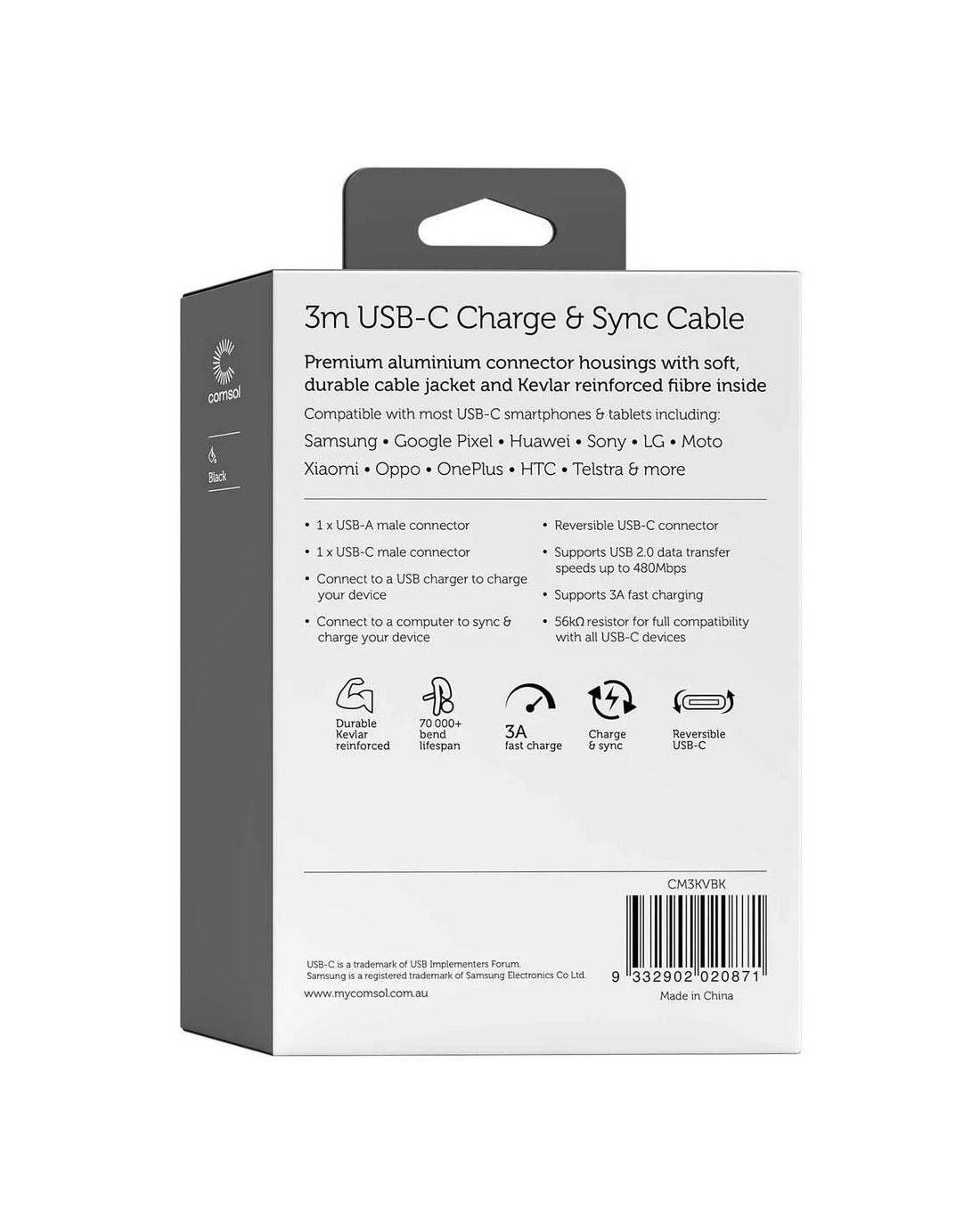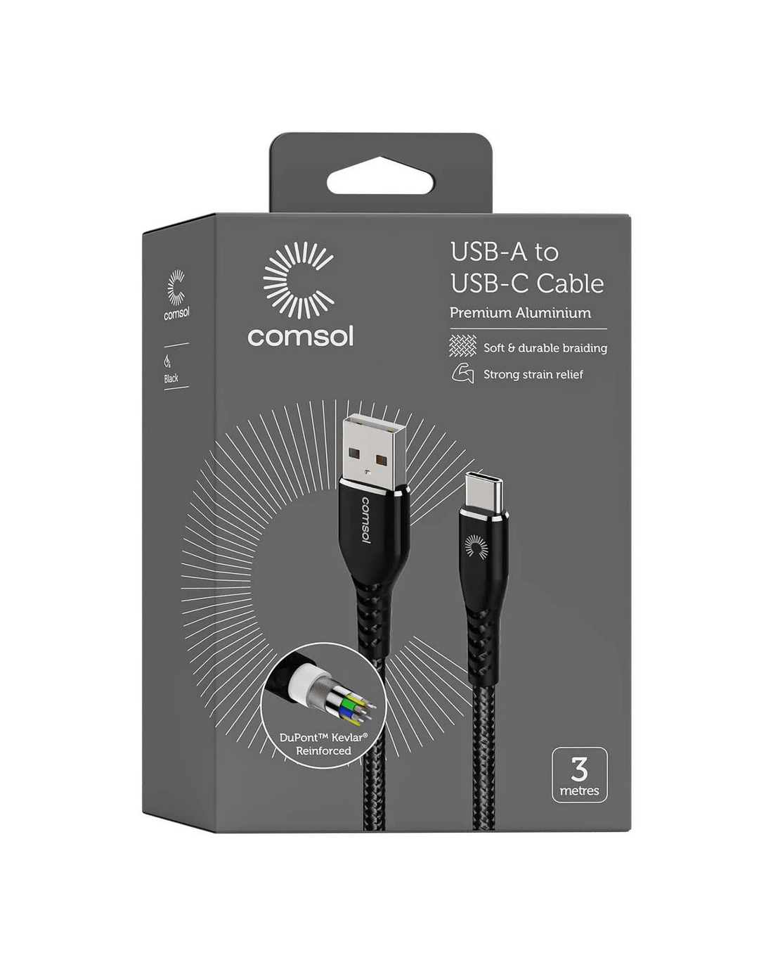 Sold by OfficeworksComsol Kevlar USB-A to USB-C Cable 3m Black
