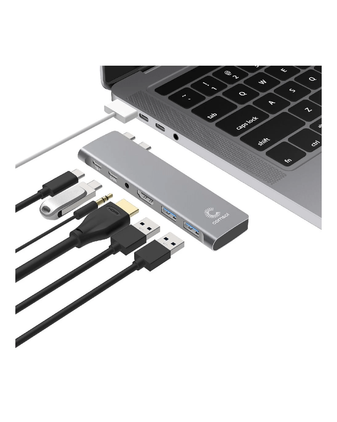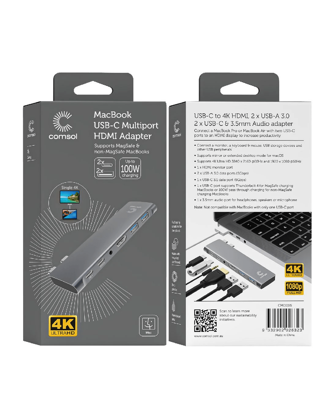 Streamline your workspace and bolster productivity with this Comsol Multiport Hub. Connect your MacBook Pro or MacBook Air with 2 x USB-C ports to an HDMI display, as well as a keyboard, mouse, USB storage devices and other USB peripherals. This hub is suitable for both MagSafe and non-MagSafe MacBooks and supports mirror or extended desktop mode for macOS.