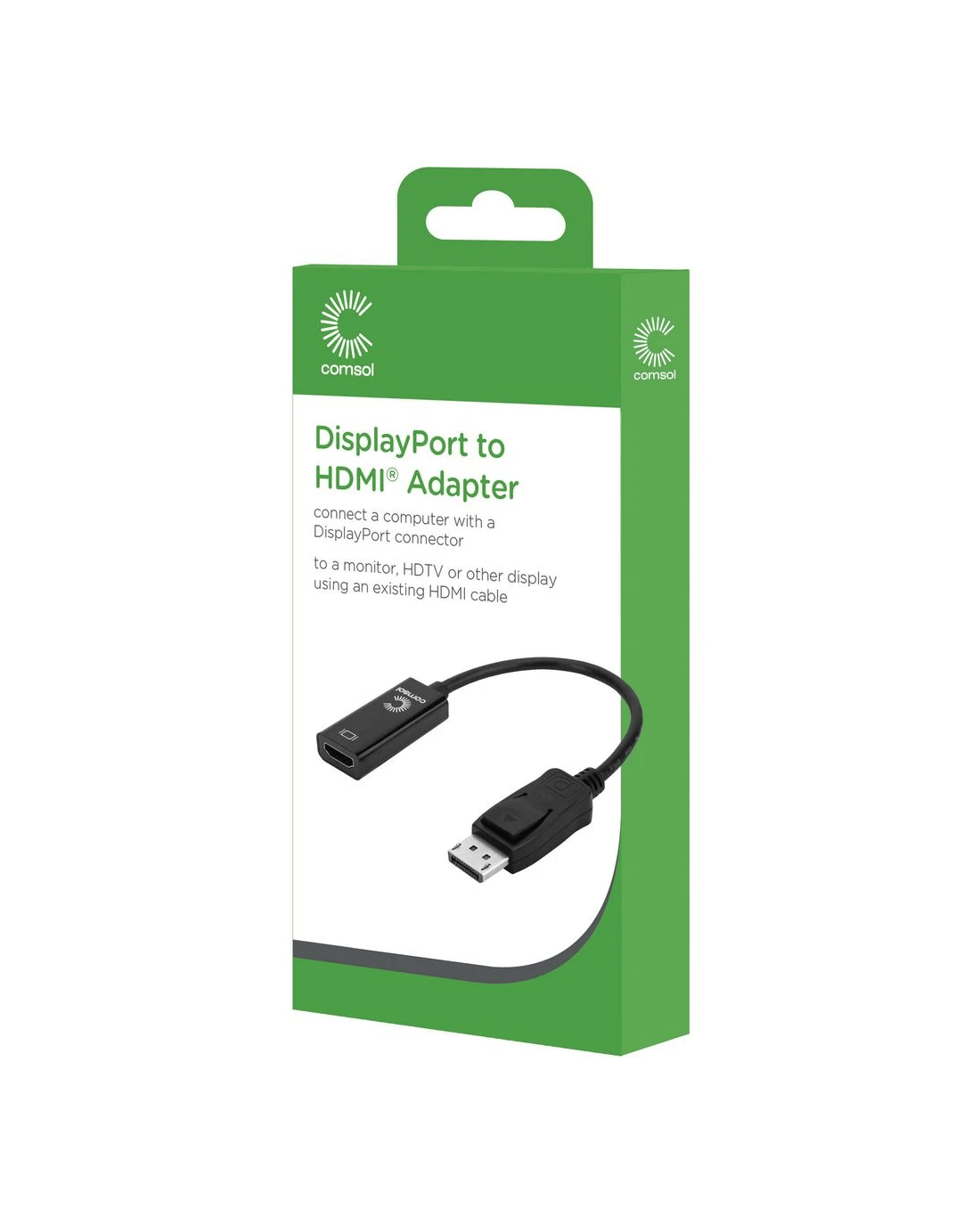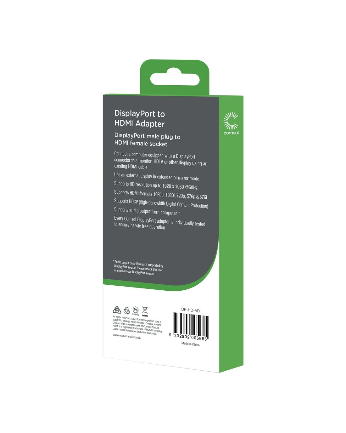 This Comsol Male DisplayPort to Female HDMI Adaptor will let you connect your desktop computer or notebook with a DisplayPort connector to a monitor, projector or HDTV with an HDMI connector. This cable supports full HD display up to 1920 x 1080, and can be used in extended or mirror mode.