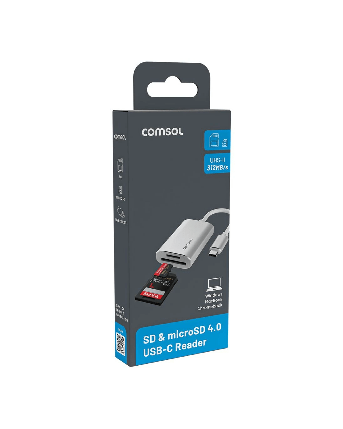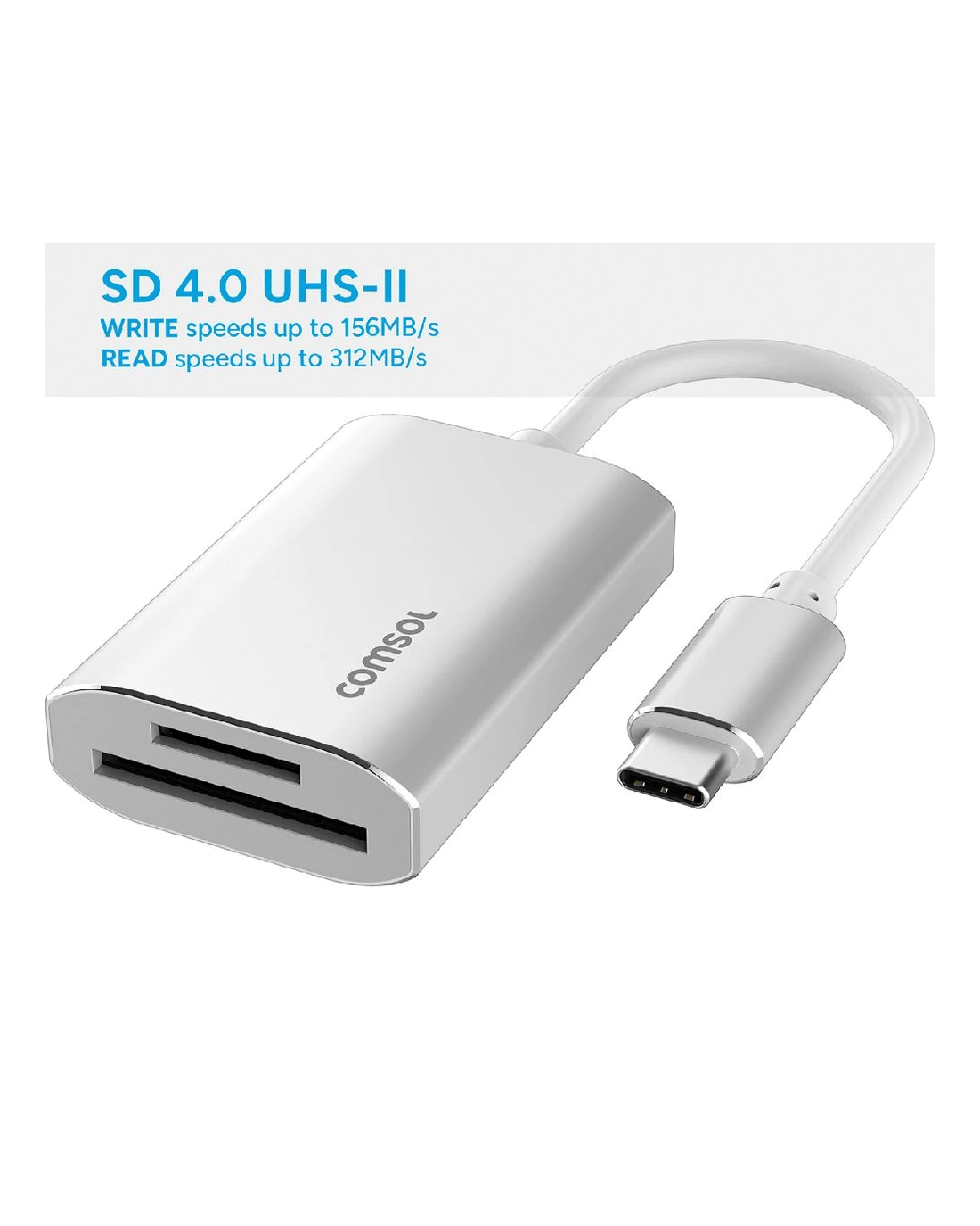 This Comsol SD and MicroSD 4.0 USB-C reader lets you transfer digital media easily between your laptop and phone or tablet. It plugs easily into a USB-C port and allows you to transfer files at speeds up to 312MB/s, perfect for handling large, professional HD video and photo files.