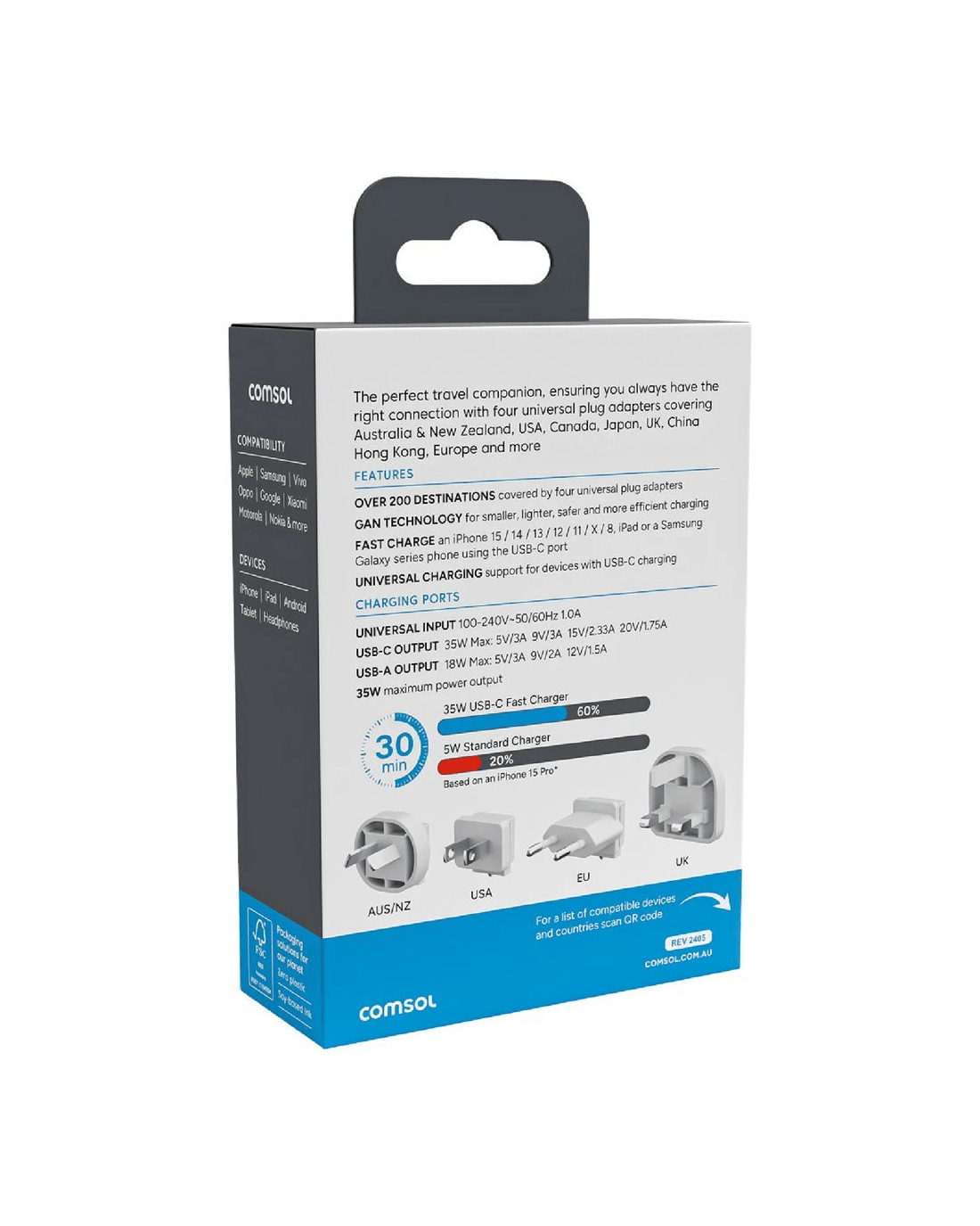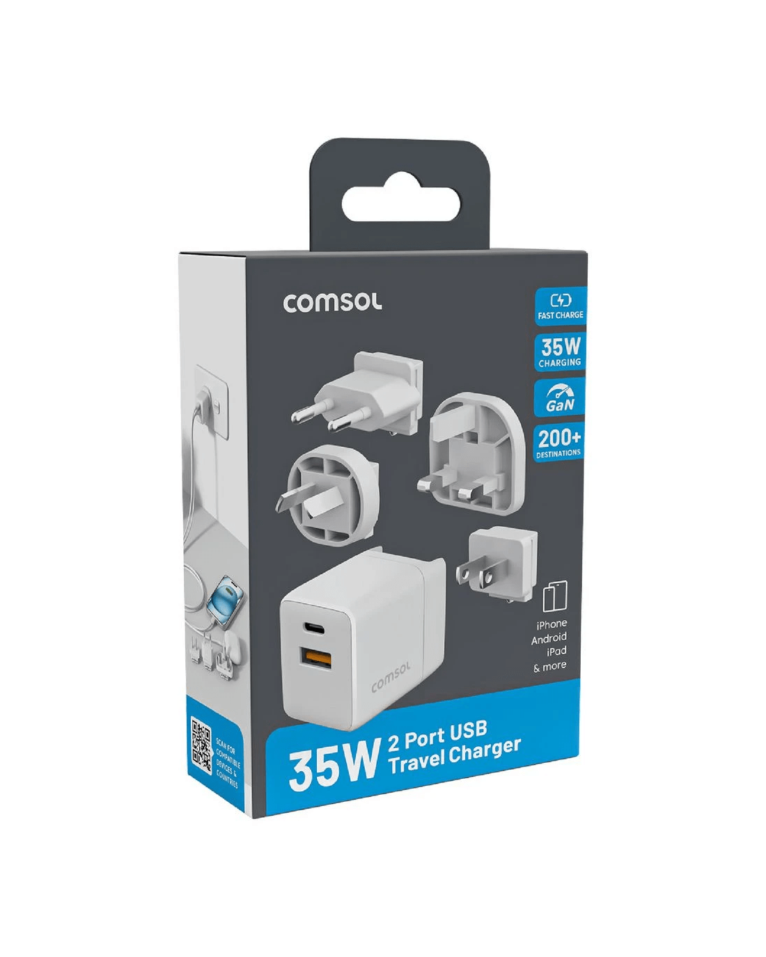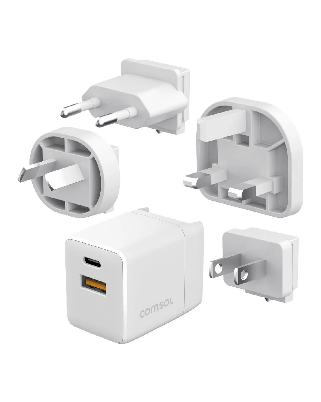 Keep your devices charged while you globetrot with this Comsol Travel Wall Charger. It has a USB-C and a USB-A port for charging your devices, and adapters to suit the different countries you visit.
