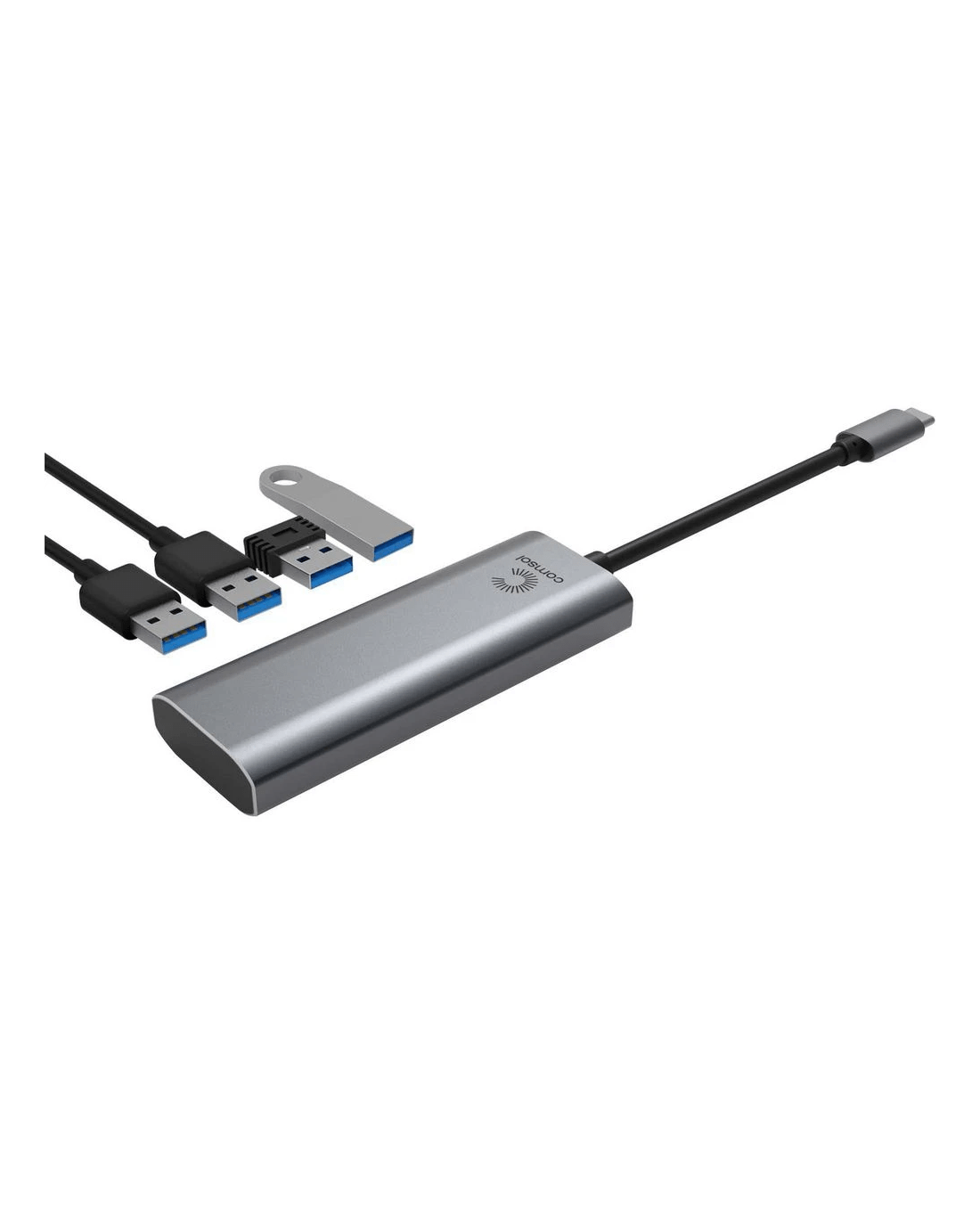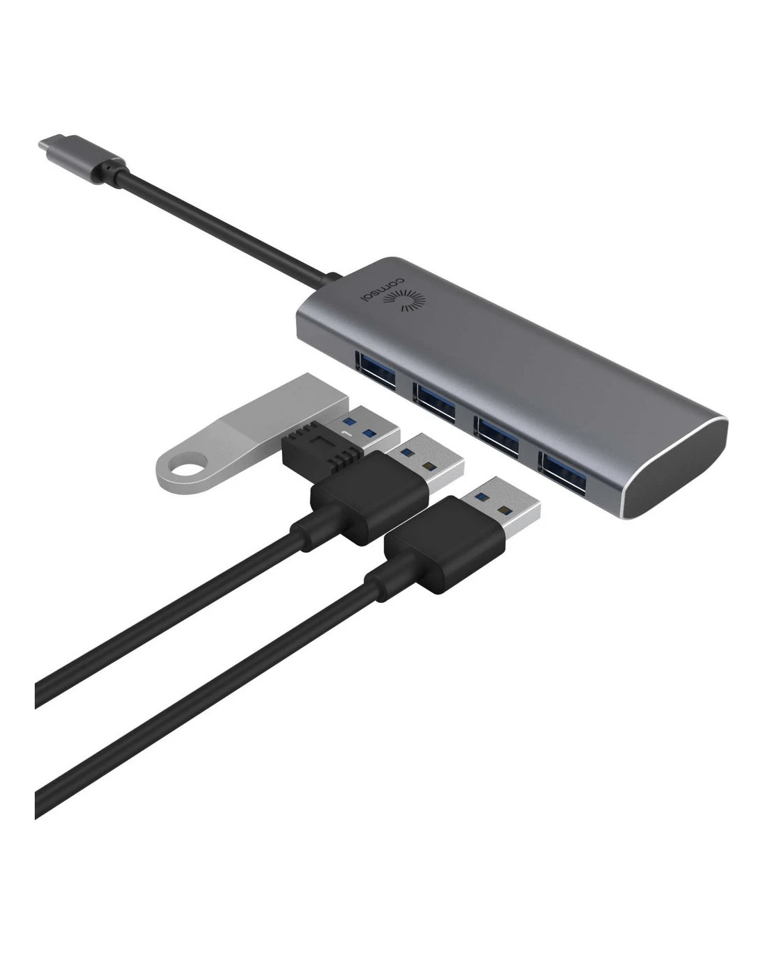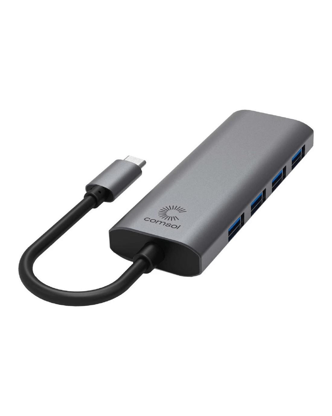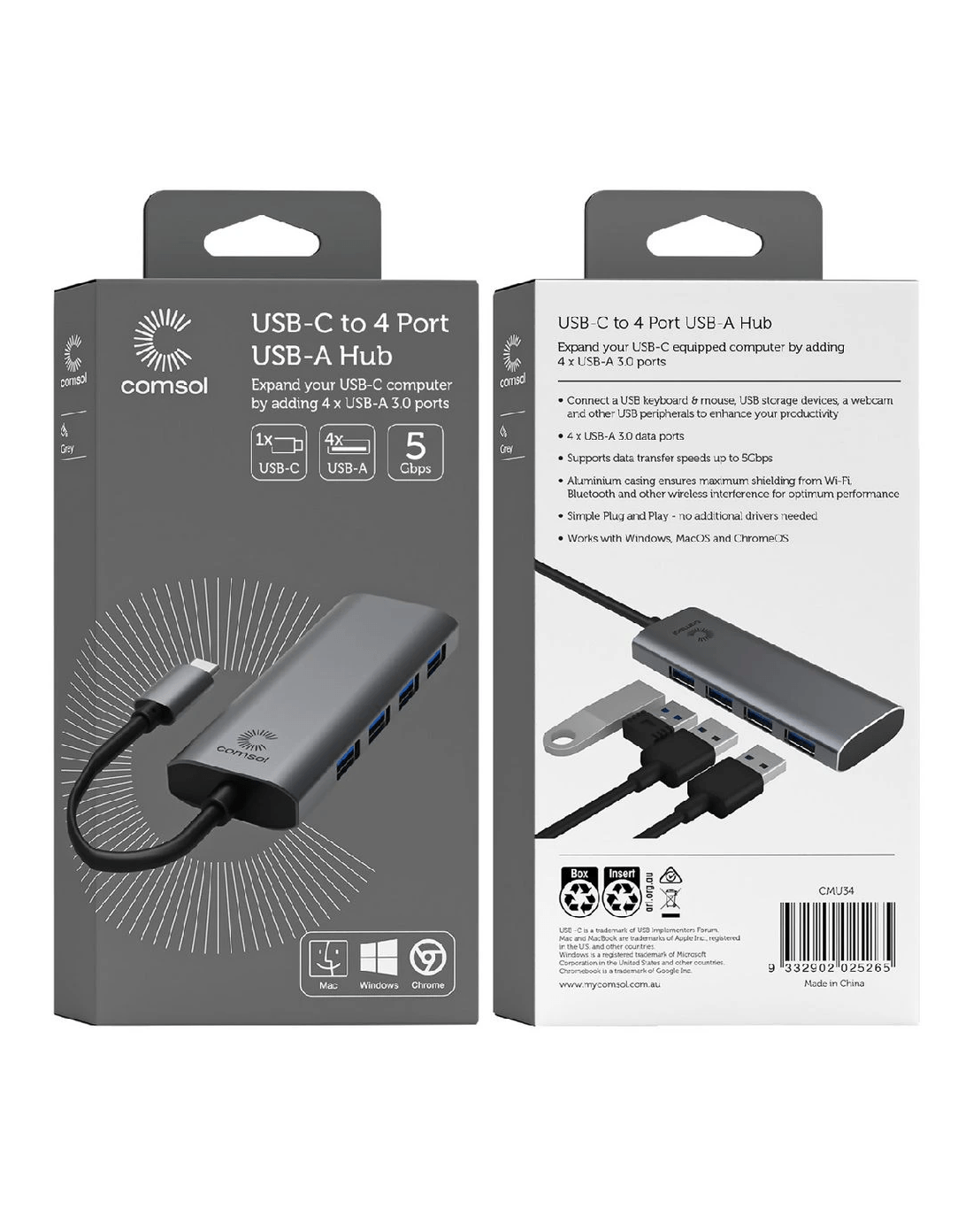 Connect this Comsol USB-C 4 Port Hub directly to your desktop or laptop computer to get an additional 4 USB-A 3.0 data ports. The simple plug and play design allows you to connect everything from a USB keyboard and mouse to USB storage devices or a webcam. Supporting data transfer speeds of up to 5Gbps, the aluminium casing on the included cable ensures maximum shielding from WiFi, Bluetooth and other wireless interferences for optimum performance.