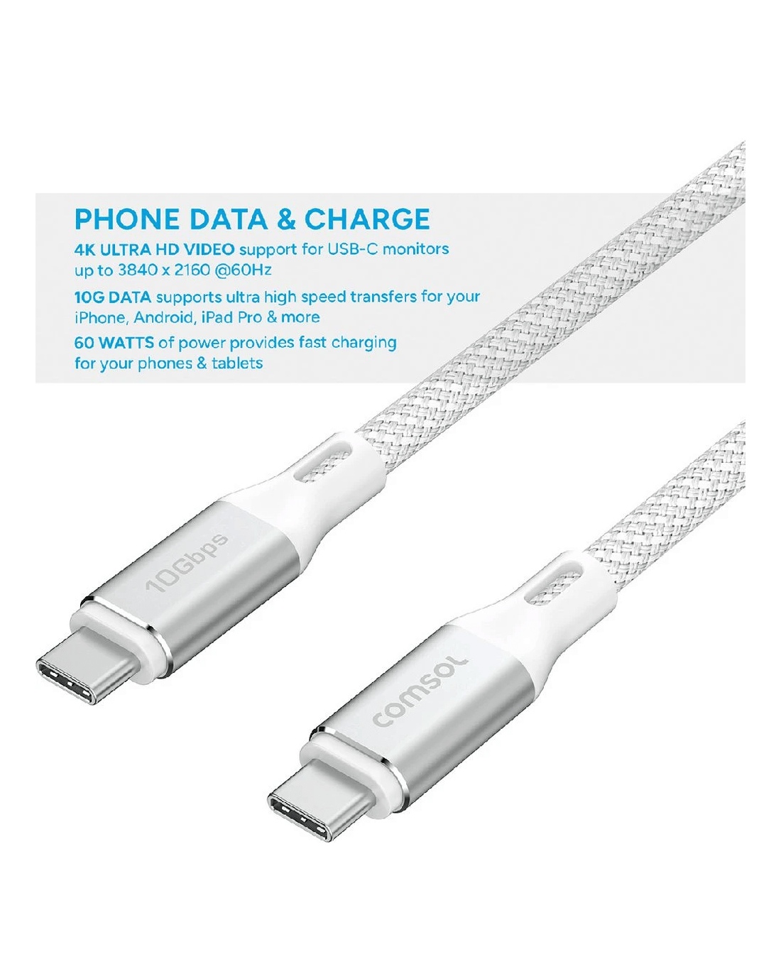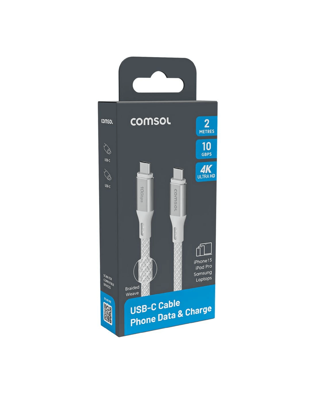 This Comsol USB-C Cable is a handy addition to your work or home office setup. It can be used to charge your devices, but also supports a data transfer speed of 10Gbps, so you can quickly exchange files and programs, At a 2 m length, it's easy to slot in your bag and take on the go.
