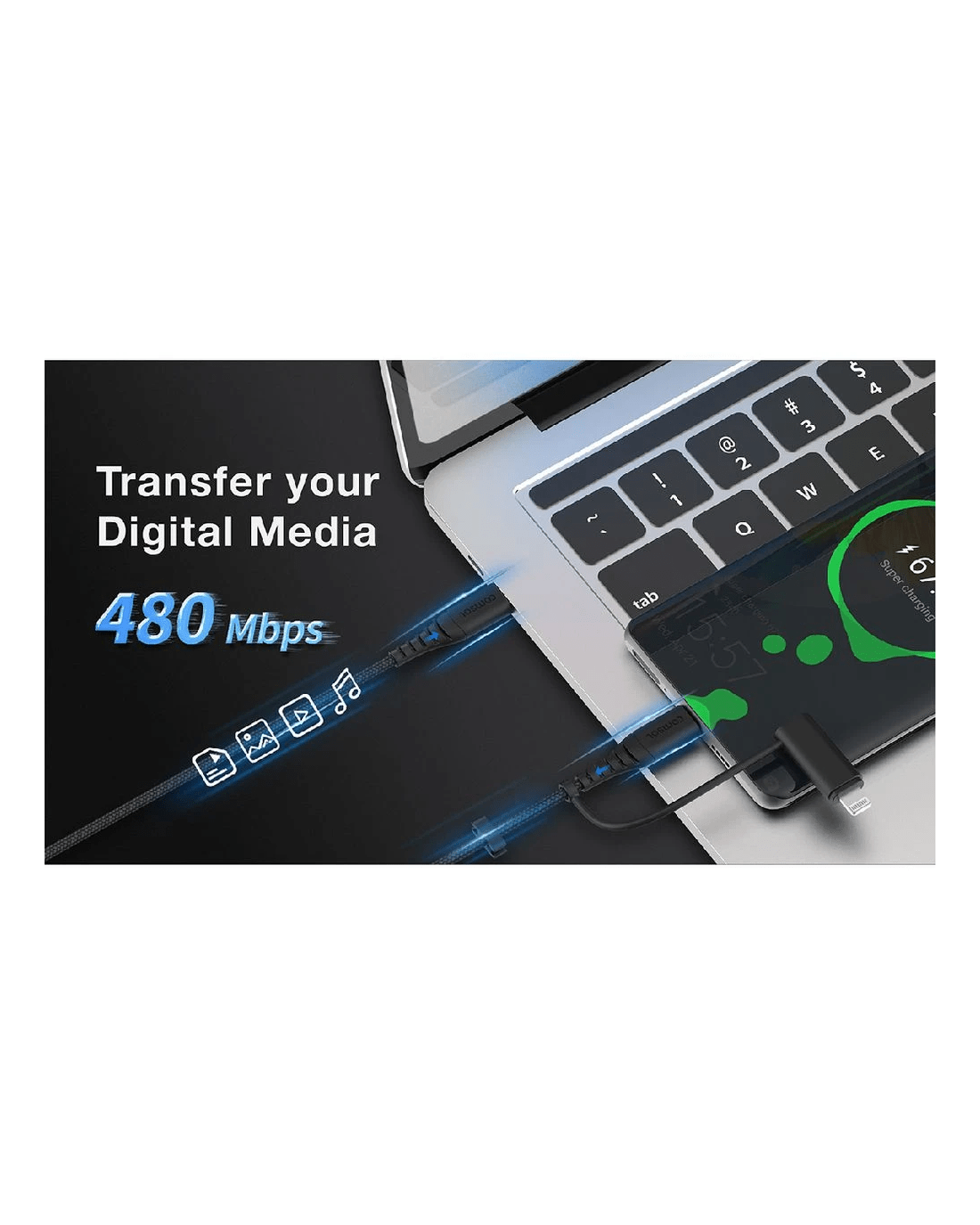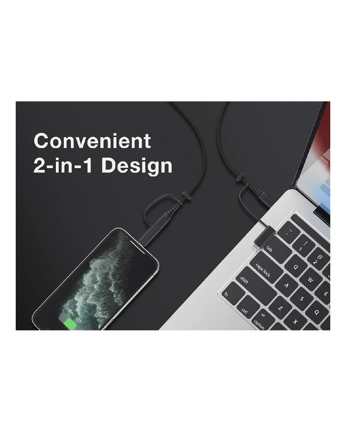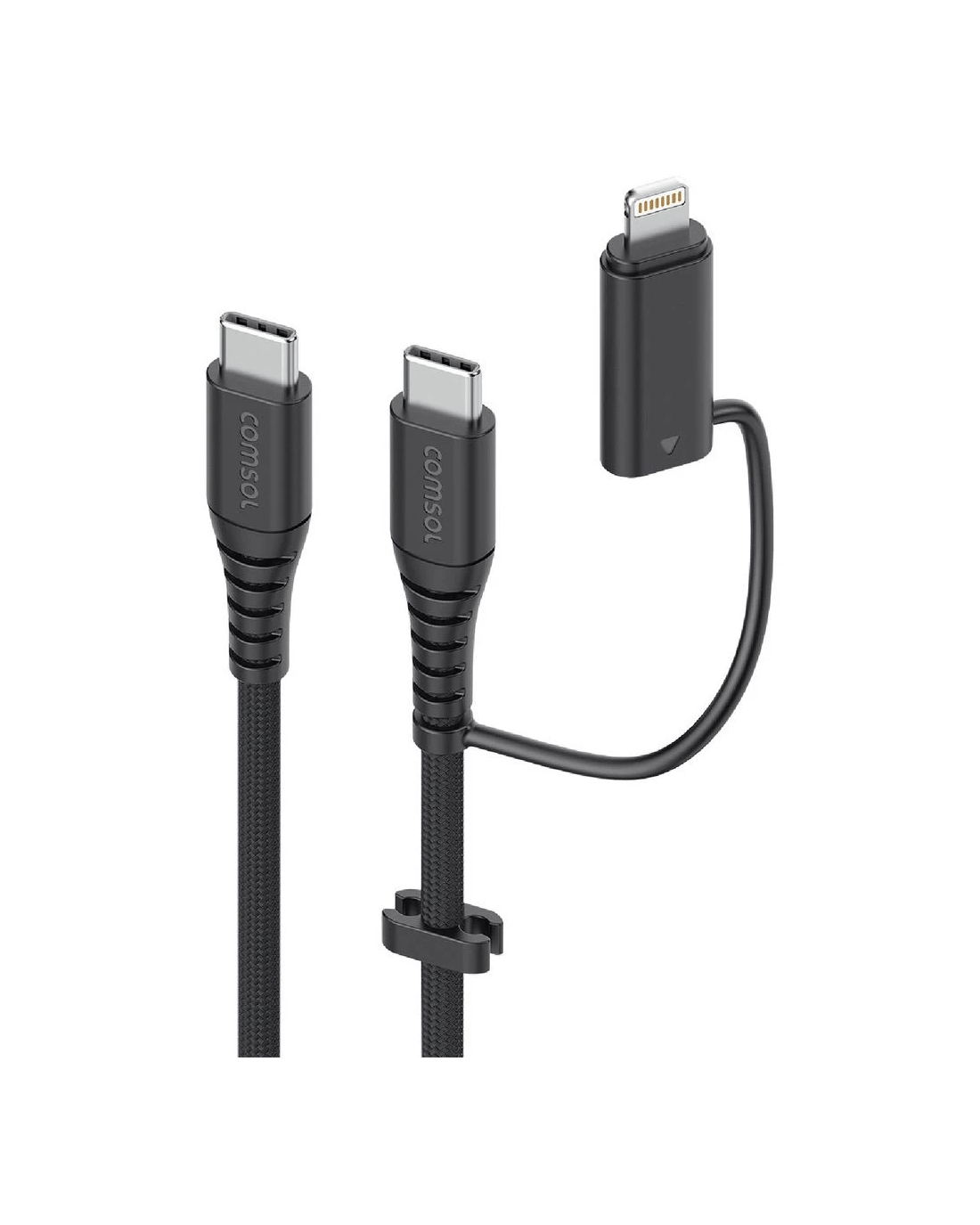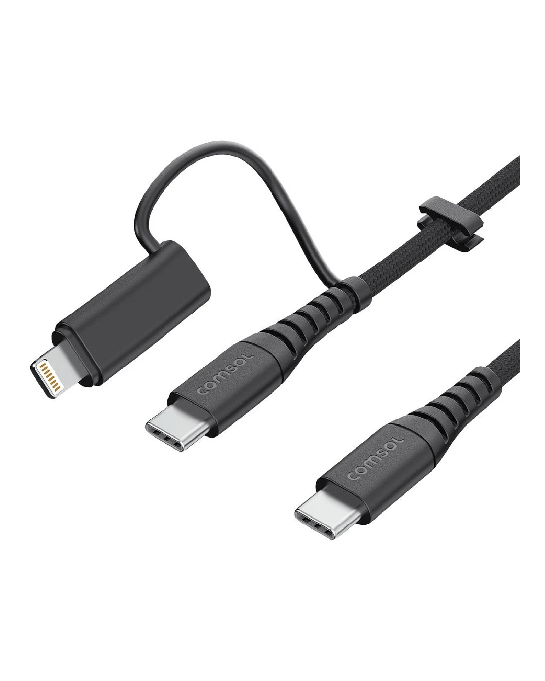 Charge your USB-C enabled Apple devices, plus, your older Lightning devices with this Comsol USB-C Cable with USB-C to Lightning Adapter. The only charging cable you'll need, this universal 2-in-1 cable is the perfect charging companion for all your phones, AirPods, iPad, MacBook and other USB-C enabled laptops. Its made from super flexible silicone wrapped in soft durable fabric with extra strong strain relief for robust performance with a premium, soft feel.