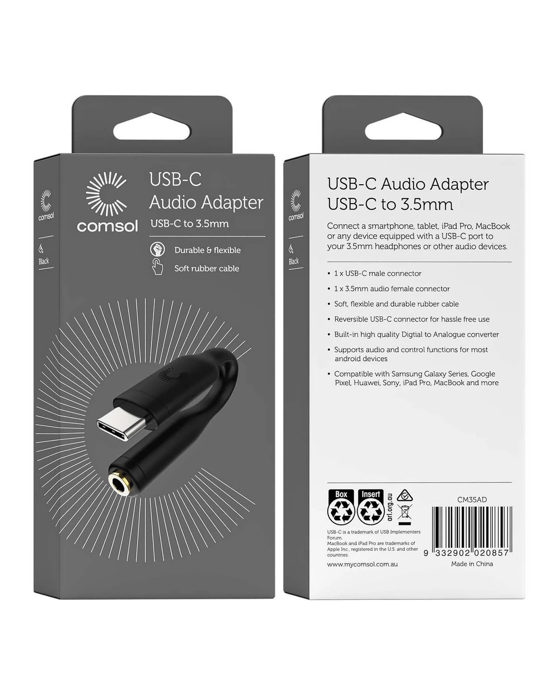 This Comsol Audio Adapter is designed for USB-C smartphones without a headphone jack. It allows you to plug 3.5 mm headphones, speakers and aux cords into your phone to listen to music, podcasts and more. It comes in a small, compact size for storing in a small bag or your pocket after use.