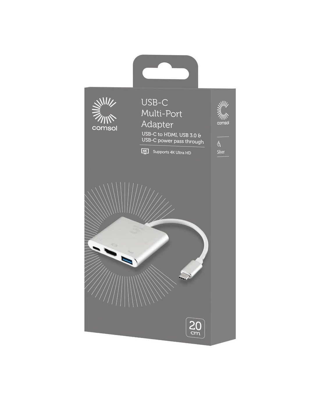 This Comsol Adaptor has a USB-C connector on one end and has USB-C, USB-A and HDMI connectivity on the other end. You can use it to connect devices to monitors and displays.