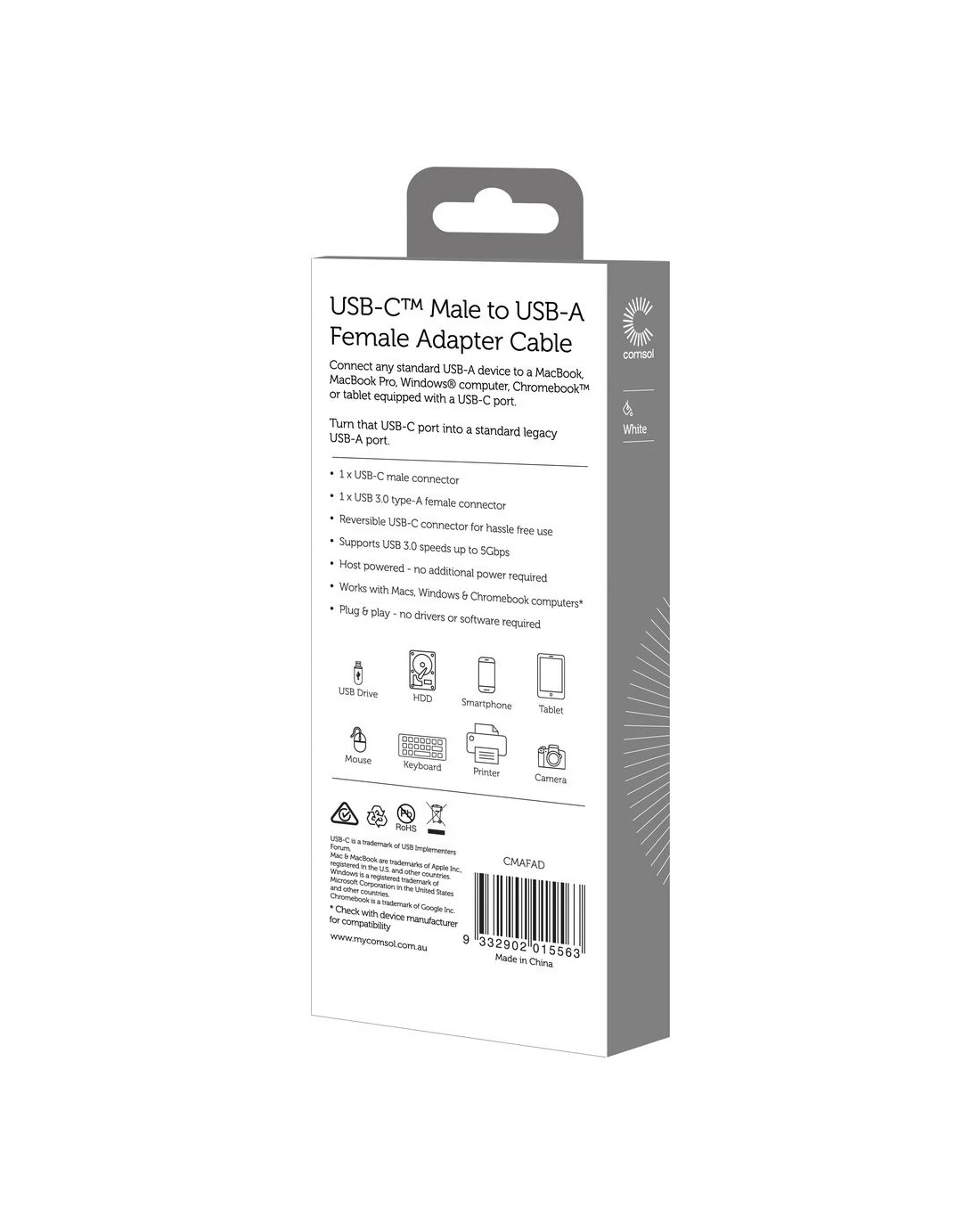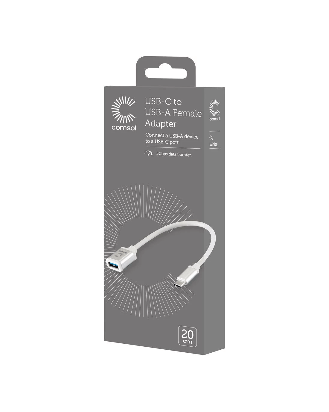 This Comsol USB-C Adaptor is perfect for use with your MacBook or other USB-C computer. It allows you to connect your computer to your existing USB devices such as hard drives, USB flash drives and more.