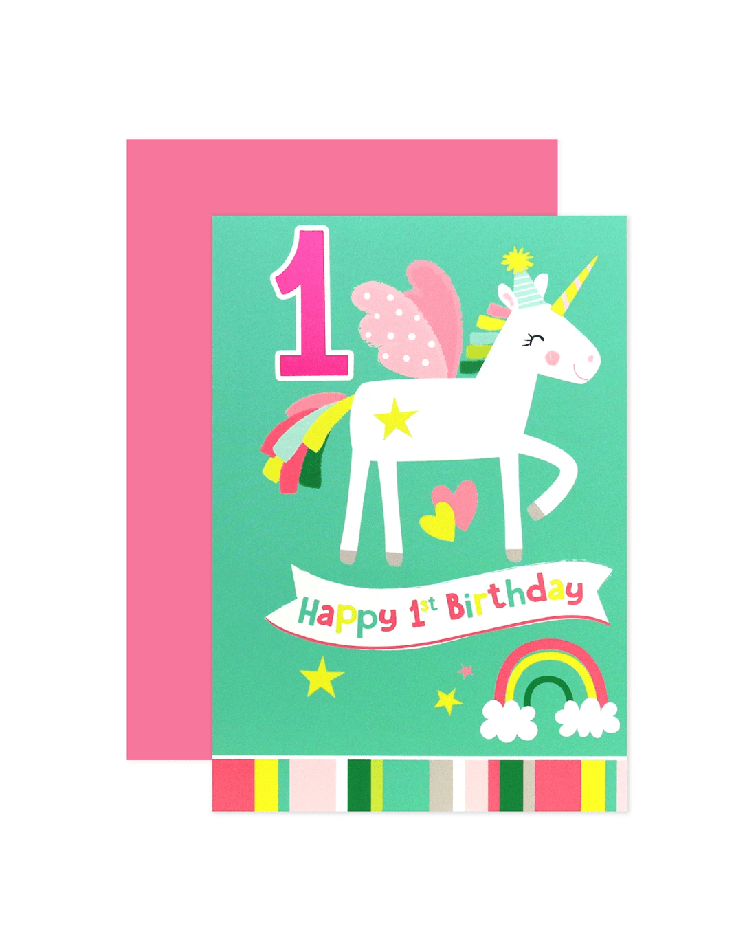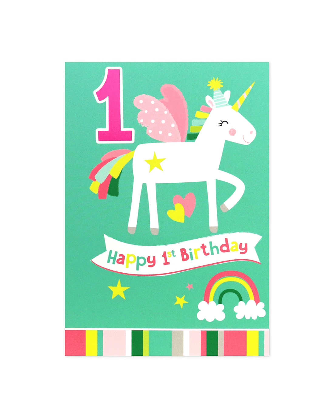 • Front of card features a unicorn and rainbows with the message 'Happy 1st Birthday'