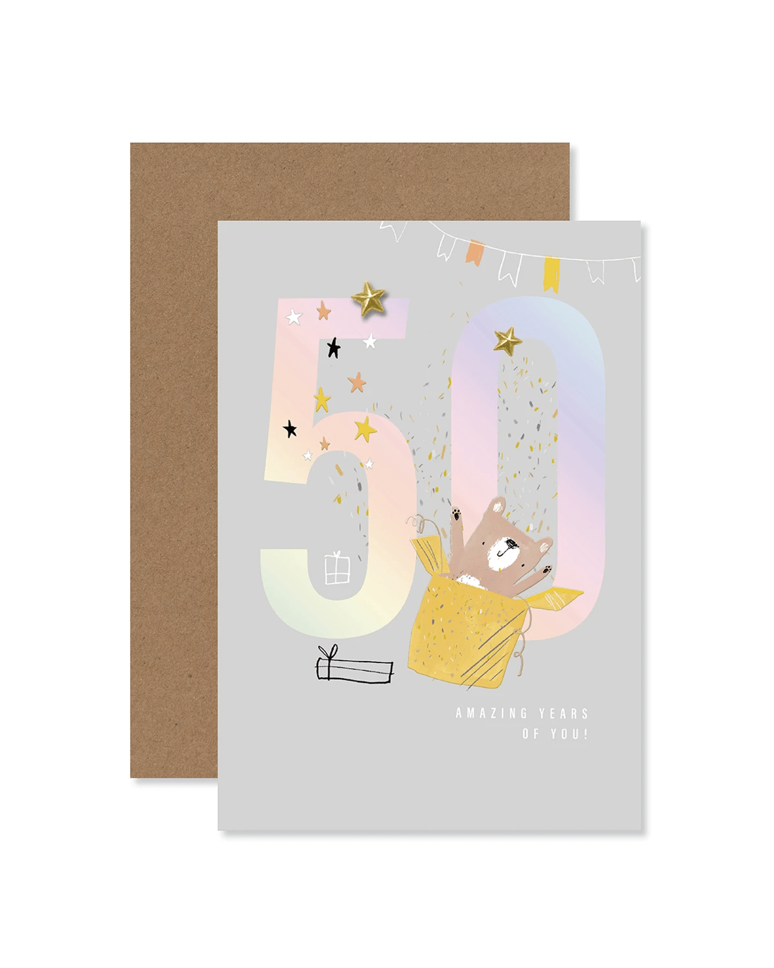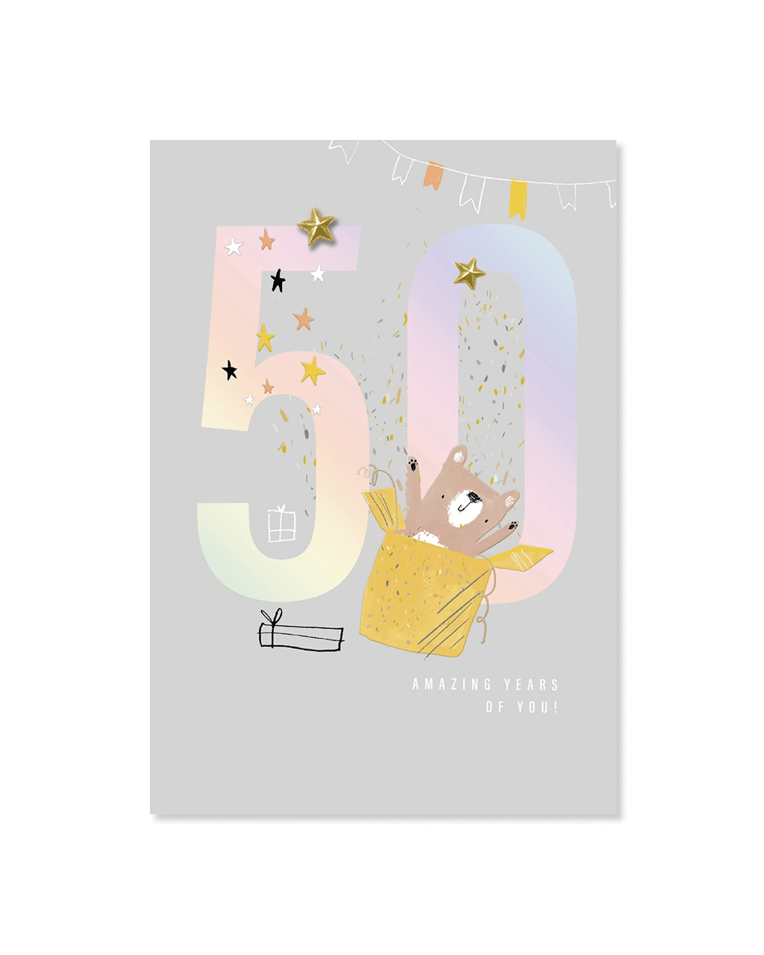 • Front of card features silver foil detailing, gold star attachment, cute illustrative bear and the message '50 AMAZING YEARS OF YOU!'