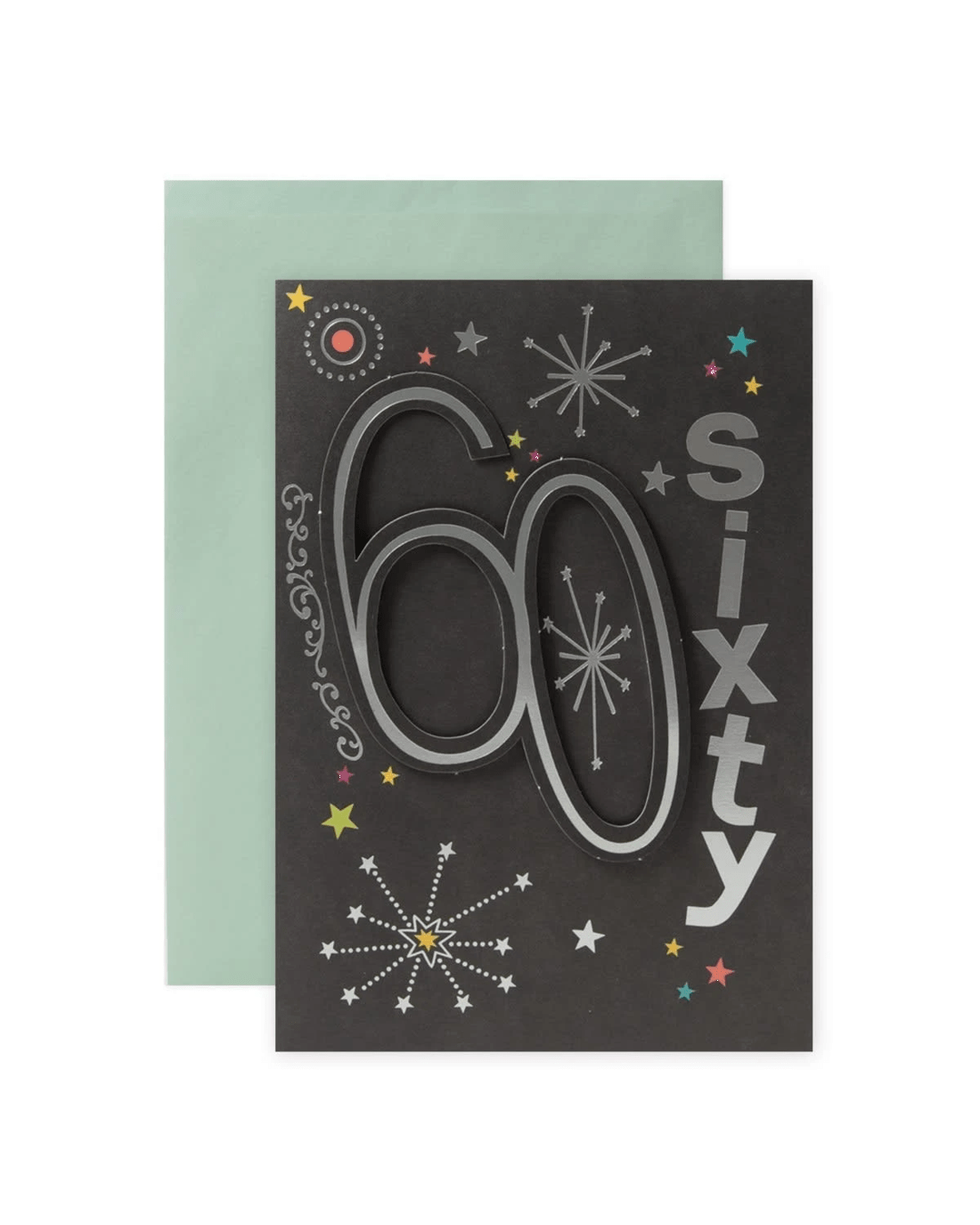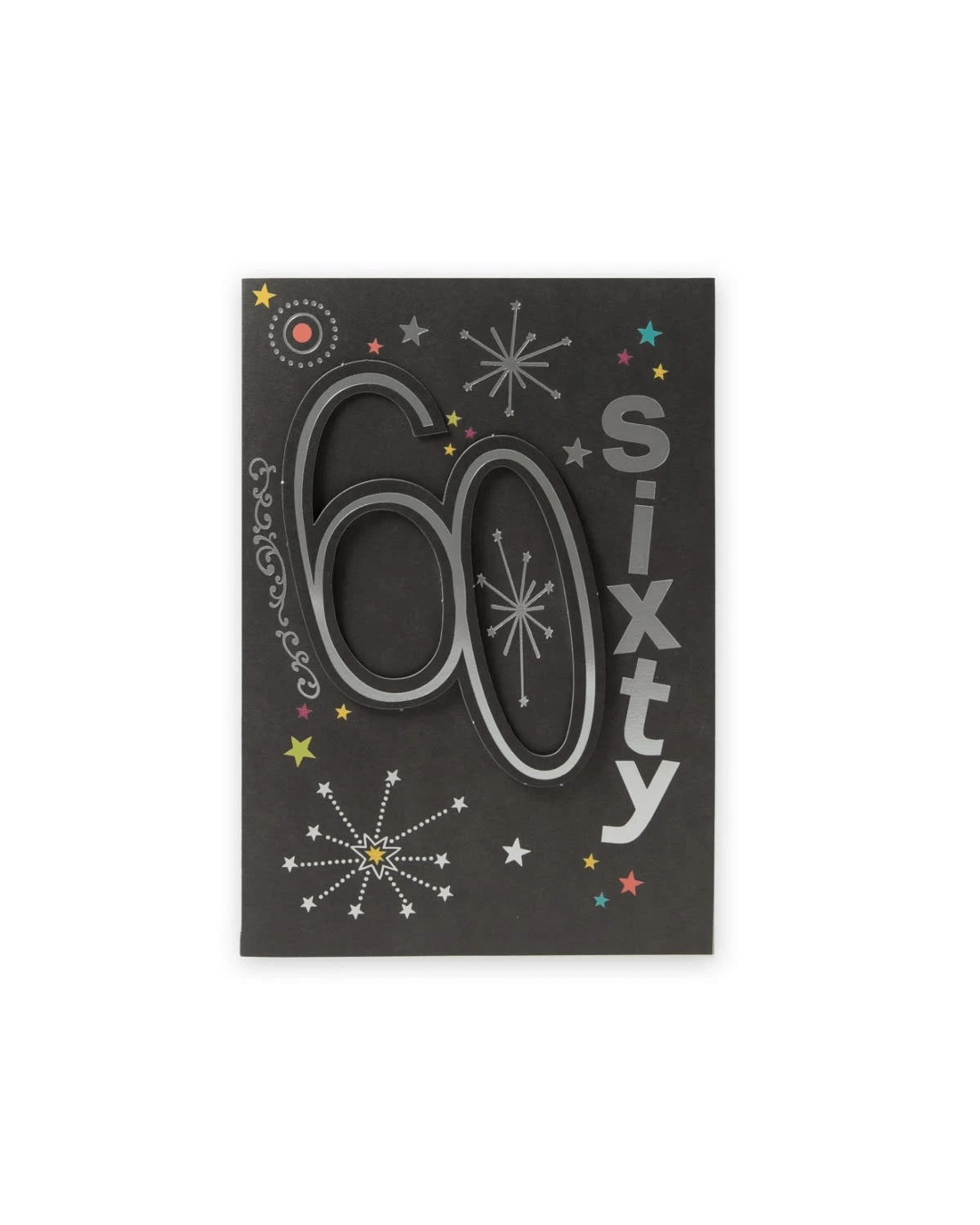 • The front of the card features silver foil highlights, a 3D plaque attachment, illustrations of stars and the message '60 sixty'
