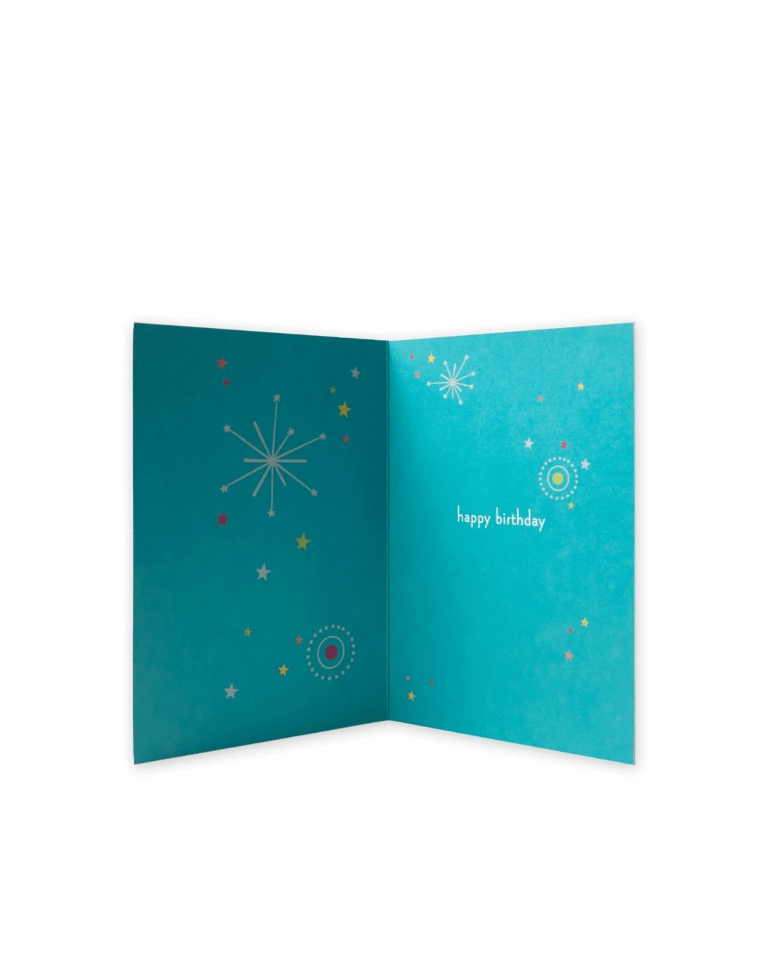 • The inside of the card is illustrated with colourful stars alongside the message 'happy birthday'