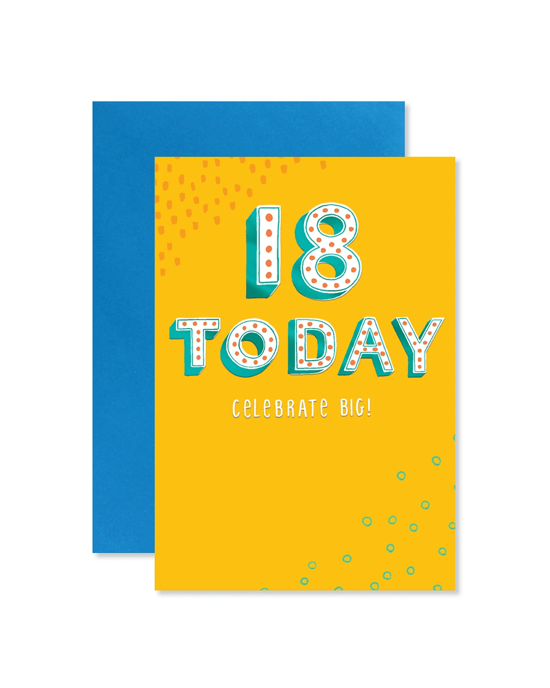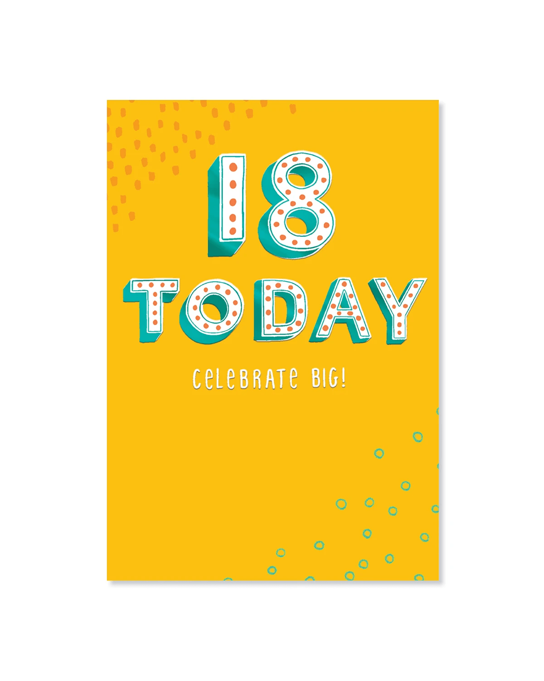 • Front of card features aqua foil detailing with the message: '18 TODAY CELEBRATE BIG!'