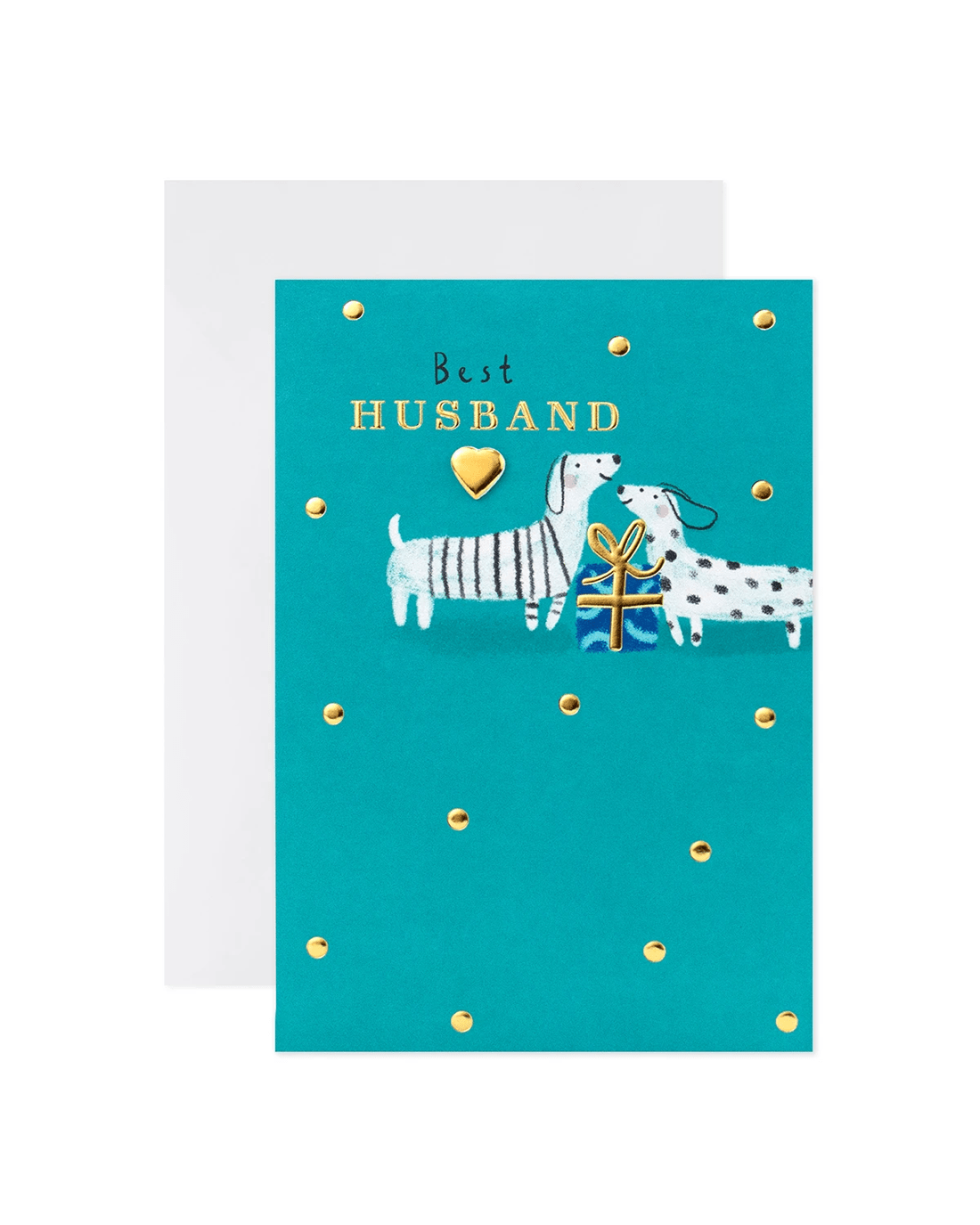 • Front of card features a gold foil heart attachment, gold foil spots and illustrated dogs on a green background with the message: 'Best Husband'