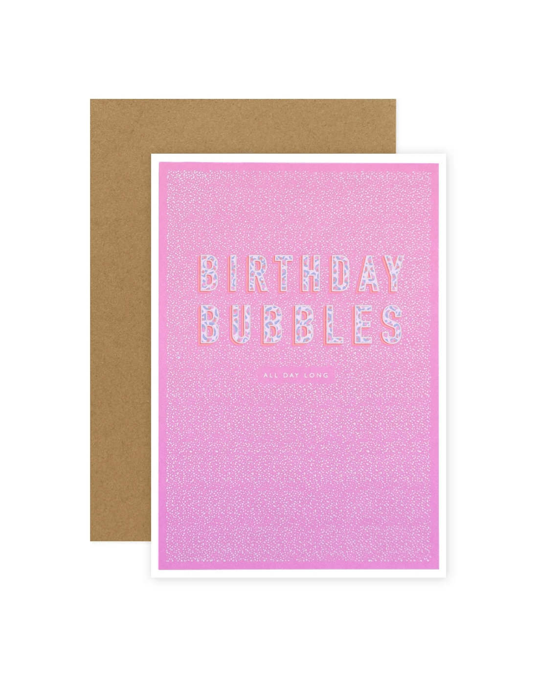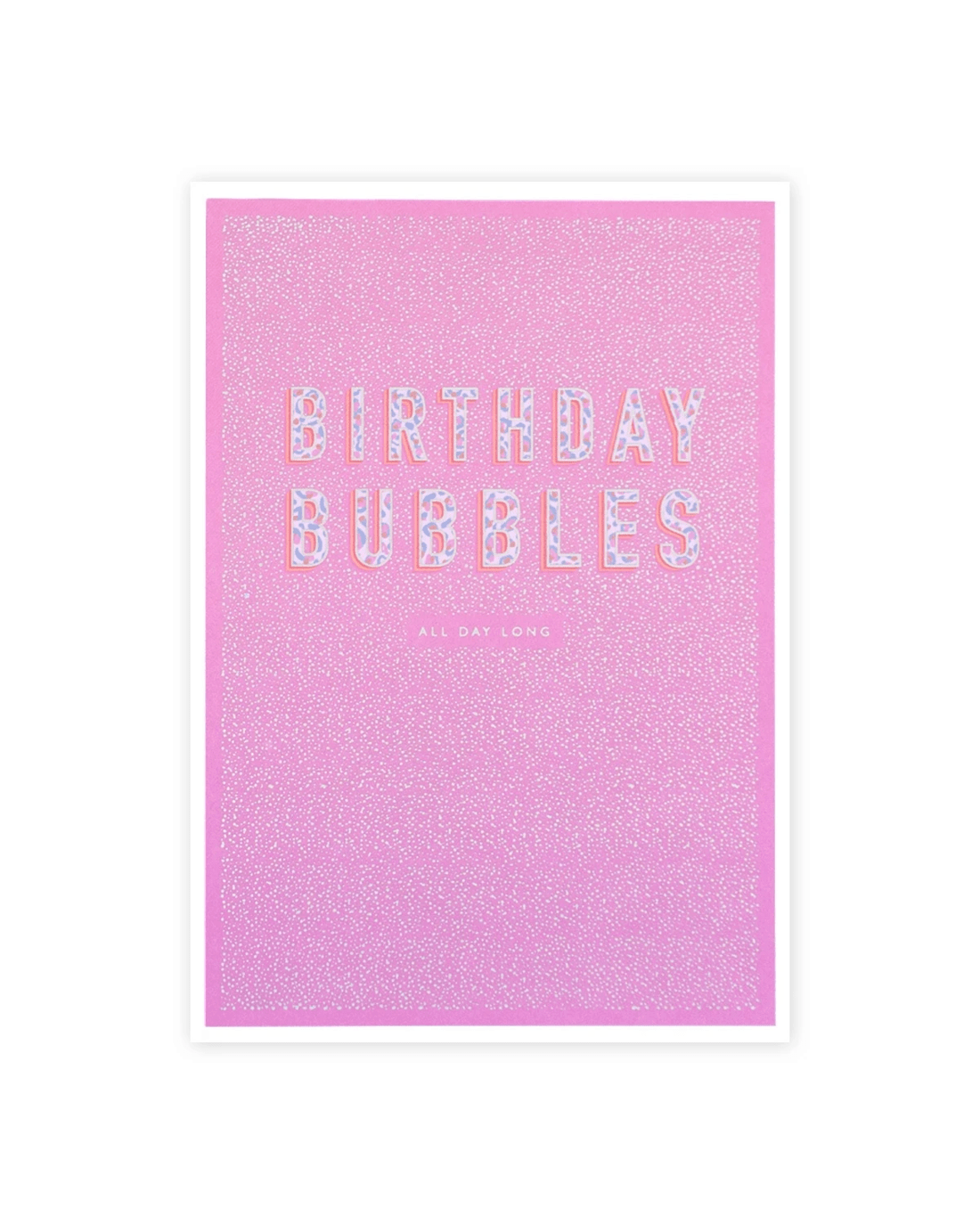 • The front of the card features holographic highlights, illustrations of dots and leopard print, and the message 'BIRTHDAY BUBBLES ALL DAY LONG'