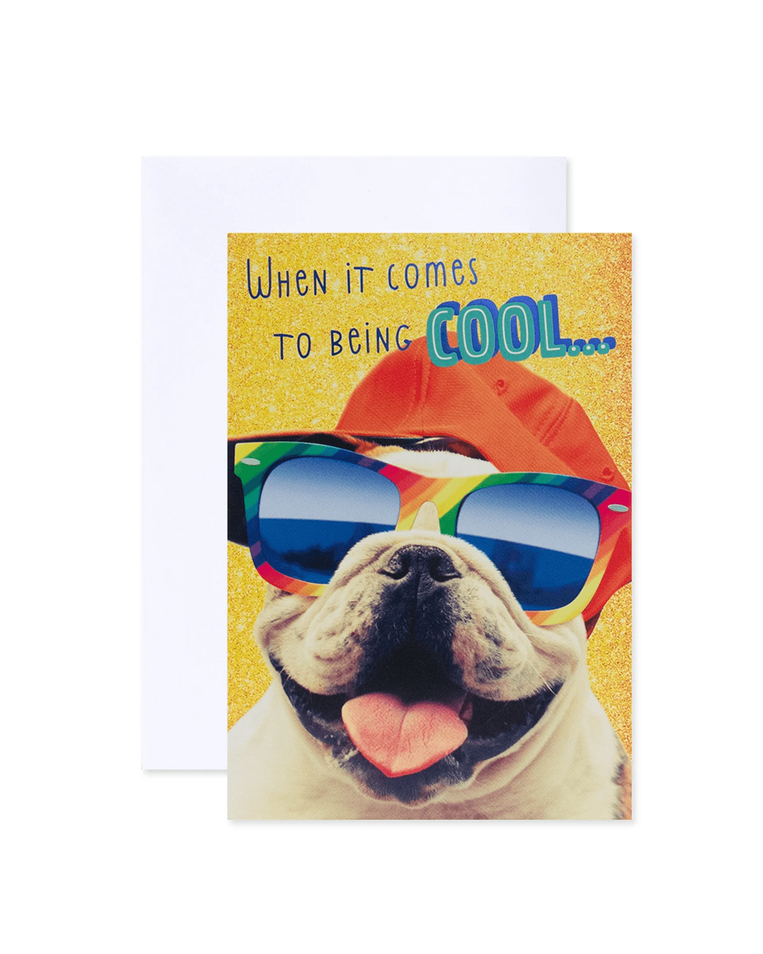 • Front of card features a photographic dog with sunglasses and cap with the message: 'When it comes to being cool… '