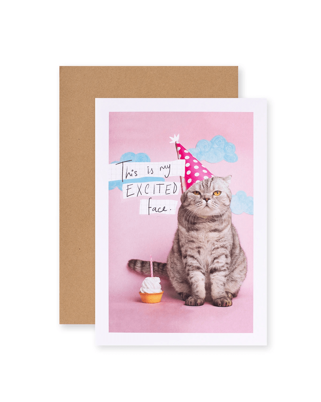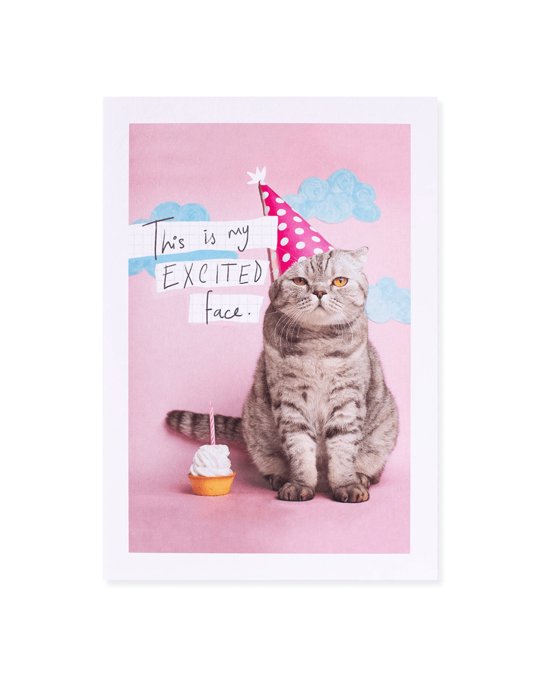 • Front of card features a photographic cat in a party hat and message reads: 'This is my EXCITED face'