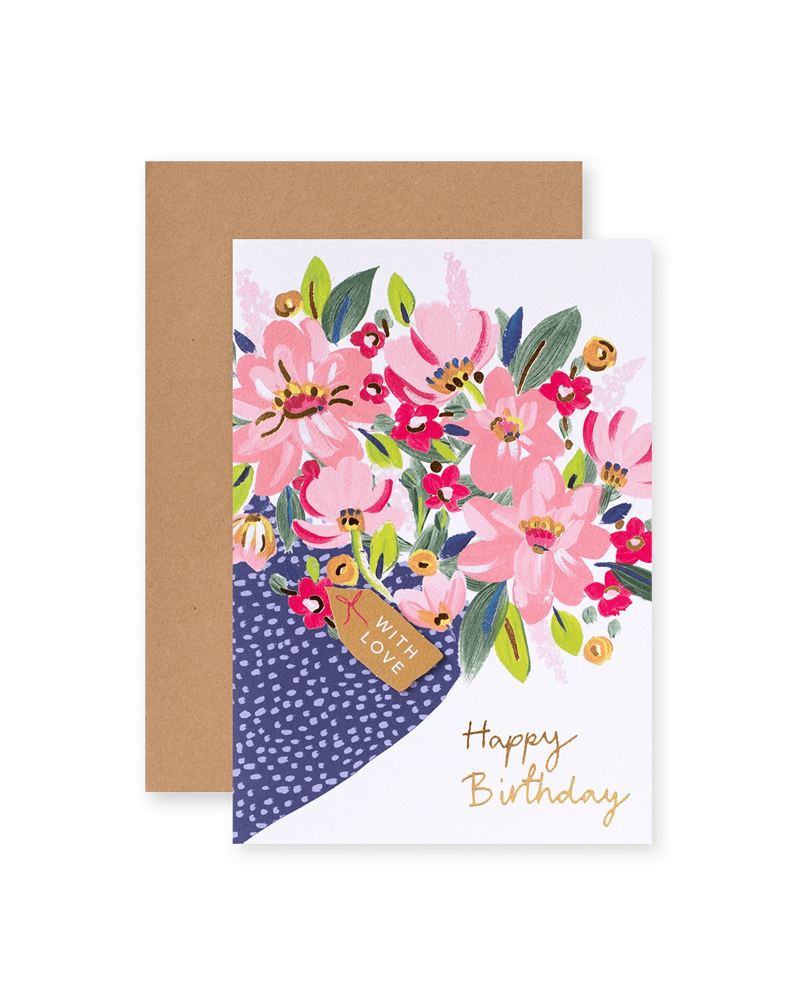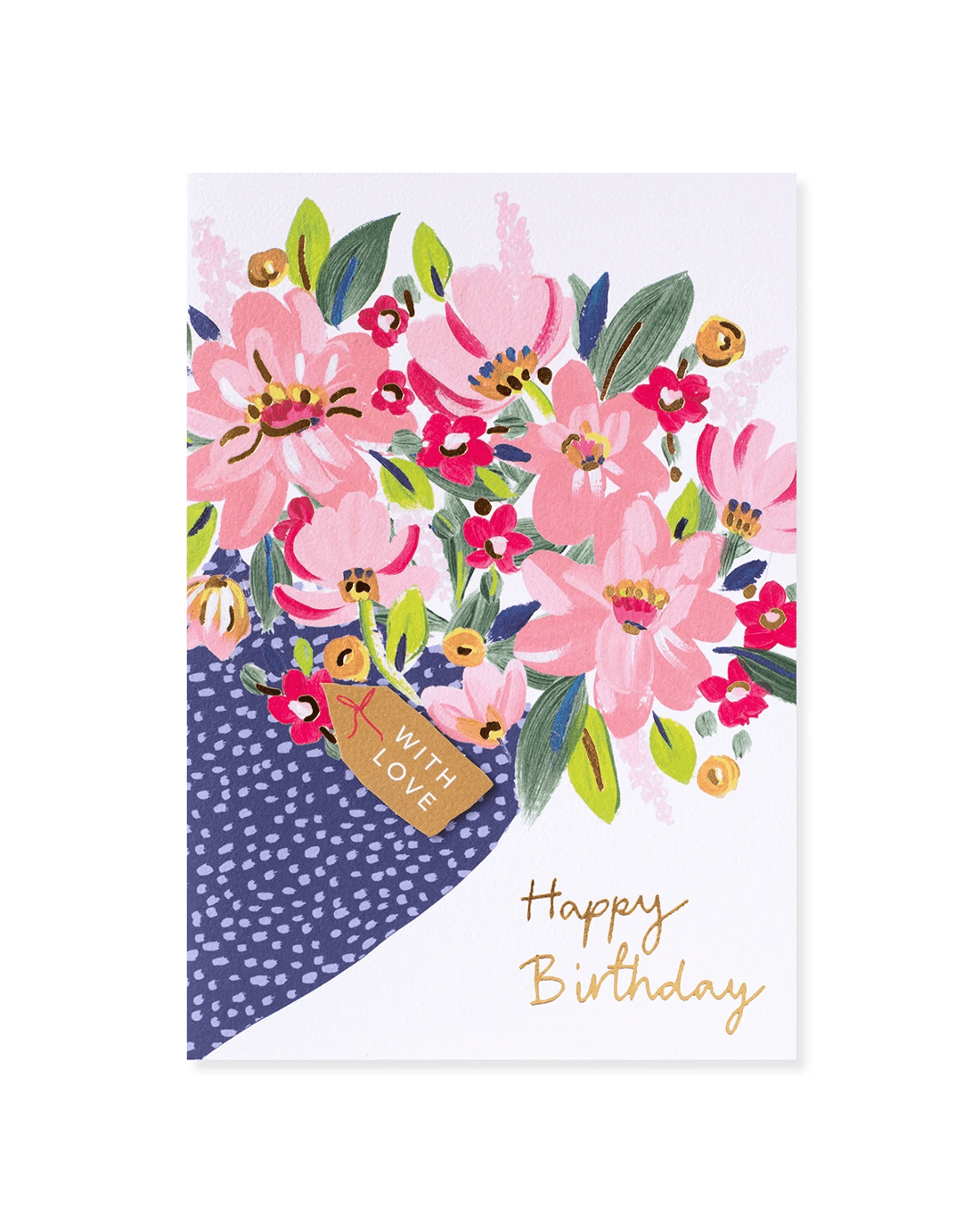 • Front of card features gold foil detailing, tip-on beautiful floral illustration on textured stock with the message 'With love, Happy Birthday'