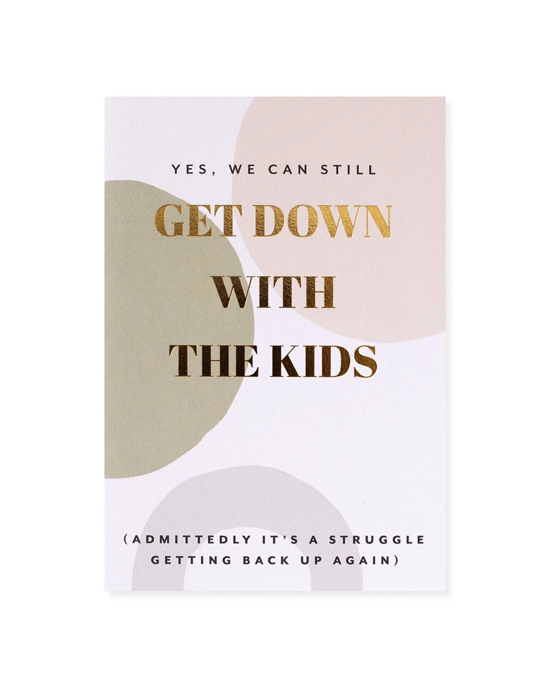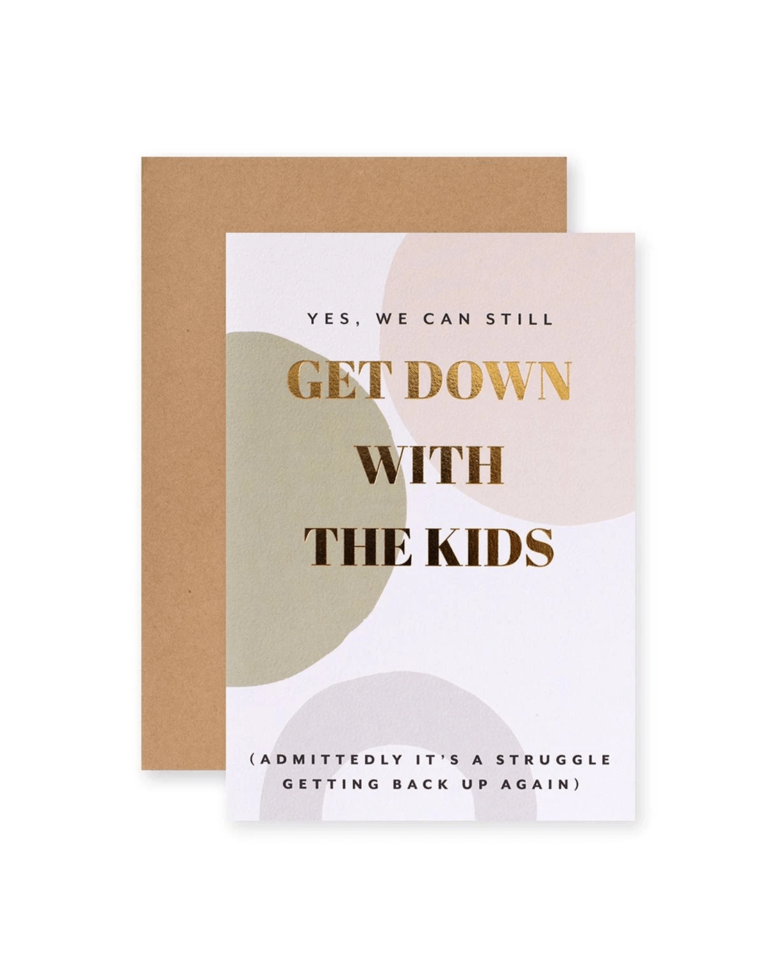 • Front of card features a contemporary pattern with a gold foiled message reading 'Yes, we can still get down with the kids (admittedly it's a struggle getting back up again)'
