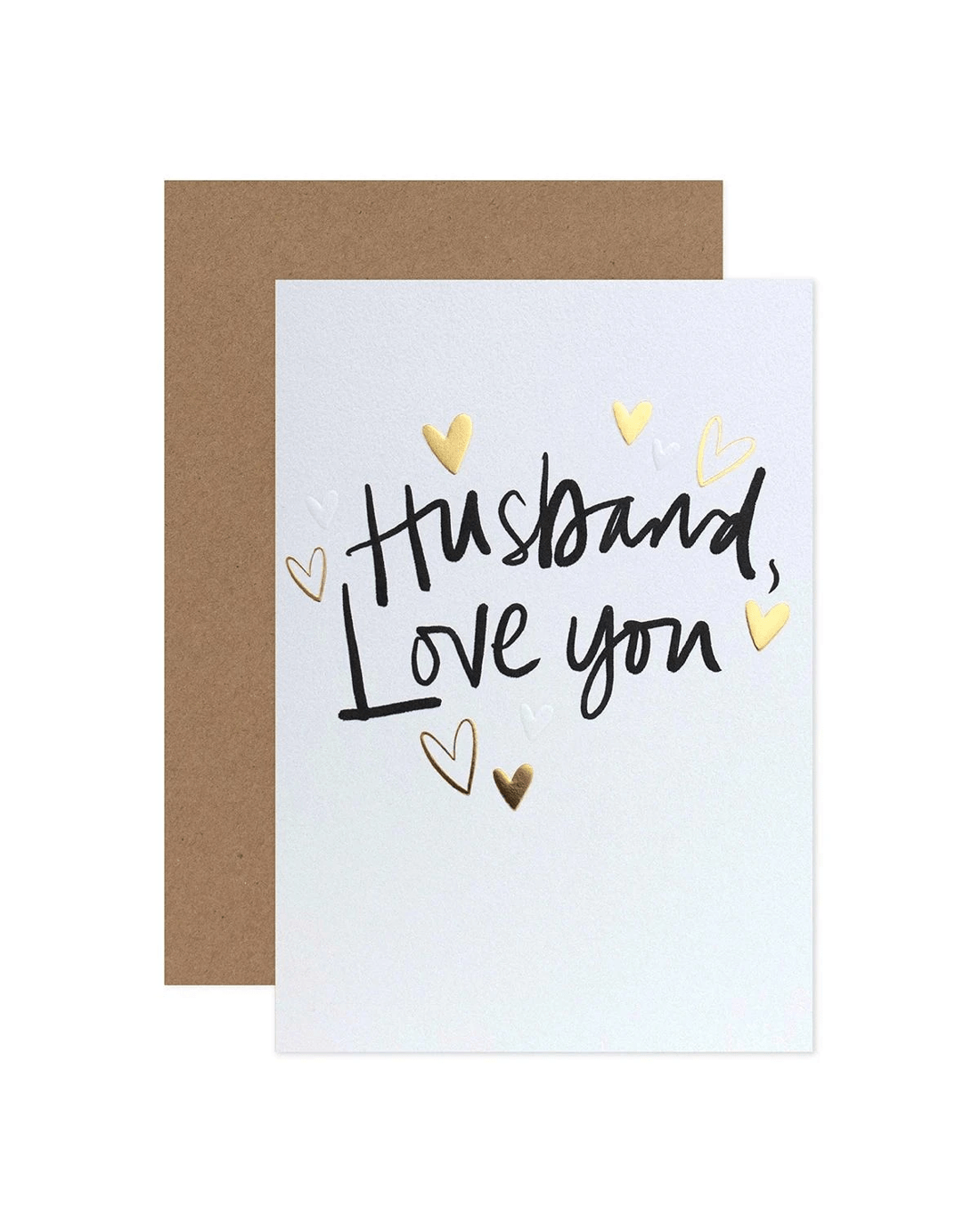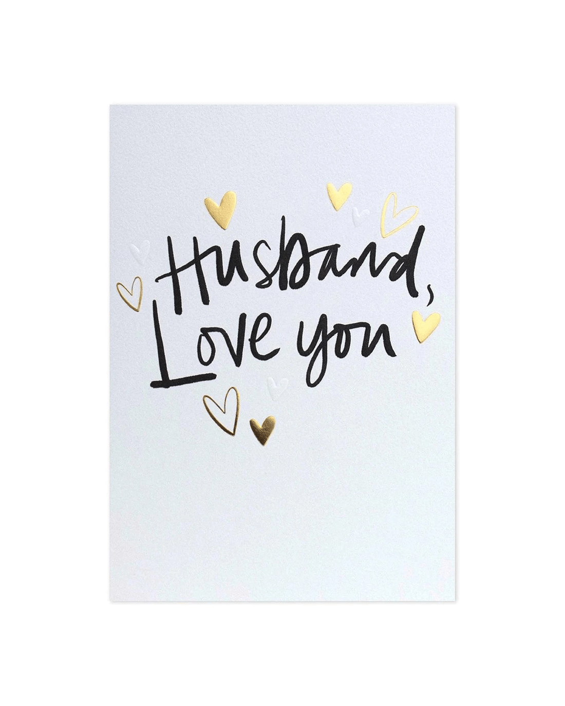 • Front of card features gold foil hearts on a white textured stock with the message: 'Husband, Love You.'