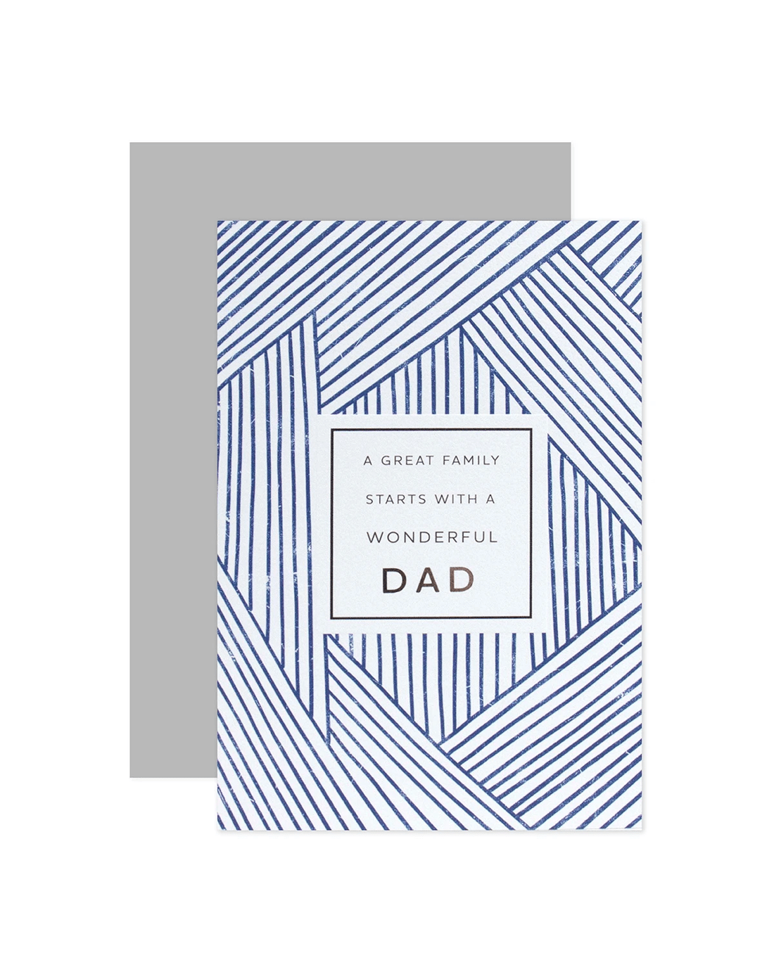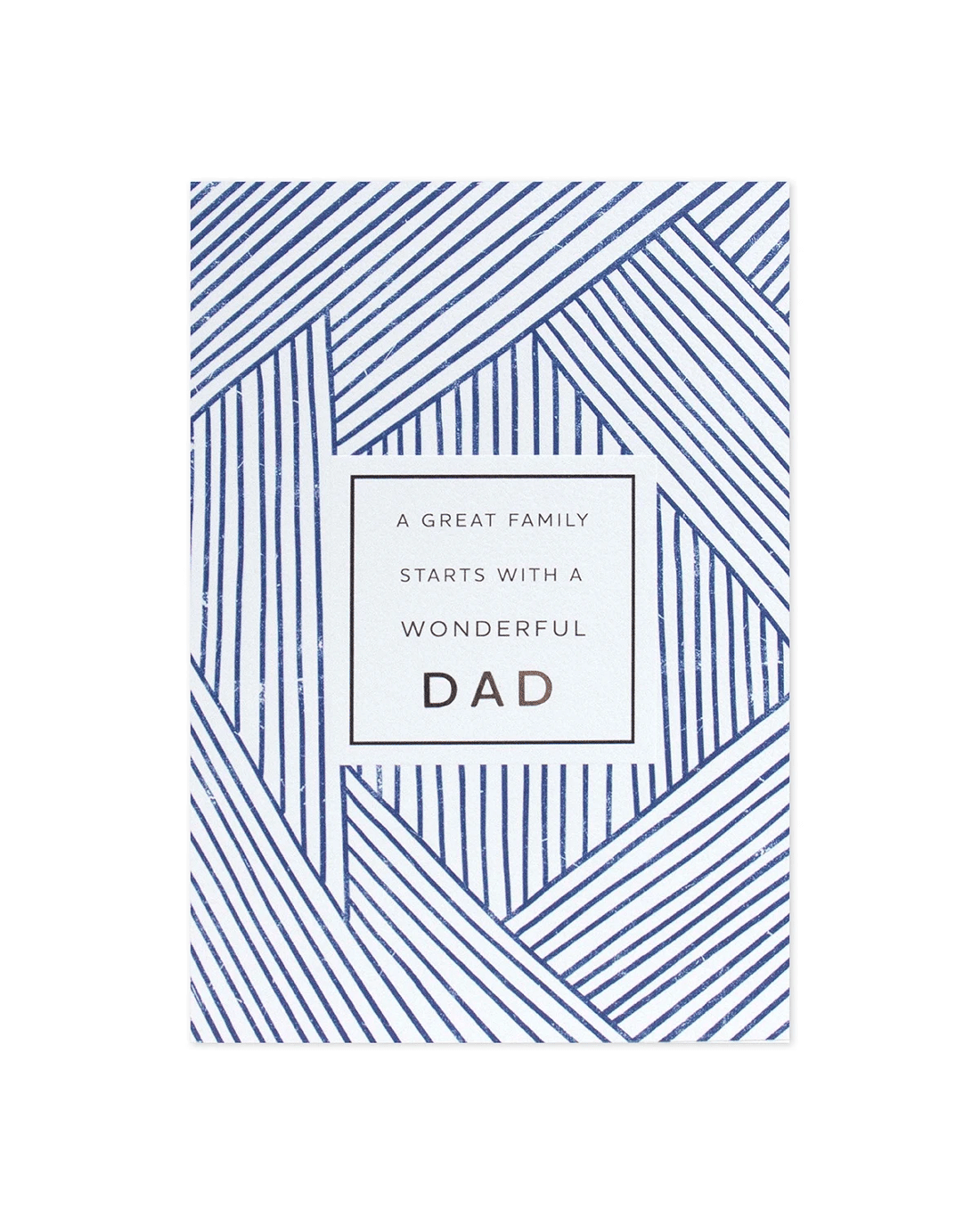 • Front of card features silver foil detail on an embossed textured stock with the message: A great family starts with a wonderful Dad