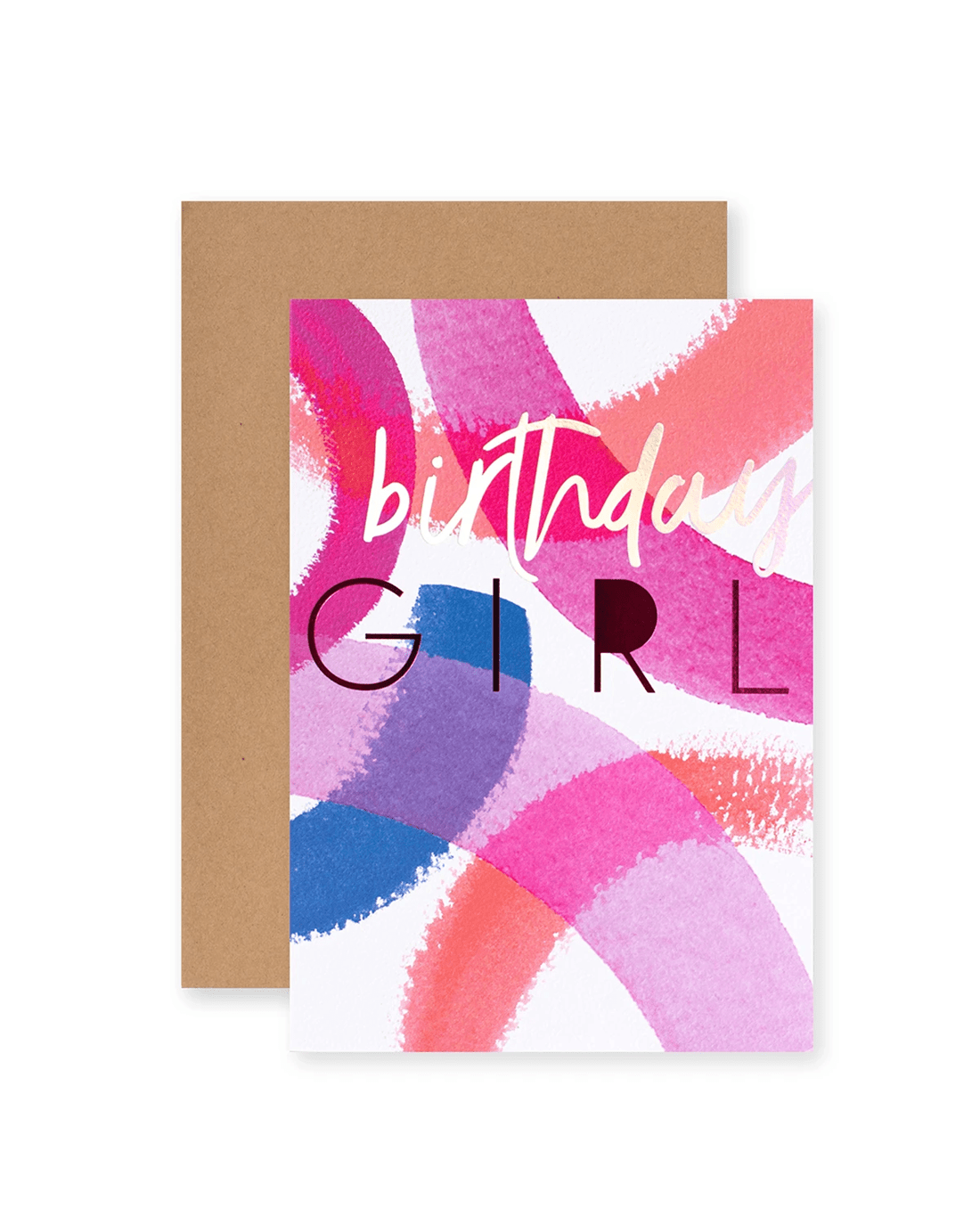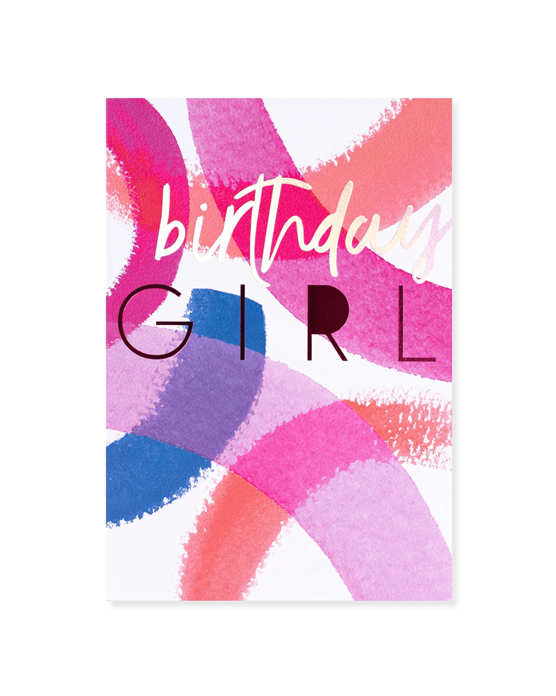• Front of card features watercolour brushstrokes of pinks and purples, with a message reading 'Birthday Girl'