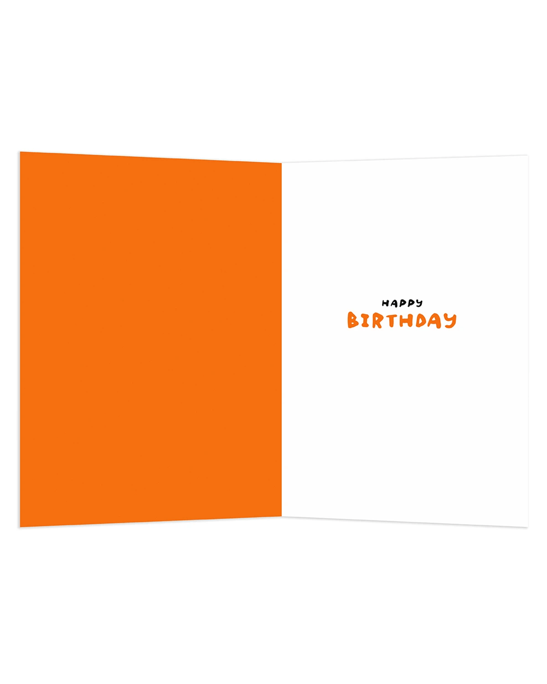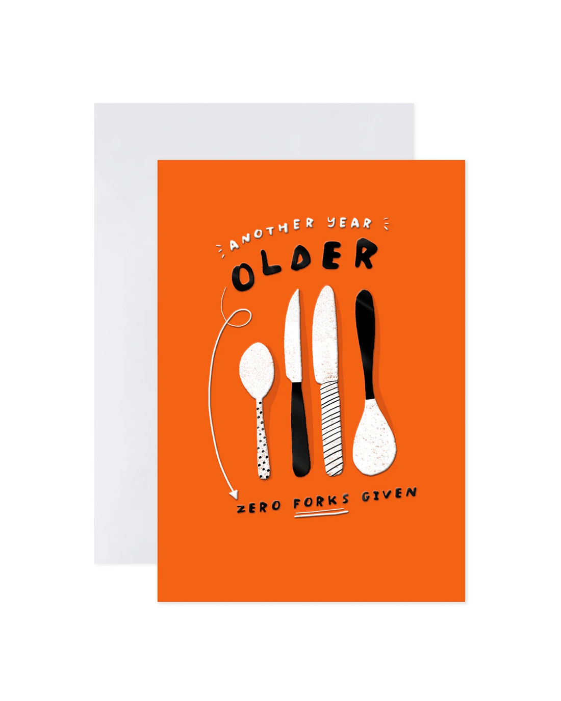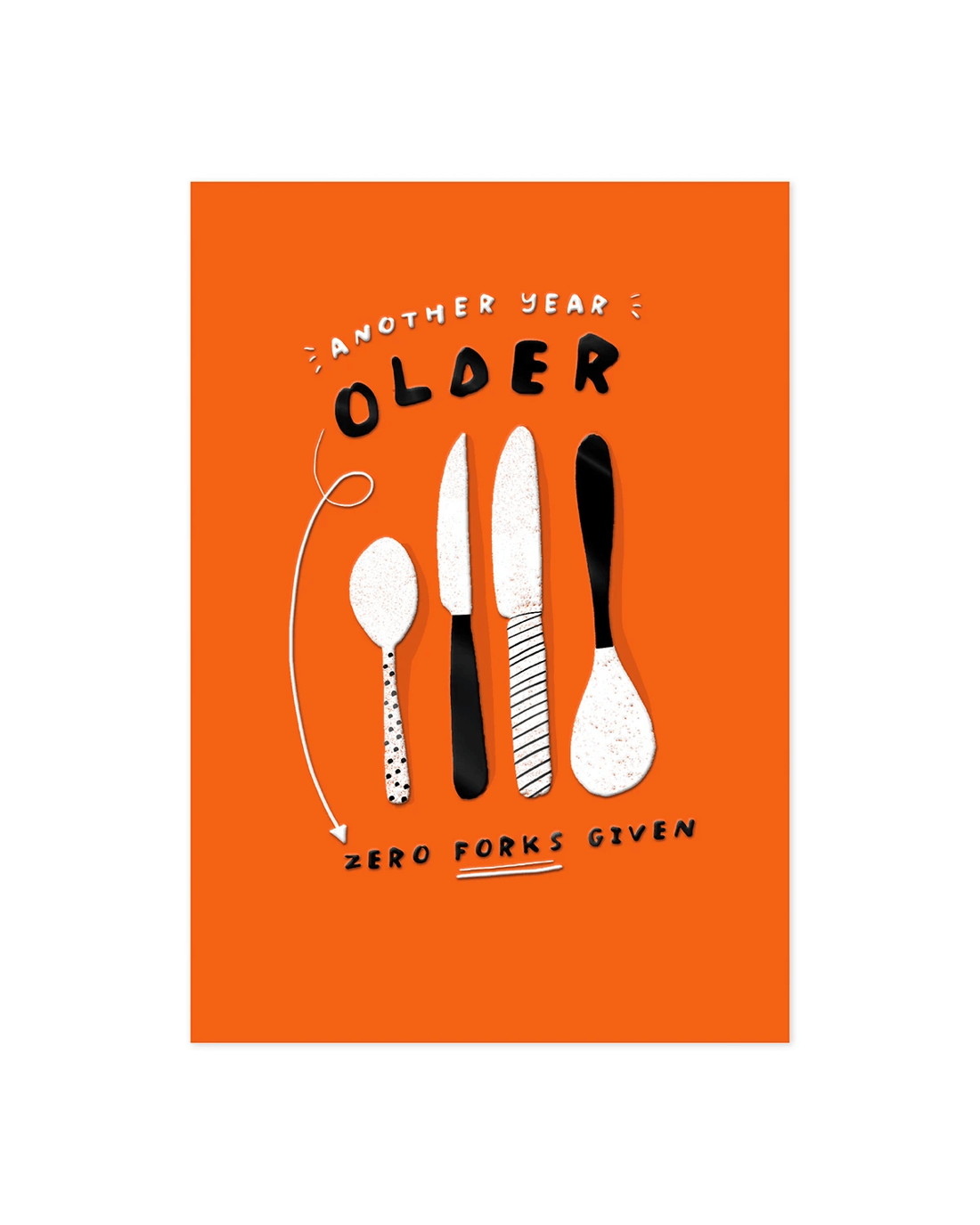 • Front of card features an embossed illustration on a bright orange background with the message: 'Another year older. Zero forks given'