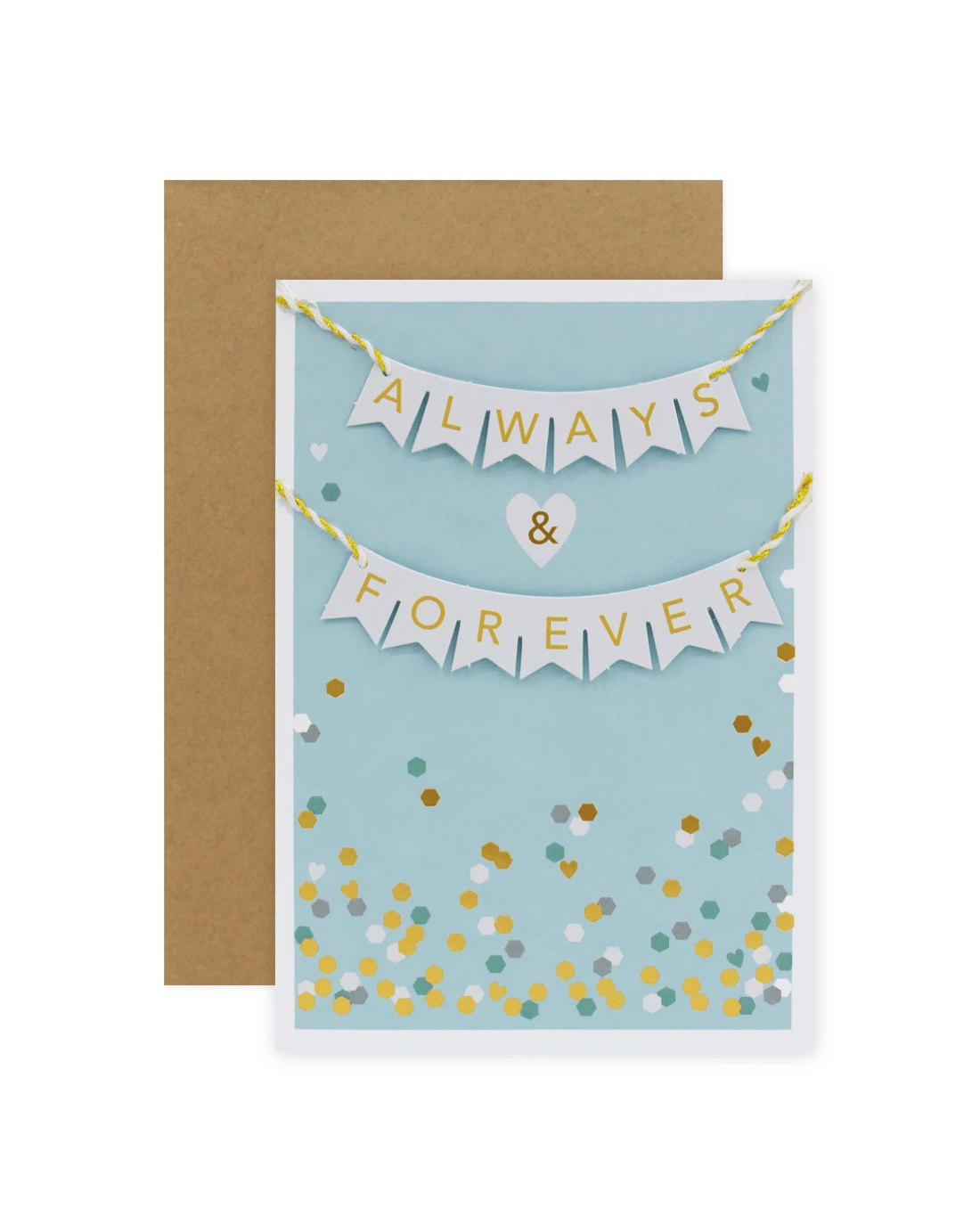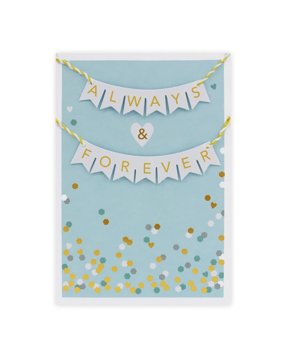 • The front of the card features gold foil highlights, embossed elements, 3D paper die-cut plaques, gold and white string attachments, fun confetti illustrations and the message 'ALWAYS & FOREVER' on paper bunting