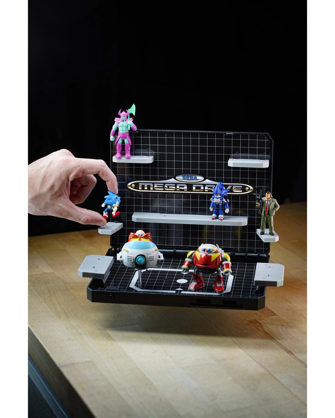 The ultimate collector's centerpiece! The Console Heroes Supervillain Boss Bundle brings retro gaming glory to life in 3D. Styled after the iconic Sega Mega Drive console, it flips open to reveal shelving and gridline deco sticker graphics designed to display Mecha Robotnik, Mecha Sonic, Mr. X, and Death Bringer, with room to showcase the rest of your Console Heroes collection. It also includes the exclusive Sonic the Hedgehog 1 diorama cartridge, recreating Sonic's battle with Eggman's Eggmobile in Labyrinth Zone—only available in this bundle. Close the console and slot any cartridge into the top for a classic retro look. To keep everything organized, a large cartridge storage tray (holds up to 6 cartridges) is included. This bundle is the must-have foundation for building your full Sega world. Ages 8 +