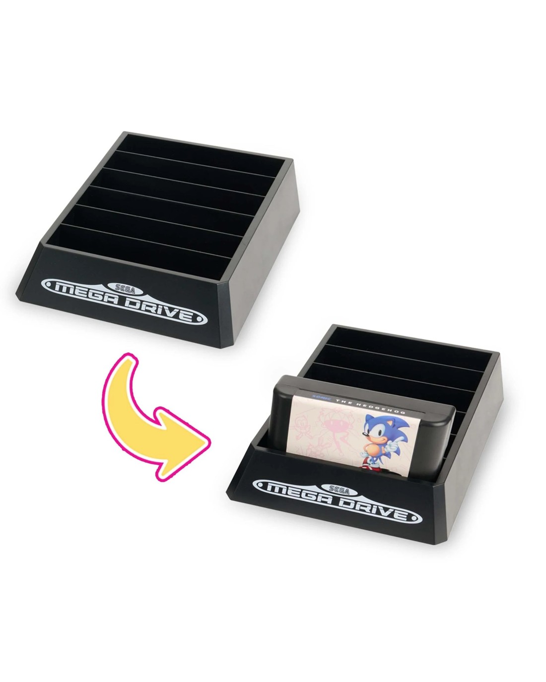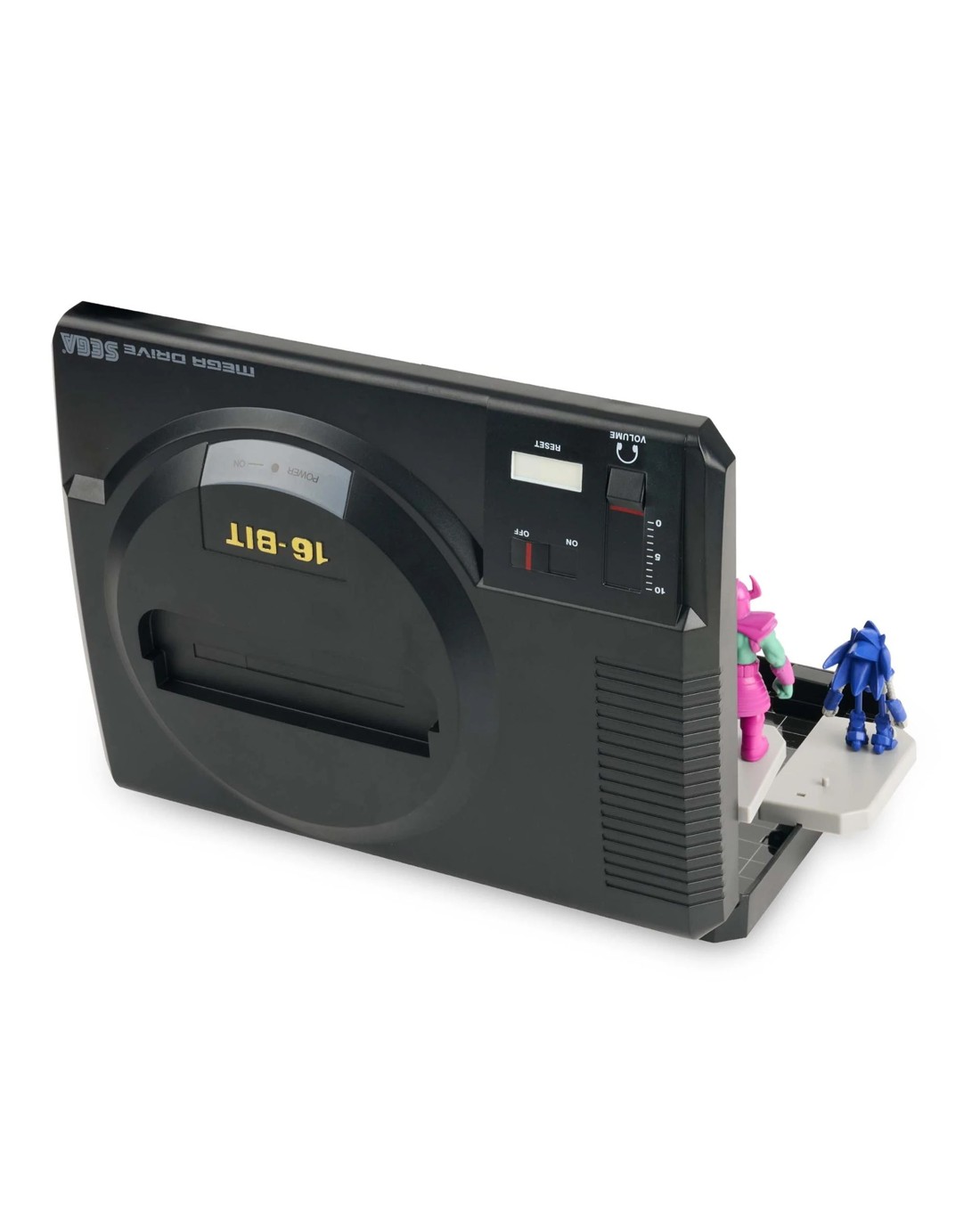 - Styled after the legendary Sega Mega Drive console, with authentic deco sticker gridlines and shelving for display.