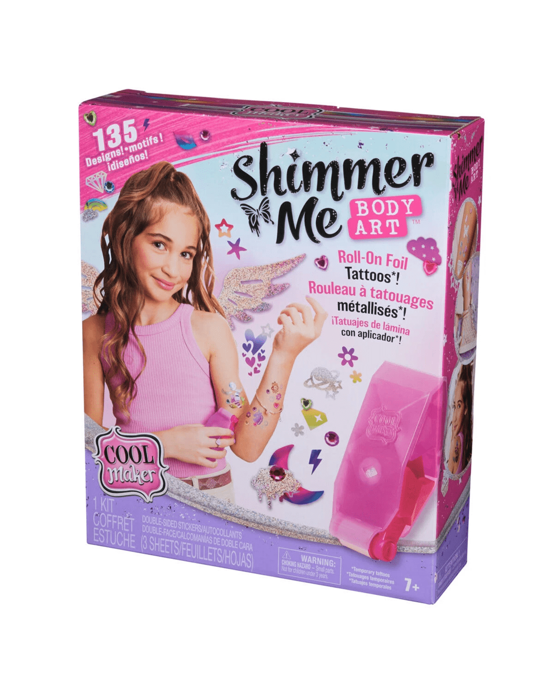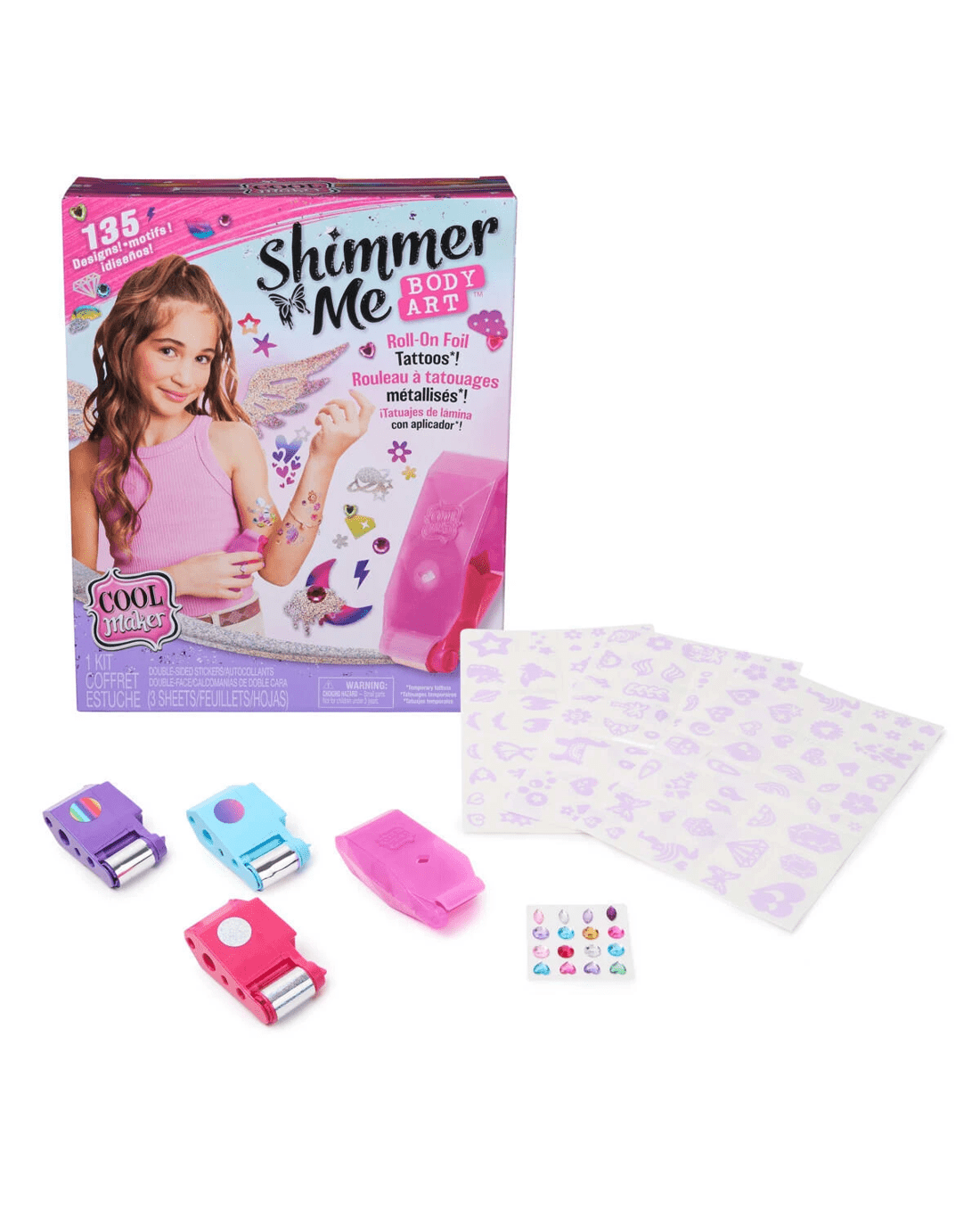 Design fab foil tattoos with Cool Maker Shimmer Me Body Art! This kids temporary tattoos kit will inspire creativity and build confidence as girls express their style, creating their own temporary body art. Featuring 135 trendy and cute double-sided sticker designs, 3 foils, jewels and an easy-to-use roller, kids can mix and match to style their body art, their way! Applying these temporary tattoos for kids is a breeze: clean the area to apply the tattoo, pop a vibrant foil - silver, purple/pink gradient or rainbow - in the roller and place the sticker designs on the skin. Peel the clear top layer and glide the roller over the sticker, revealing the metallic foil design! Girls can customise with colorful jewels and mix and match foils for one-of-a-kind looks! Each foil has 46 inches to style, roll and reveal again and again. For more ways to create with Cool Maker, look for the GO GLAM Nail Studio (sold separately). Whether you're looking for birthday gifts for girls, an art kit, kids crafts or exciting kids activities for sleepovers, spa days, back-to-school, rainy days or anytime, Cool Maker Shimmer Me Body Art is a welcome addition to the DIY fun!