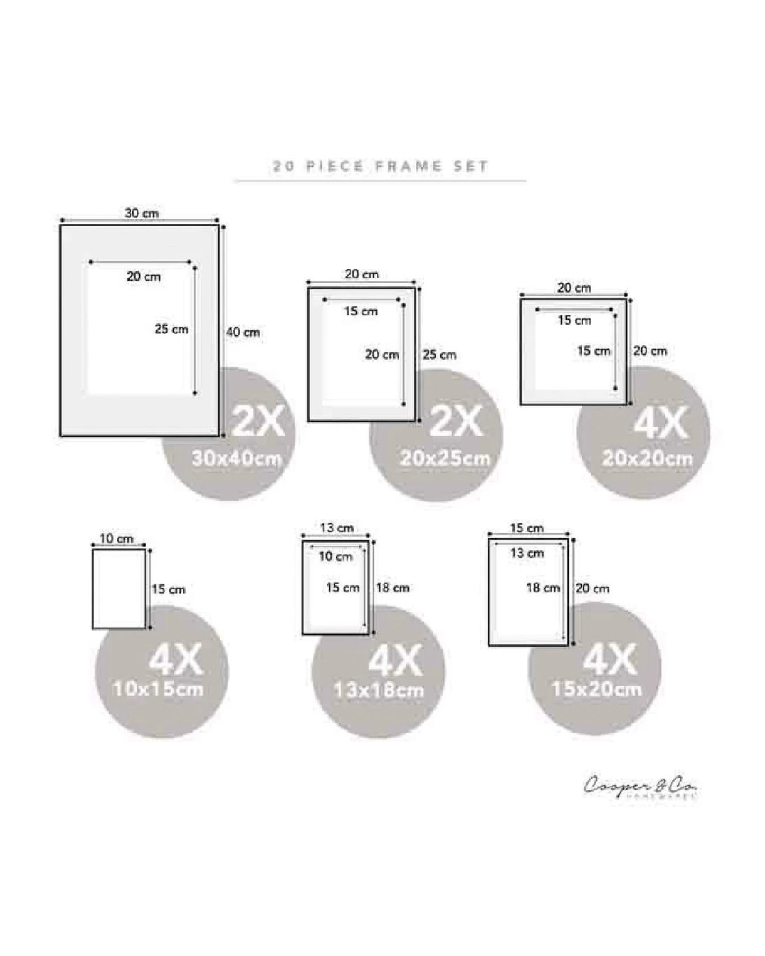 - This set includes: 4x 10 x 15 cm frames, 4x 13 x 18 cm mats (10 x 15 cm frame), 4x 15 x 20 cm mats (13 x 18 cm frame), 4x 20 x 20cm mats (15 x 15 cm frame), 2x 20 x 25 cm mats (15 x 20 cm frame), 2x 30 x 40 cm mats (20 x 25 cm frame).