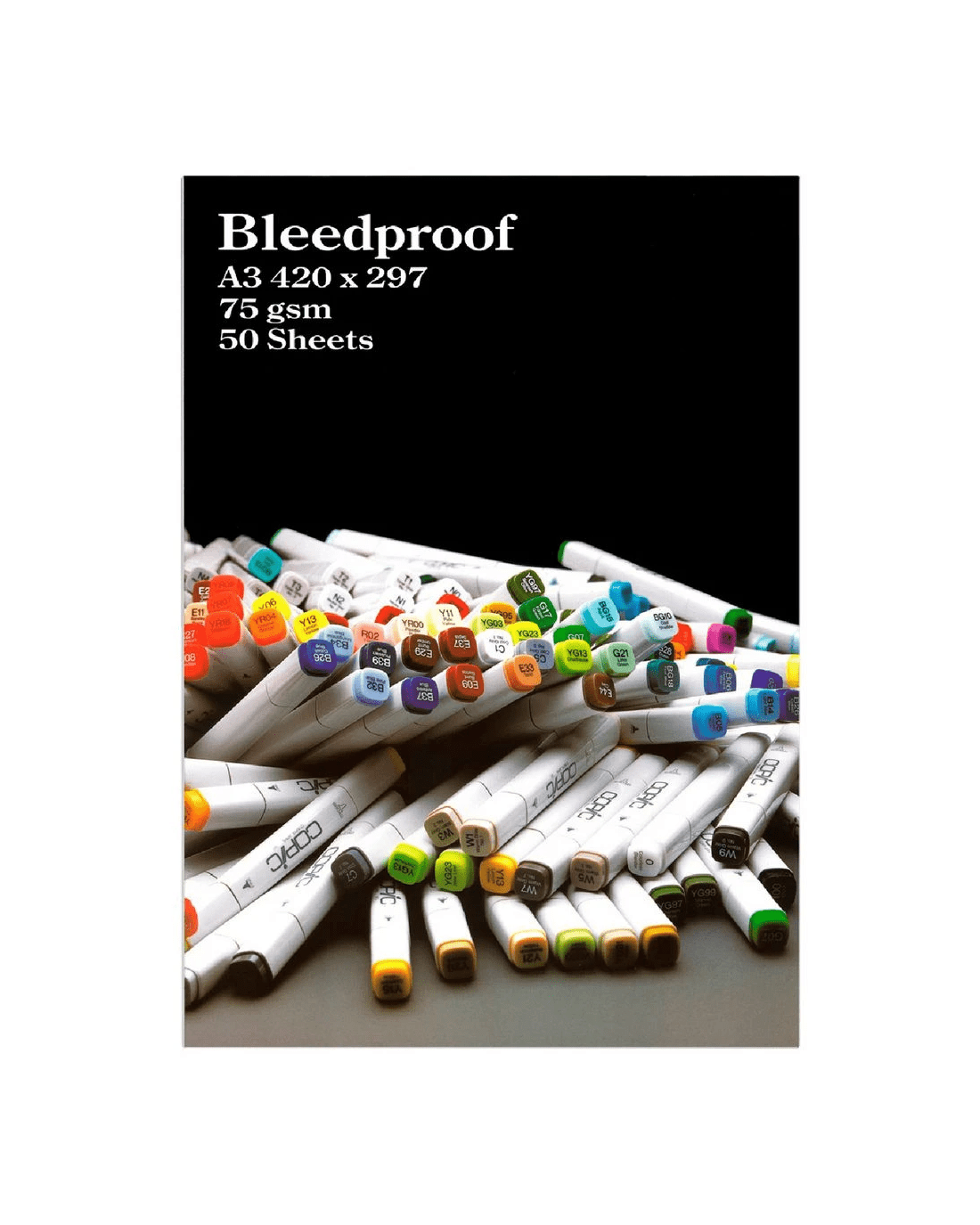 This Copic A3 Bleedproof Pad contains 50 sheets of paper which is perfect for use with pens, pencils and markers. The 75 gsm paper has been specially treated to ensure that alcohol markers lines will remain crisp and sharp.