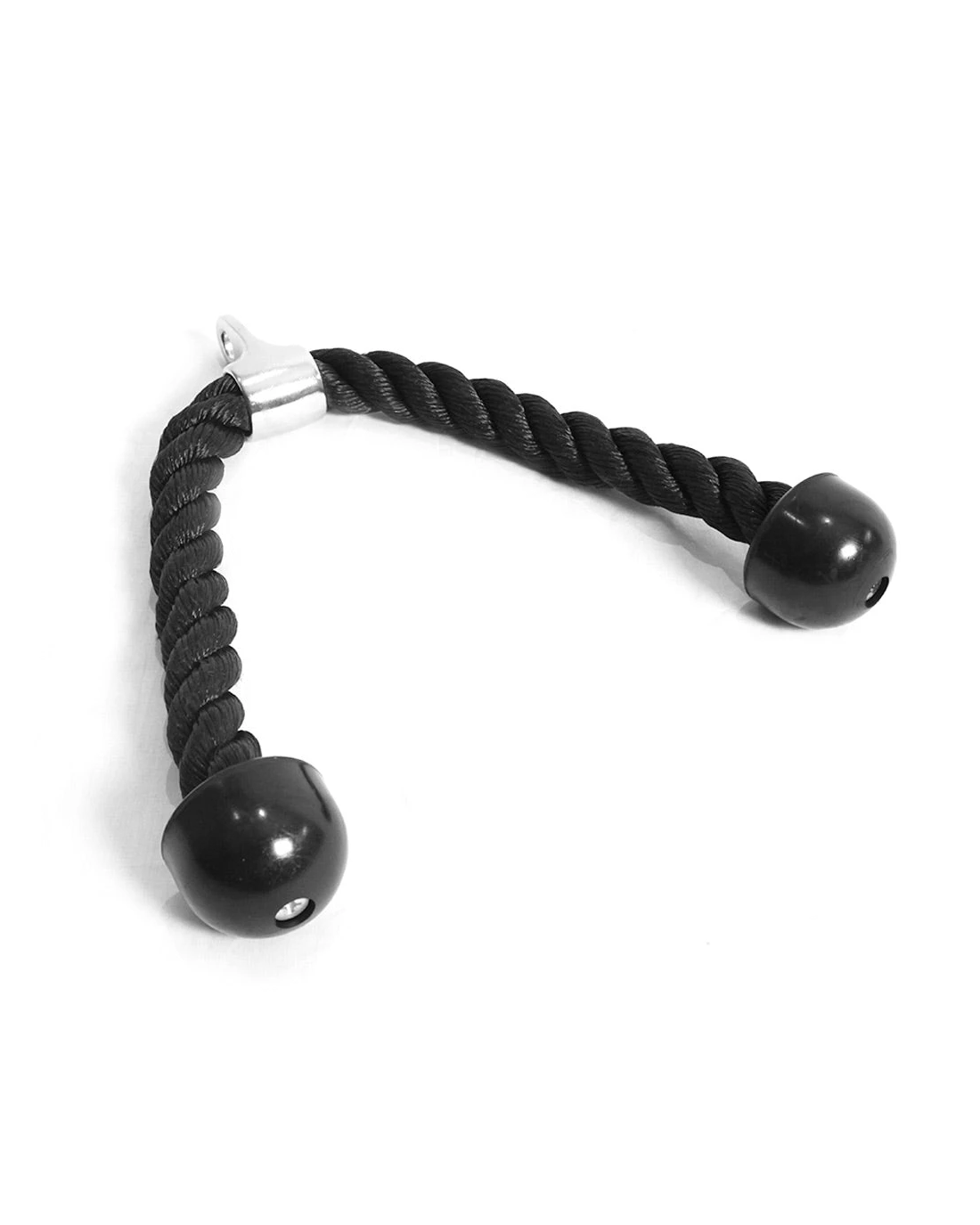 Made out of heavy duty coated nylon that is 1.25" in diameter. 26" in length Custom engineered ball grips provide a stronger grip Rope is supported by forged steel grommet that hooks into any universal gym system.