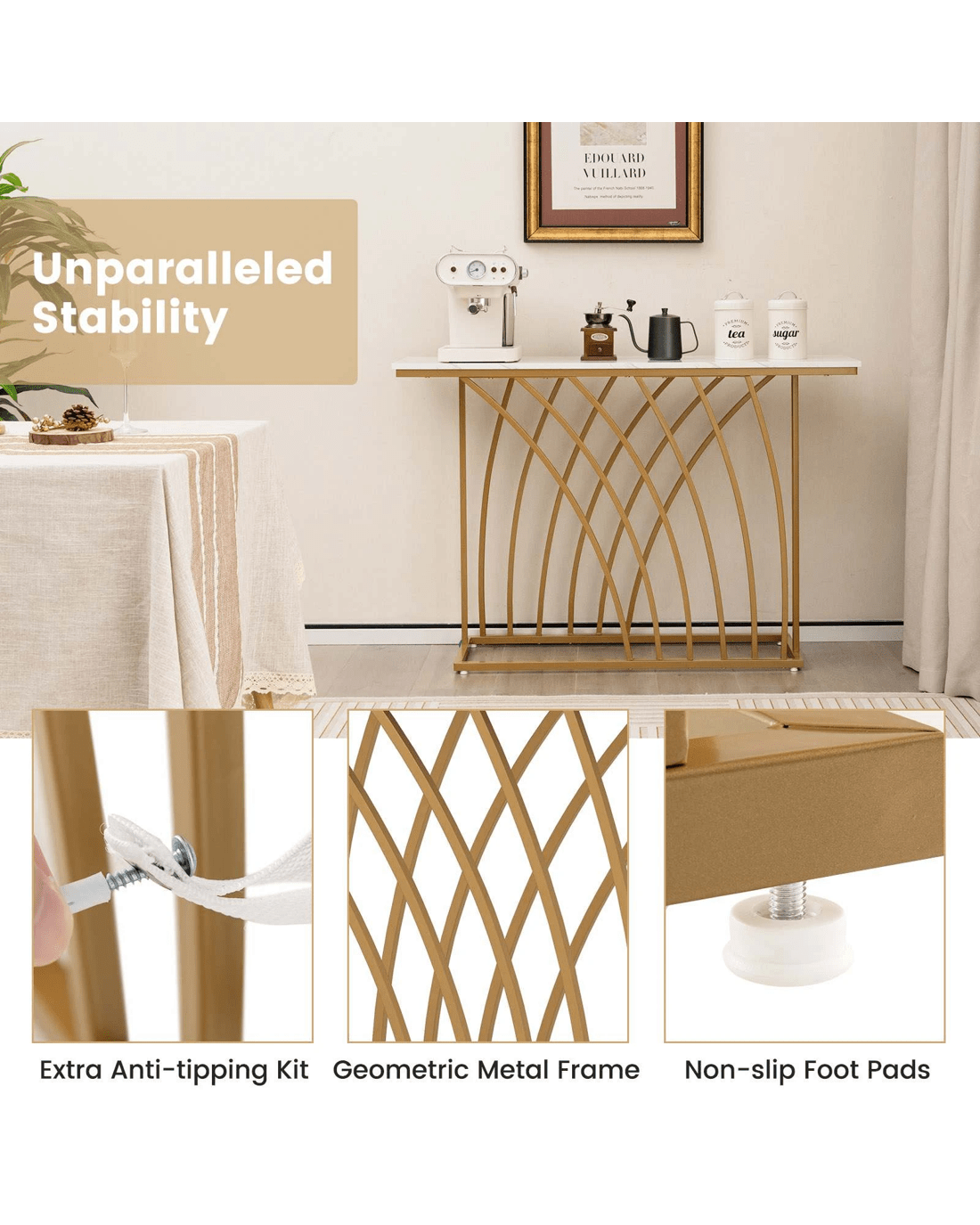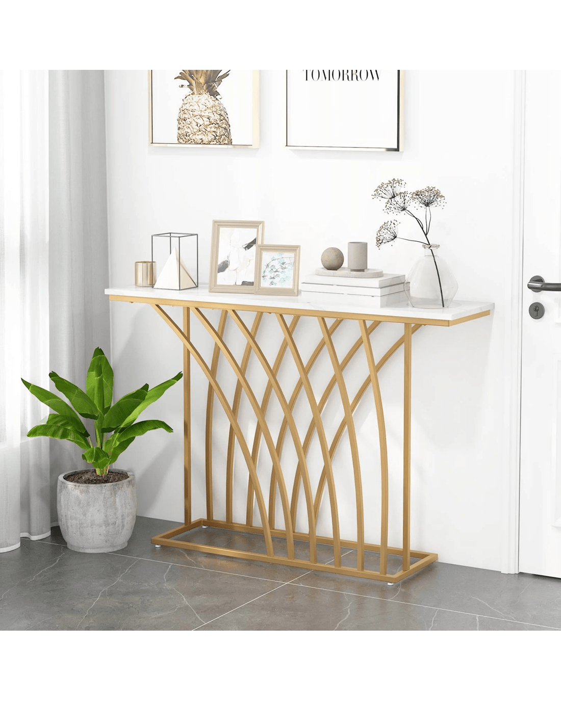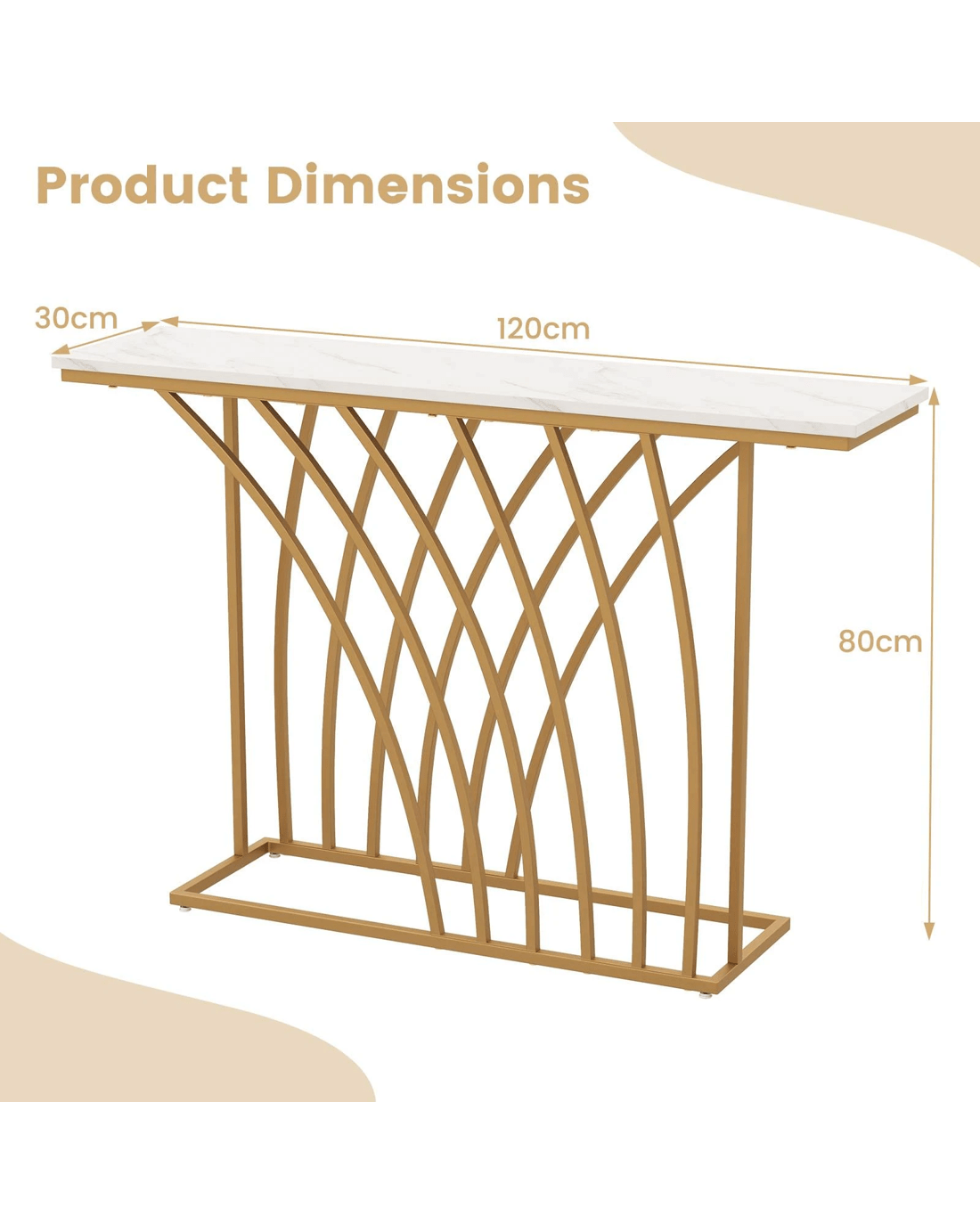 The console table with 120 x 30 cm large tabletop offers ample space for gathering odds and ends in one place. Featuring a sturdy golden metal frame and faux marble board, the console table ensures both durability and aesthetics. Additionally, the entryway table is thoughtfully fitted with anti-tipping device and non-slip foot pads to keep the table well-balanced. This gold console table is versatile to work anywhere in your home: entry table for hallway, couch table for living room bedroom, modern storage bookshelf for home office.
