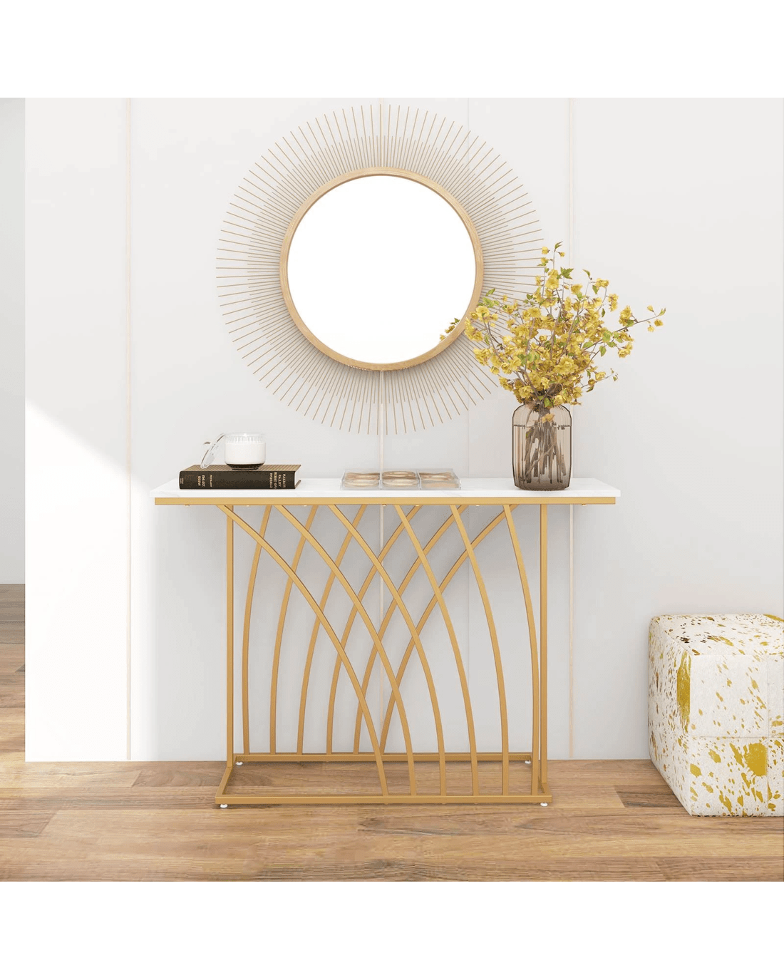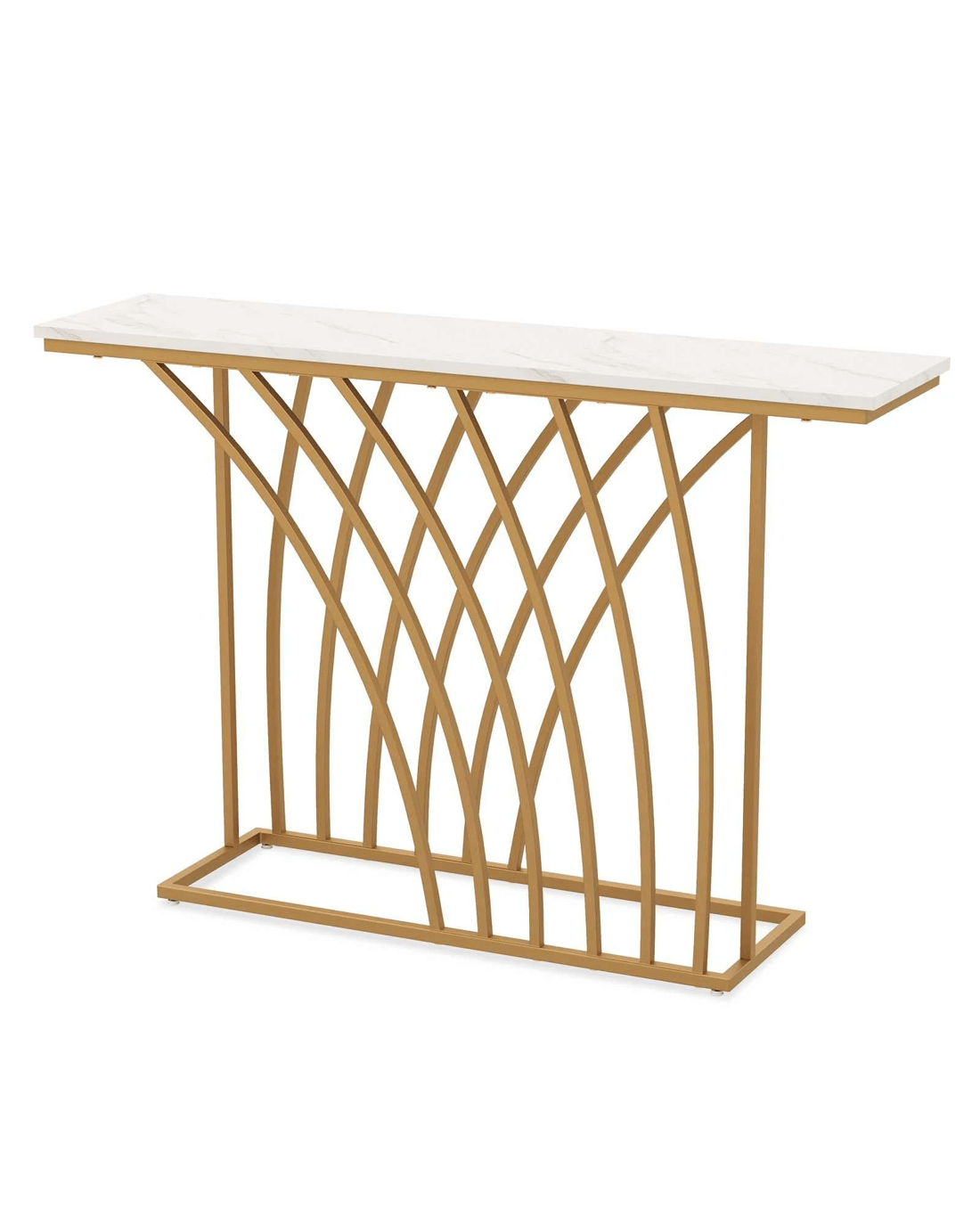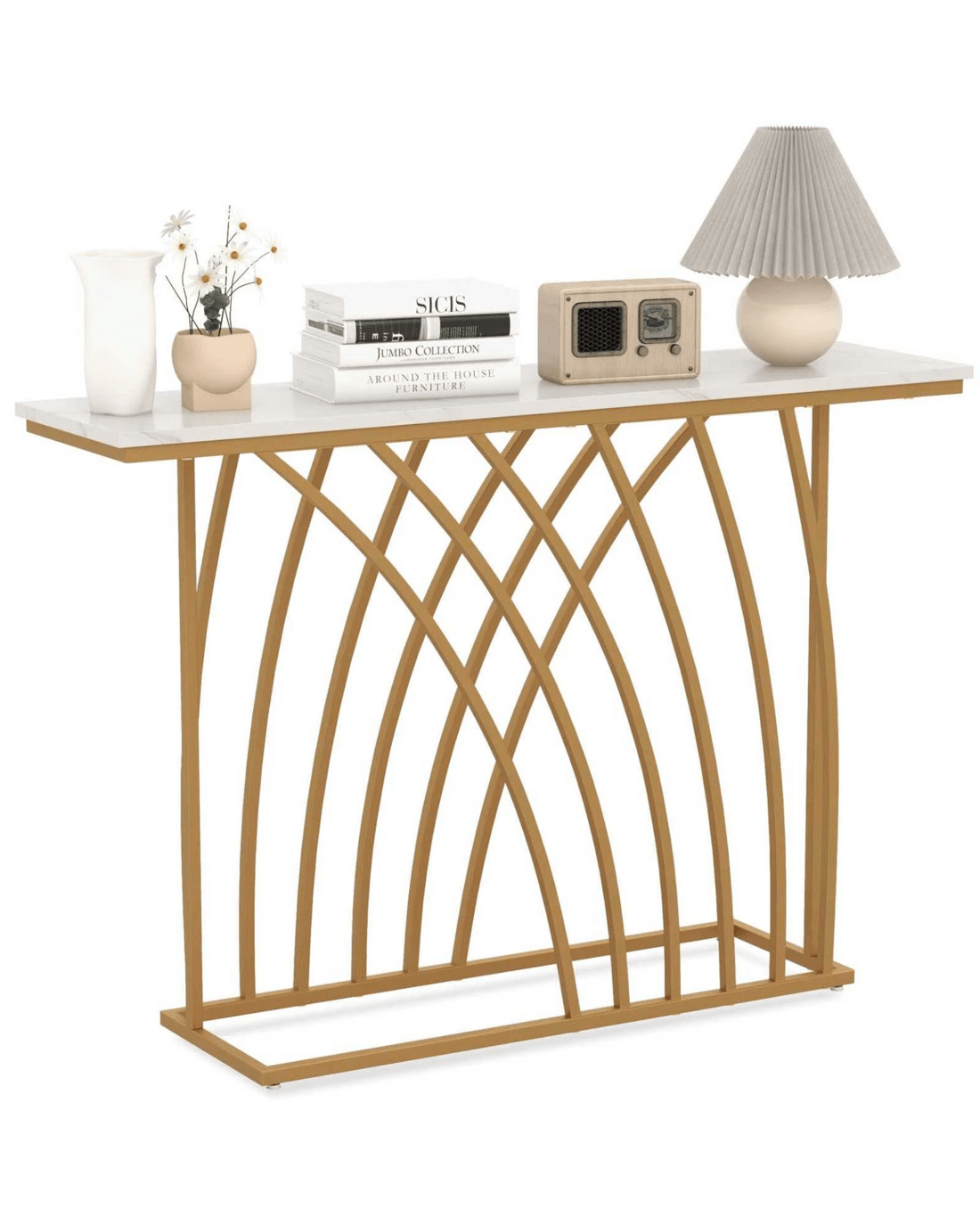 The console table with 120 x 30 cm large tabletop offers ample space for gathering odds and ends in one place. Featuring a sturdy golden metal frame and faux marble board, the console table ensures both durability and aesthetics. Additionally, the entryway table is thoughtfully fitted with anti-tipping device and non-slip foot pads to keep the table well-balanced. This gold console table is versatile to work anywhere in your home: entry table for hallway, couch table for living room bedroom, modern storage bookshelf for home office.