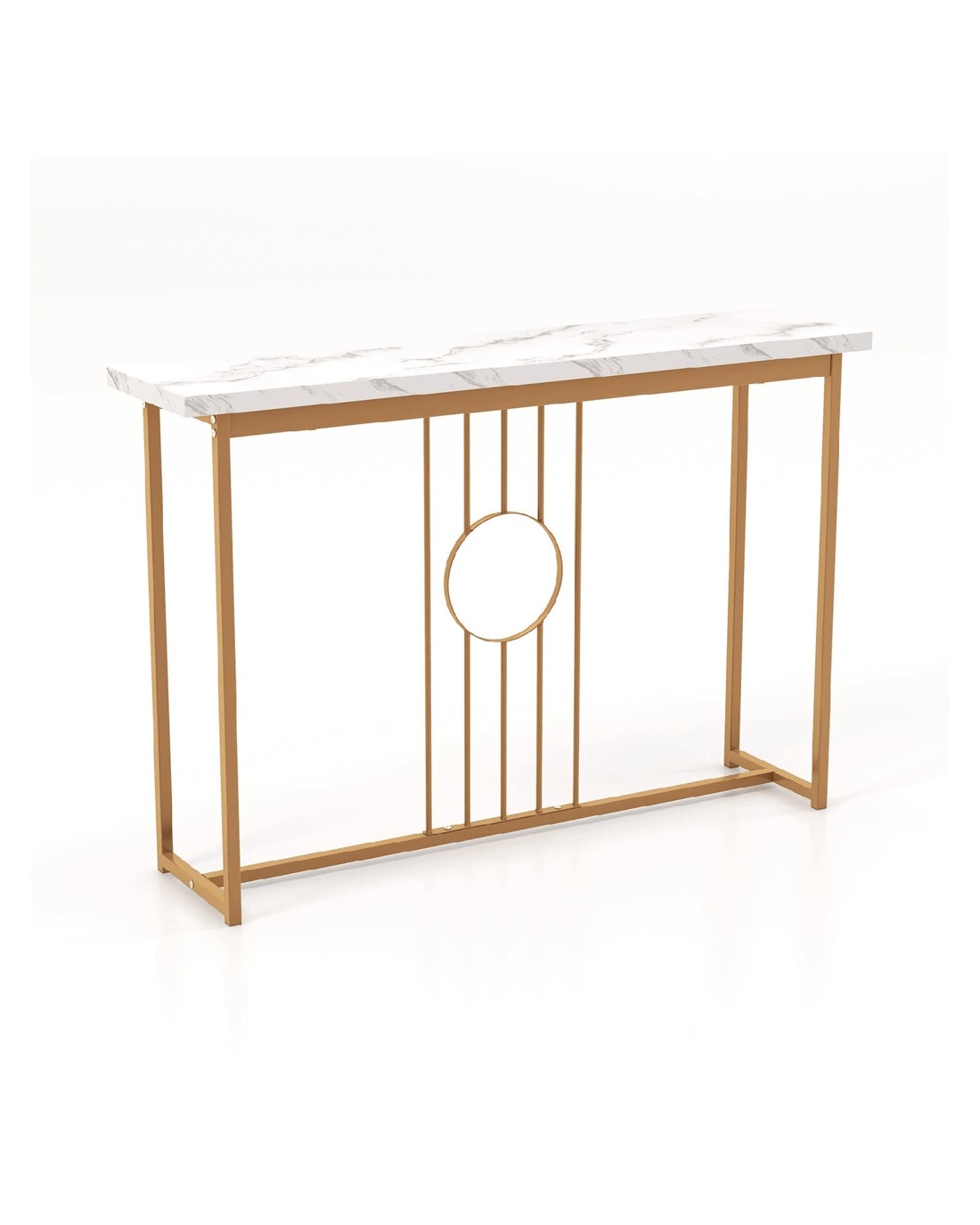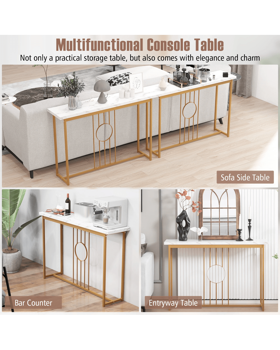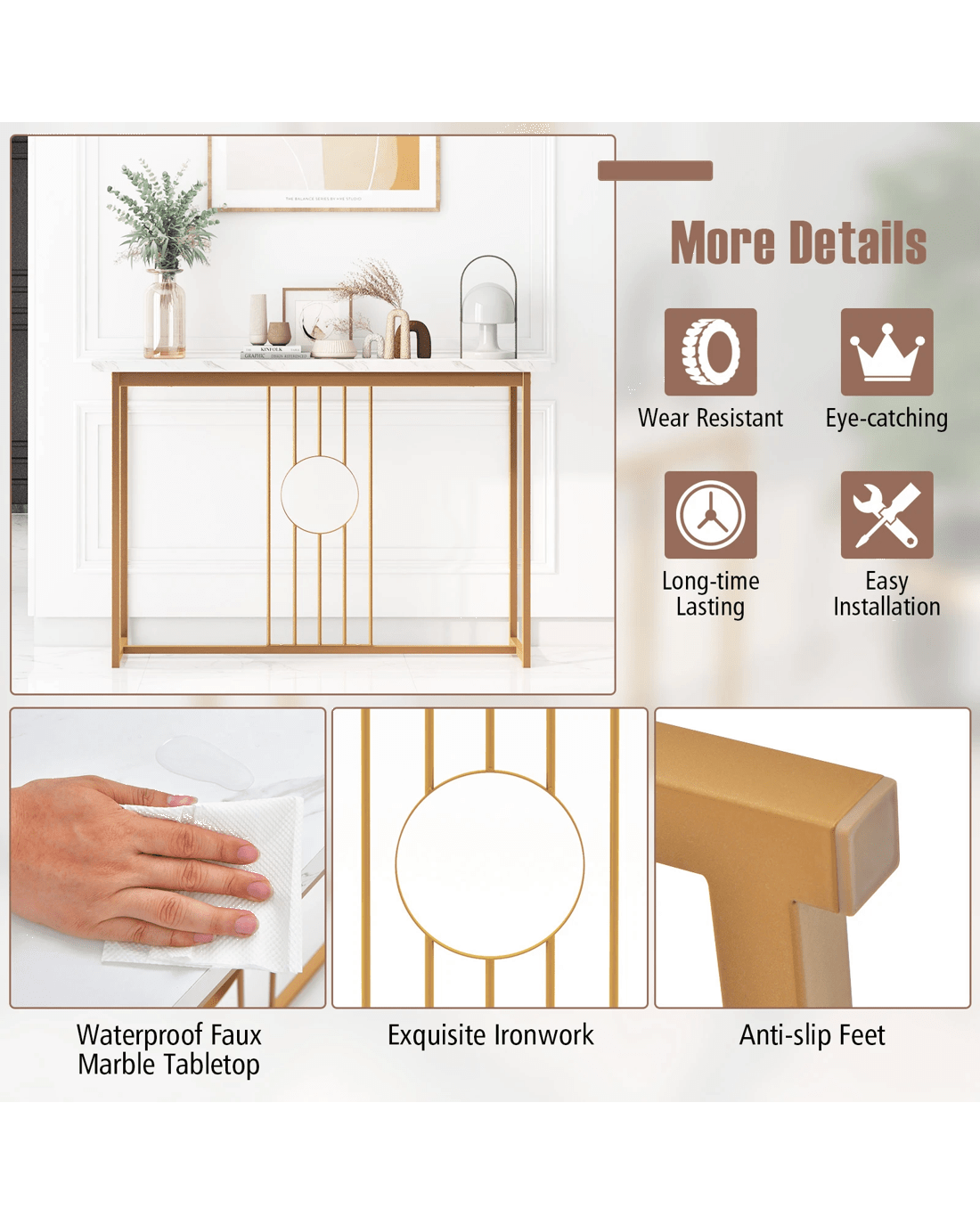 Boasting a water-proof faux marble tabletop and elegant gold metal legs, this table exudes sophistication and charm. The spacious tabletop provides ample room for displaying decor items like photo frames, models, or flowers, adding a personal touch to your space. Crafted with a heavy-duty rustproof metal frame, this table is designed for long-lasting durability. Unique features such as anti-slip feet protect your floors, while intricate ironwork and anti-toppling devices showcase the table's superior craftsmanship. Versatile and multifunctional, this console table can be used as an entryway table, display table, or sofa side table, adapting to your evolving needs. Enhance your home with this blend of contemporary aesthetics and practical versatility for a fresh and refined look.