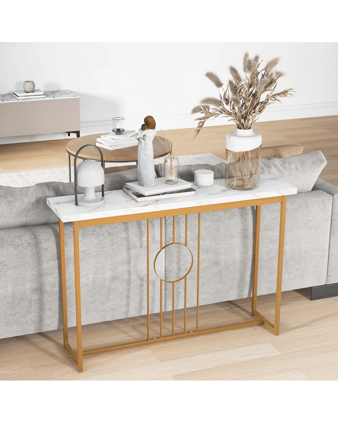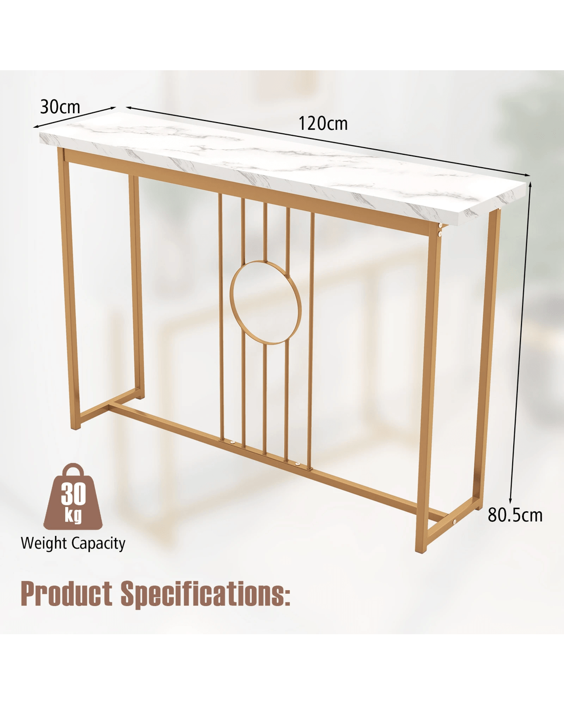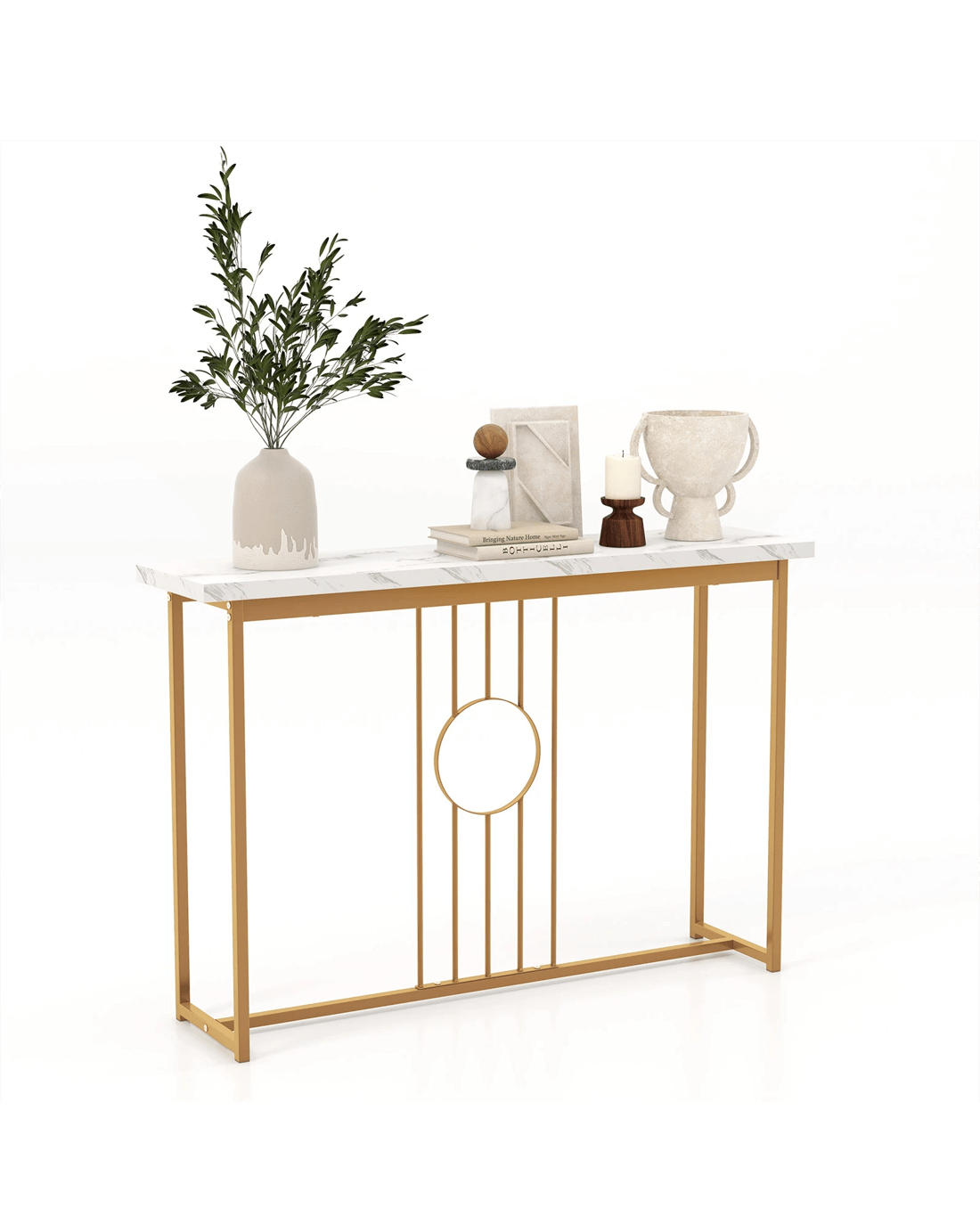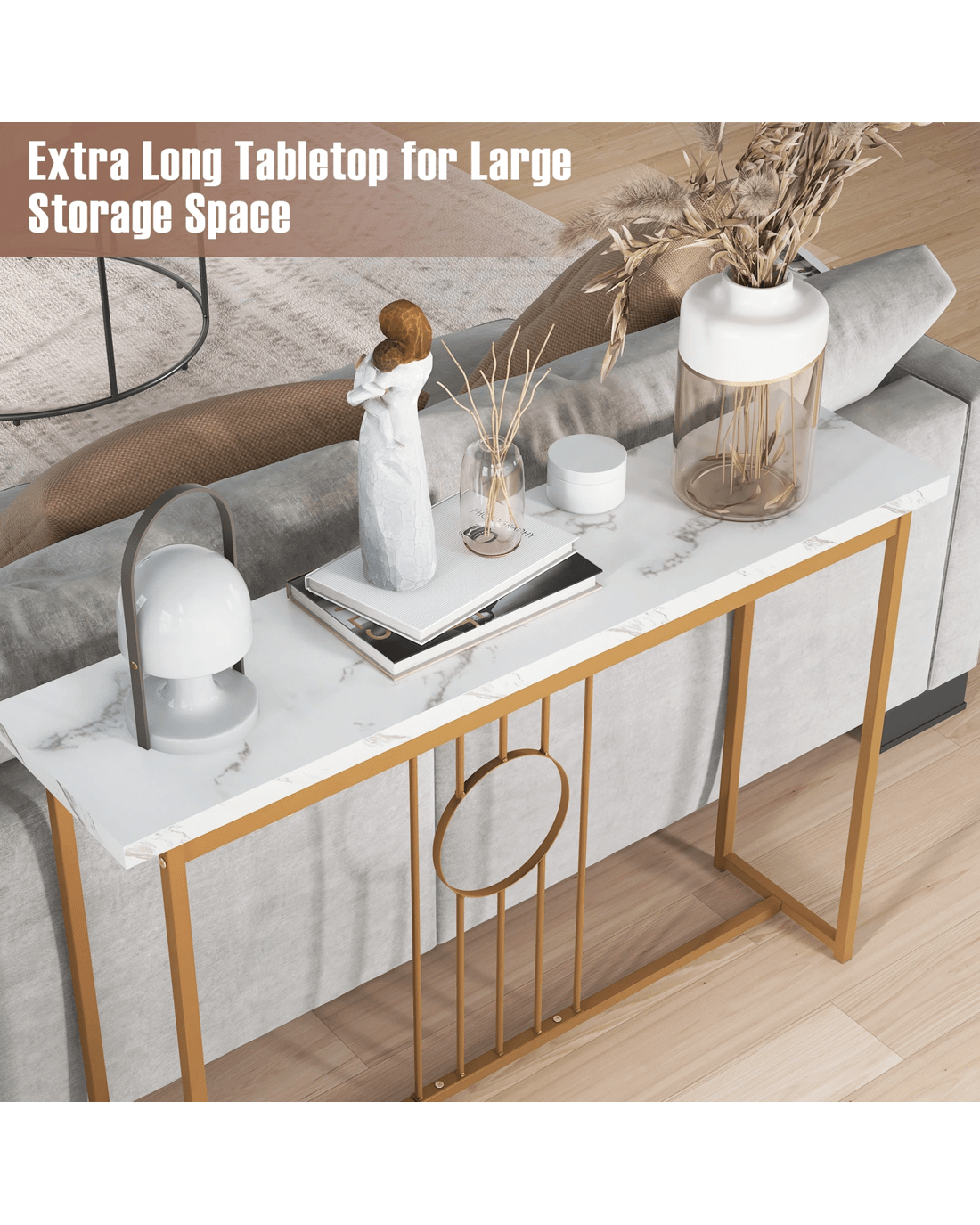 Boasting a water-proof faux marble tabletop and elegant gold metal legs, this table exudes sophistication and charm. The spacious tabletop provides ample room for displaying decor items like photo frames, models, or flowers, adding a personal touch to your space. Crafted with a heavy-duty rustproof metal frame, this table is designed for long-lasting durability. Unique features such as anti-slip feet protect your floors, while intricate ironwork and anti-toppling devices showcase the table's superior craftsmanship. Versatile and multifunctional, this console table can be used as an entryway table, display table, or sofa side table, adapting to your evolving needs. Enhance your home with this blend of contemporary aesthetics and practical versatility for a fresh and refined look.