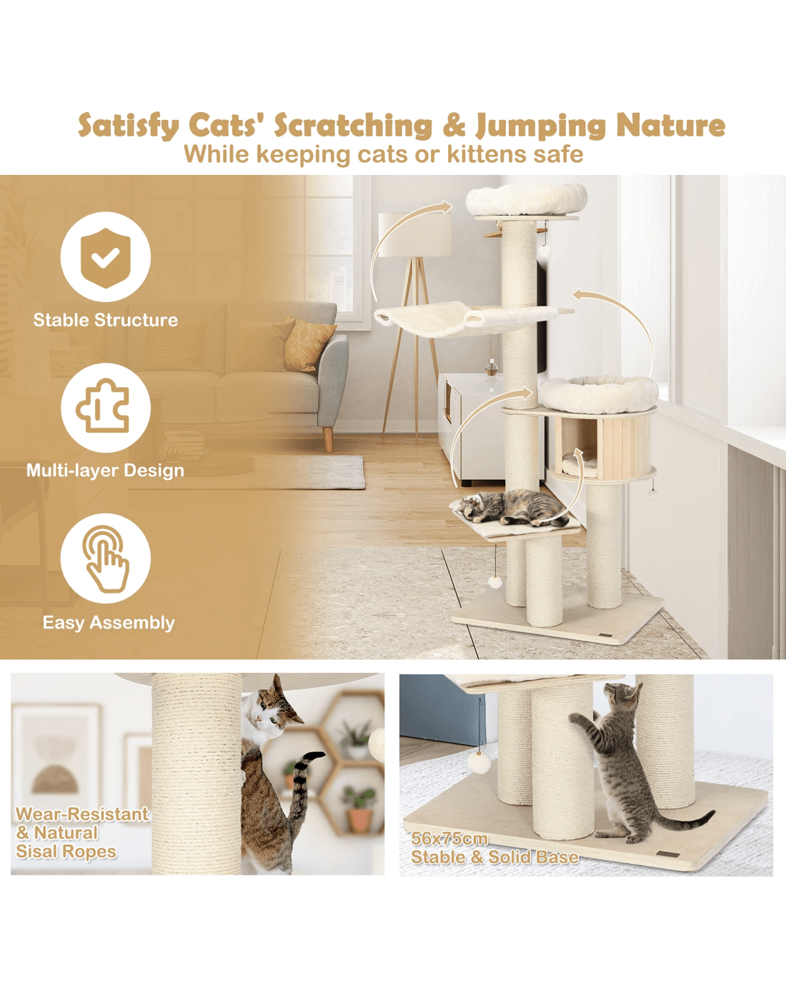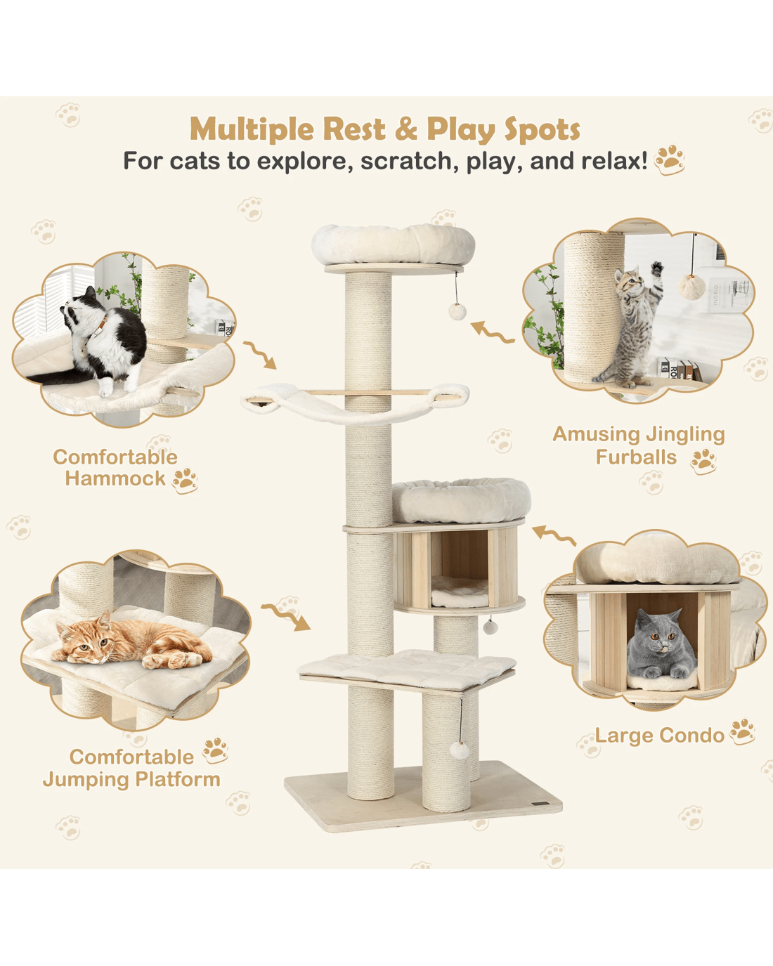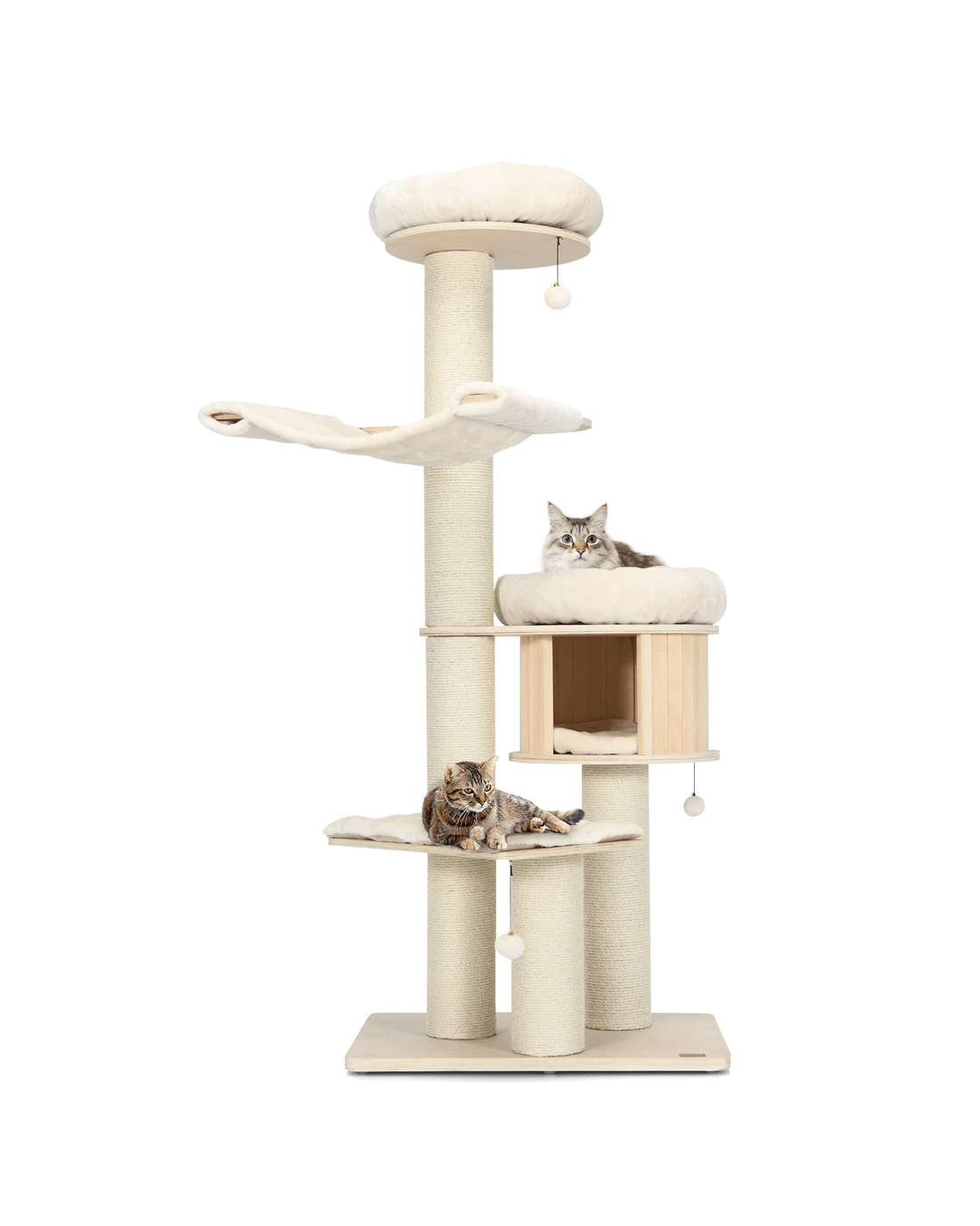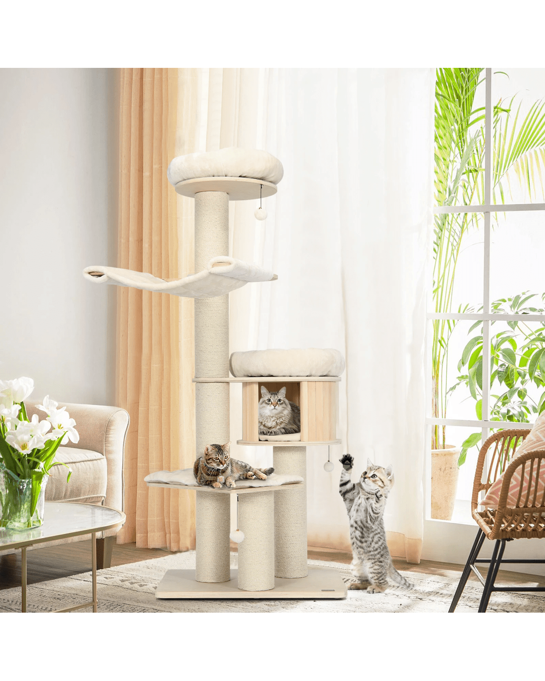 Our large cat tower provides various activity places for your lovely kitten to have a rest, take a nap, jump up and down, sunbathe, and enjoy the scenery out of the window. Your cat can overlook the world on a 174cm plush perch, play around with the sisal scratching posts and jingling fur balls, or take a nap in the warm condo. Besides, with the big columns and wide base, the cat tree is ultra-sturdy, allowing cats to leap on or off easily and safely. Crafted with solid pine wood and birch wood, the cat tree is feline-friendly, safe and durable with a long lifespan. The plush cushions make it extremely comfortable. In addition, the natural sisal scratching posts allow your kitten to sharpen nails while protecting your furniture from scratches.