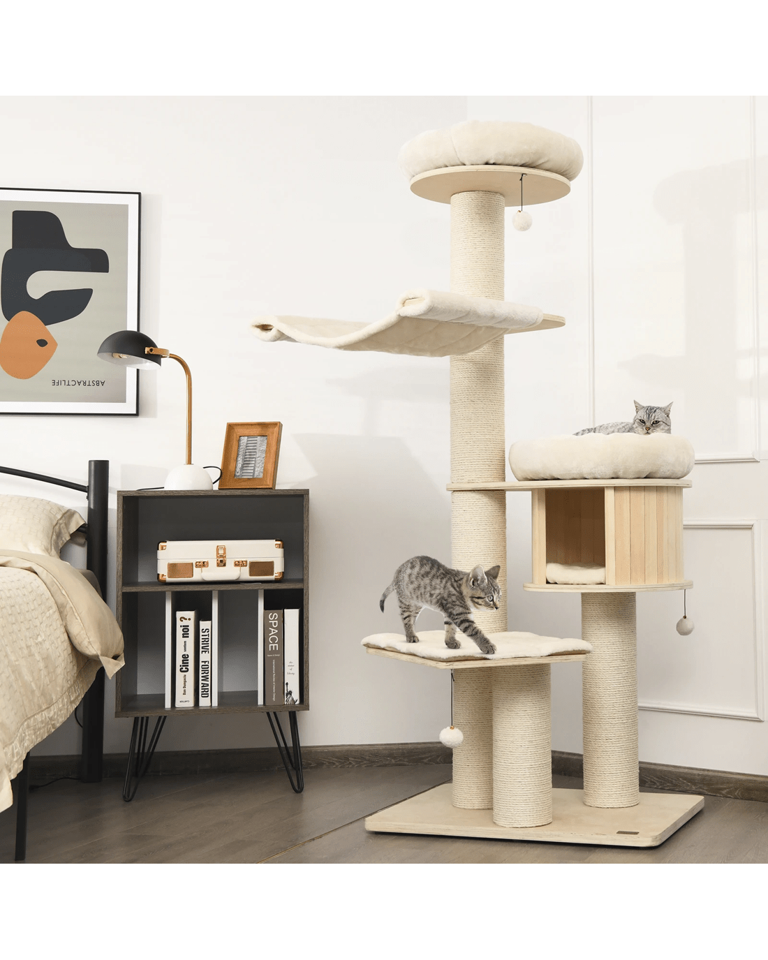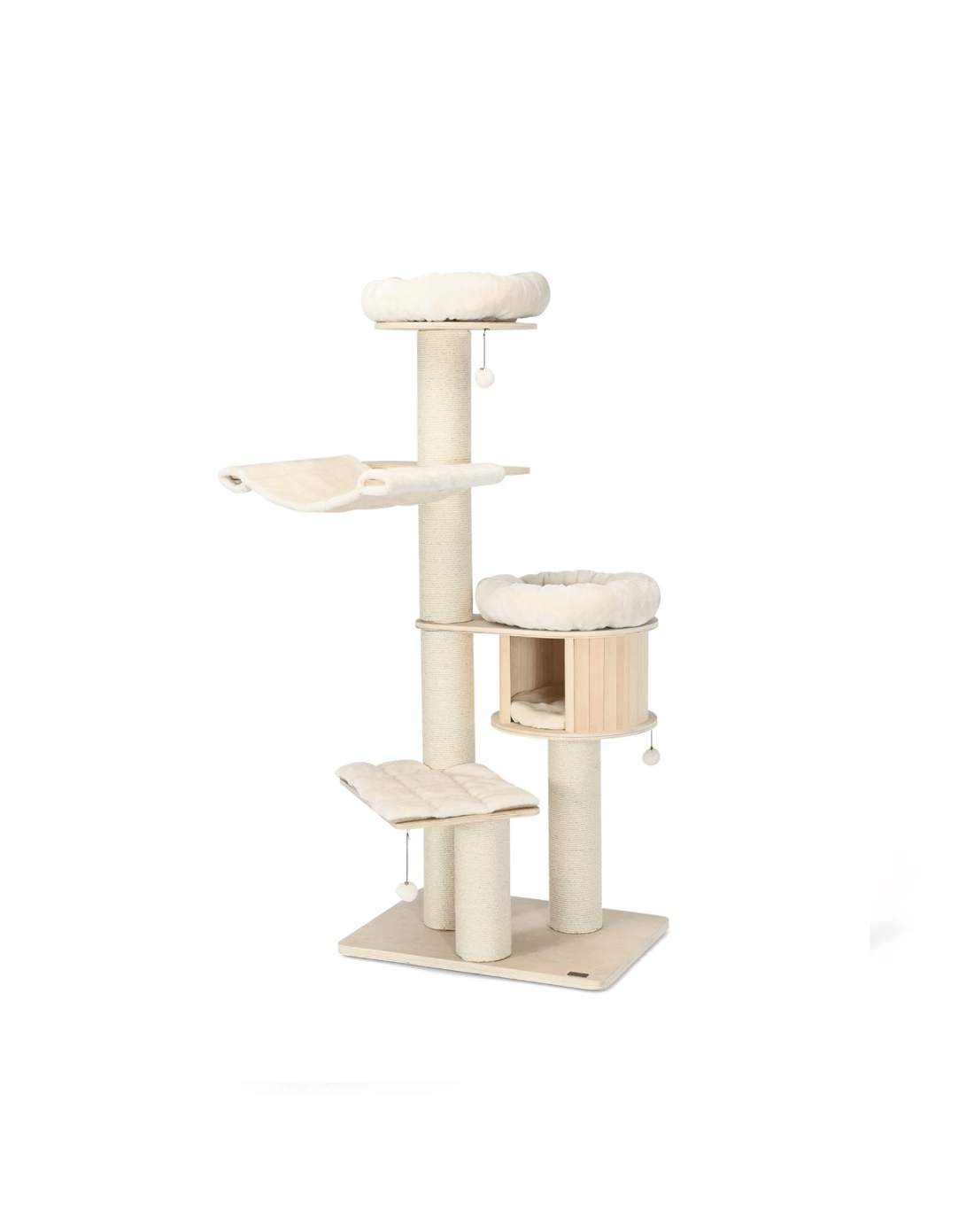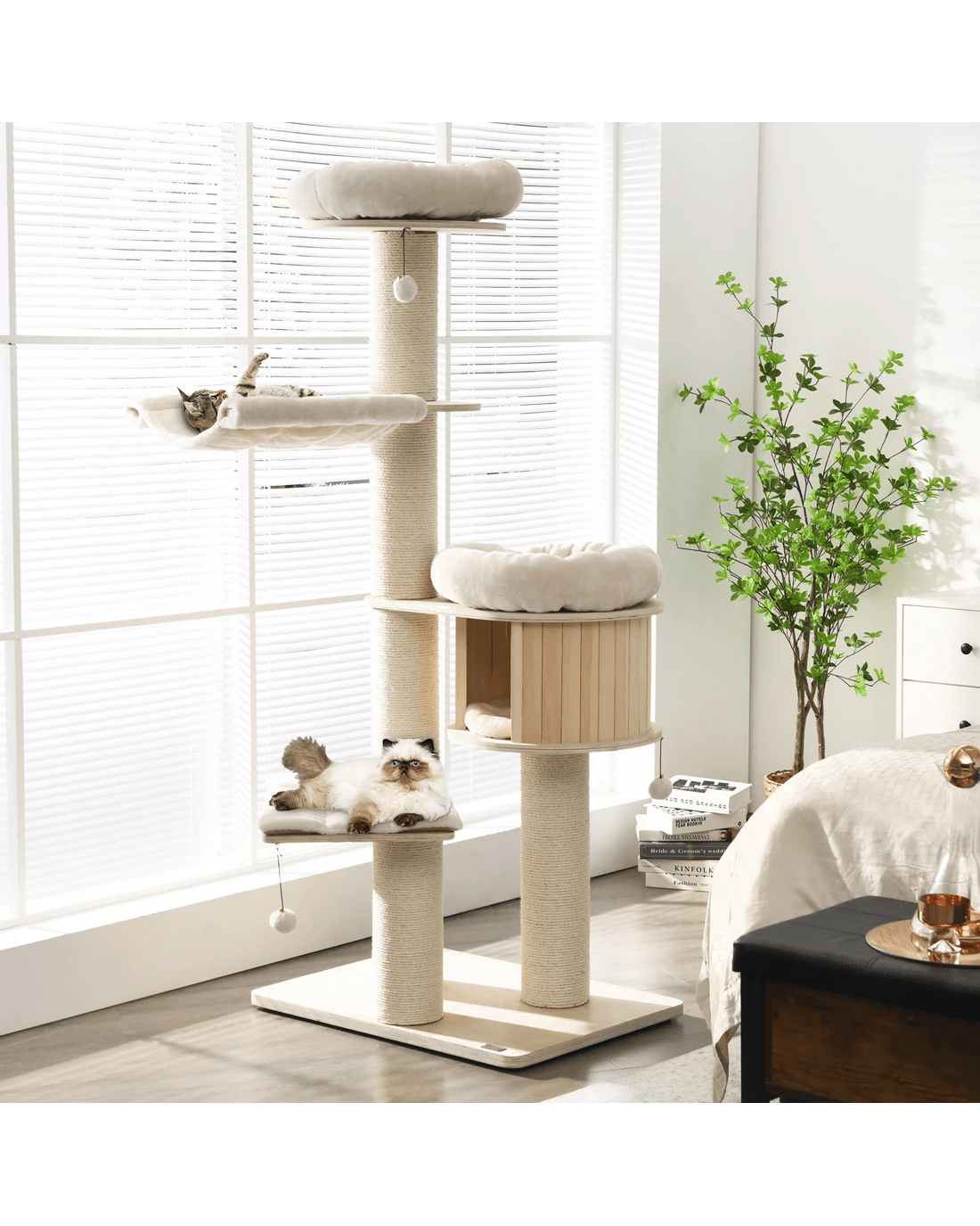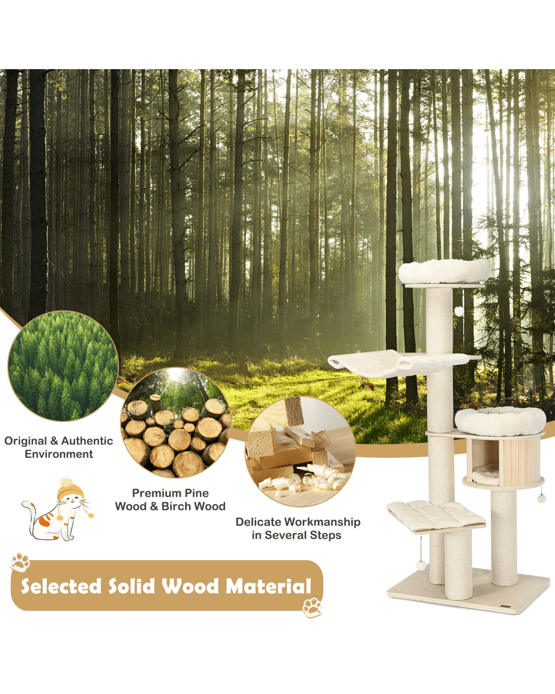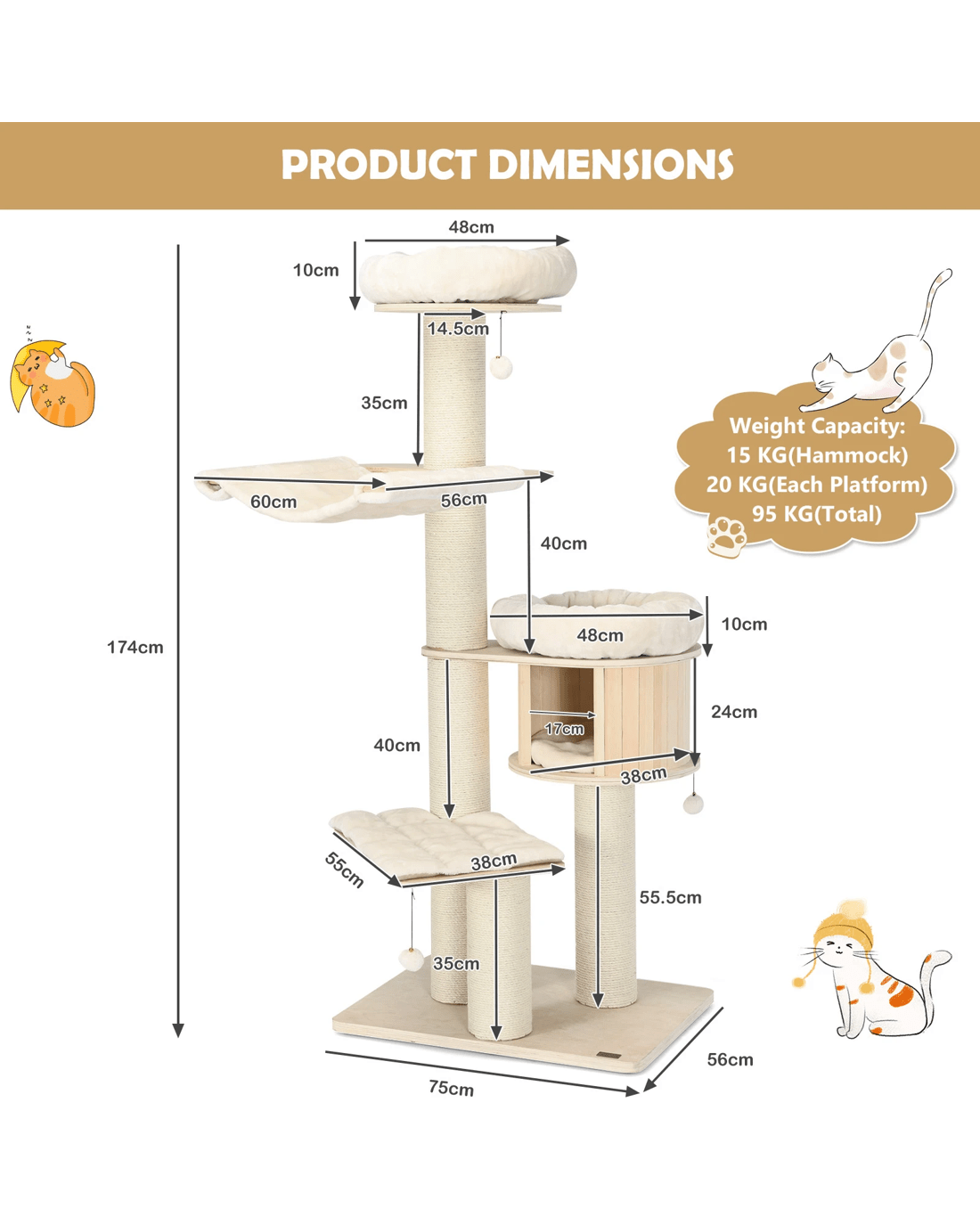 Our large cat tower provides various activity places for your lovely kitten to have a rest, take a nap, jump up and down, sunbathe, and enjoy the scenery out of the window. Your cat can overlook the world on a 174cm plush perch, play around with the sisal scratching posts and jingling fur balls, or take a nap in the warm condo. Besides, with the big columns and wide base, the cat tree is ultra-sturdy, allowing cats to leap on or off easily and safely. Crafted with solid pine wood and birch wood, the cat tree is feline-friendly, safe and durable with a long lifespan. The plush cushions make it extremely comfortable. In addition, the natural sisal scratching posts allow your kitten to sharpen nails while protecting your furniture from scratches.