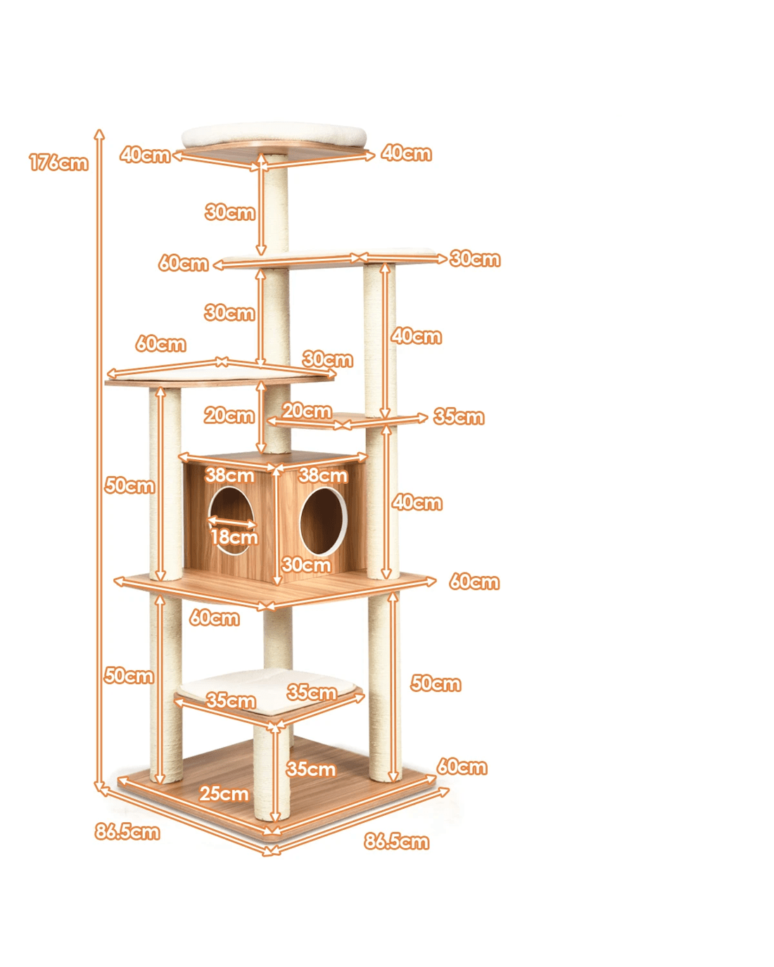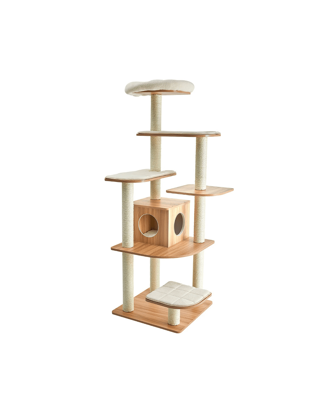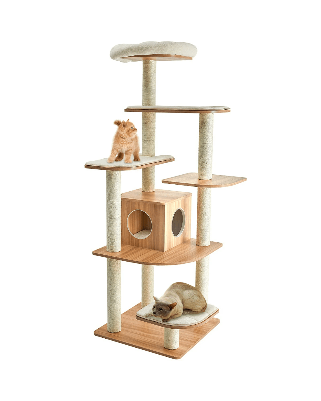 This unique cat tree that wood grain covering all the boards, perfectly presents a sense of high grade and fashion, and the natural color could match well with your house decor. With this practical cat climbing frame, your cat can often contact climbing and jumping skills. The pillars are wound with high-quality wear-resistant sisal rope, which is convenient for cats to sharpen their claws or climb. In addition, fluffy and warm cushion fixed by Velcro on each platform is easy for you to clean up and create a comfy environment for your cats. A spacious room with two cat holes can protect the privacy of pets and provide them with a safe sleeping environment.