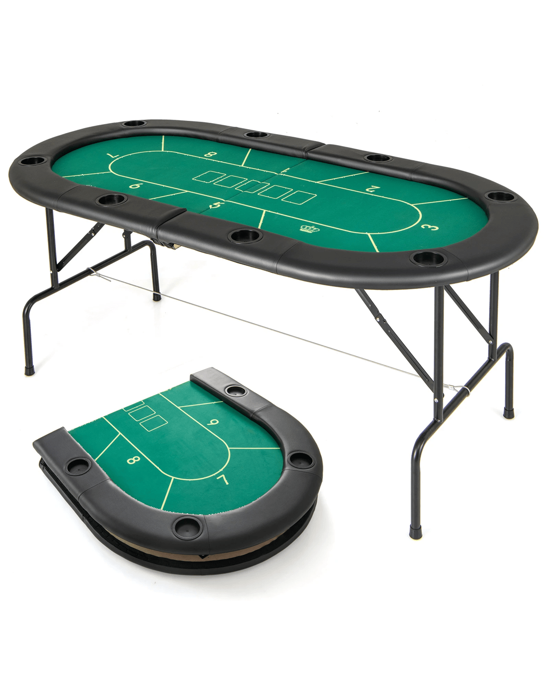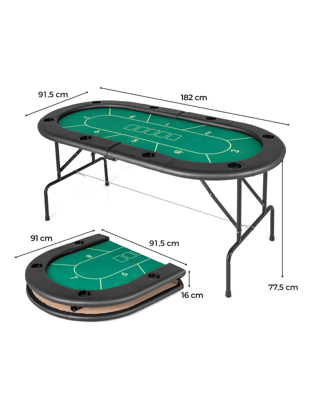 Are you looking for a poker table that combines luxury, functionality, and convenience? Our premium casino-grade poker table is designed to provide an exceptional gaming experience with its smooth, noise-minimizing surface. It features 8 built-in cup holders, each 7.5 cm in size, perfect for securing your drinks during intense gameplay. The table's robust metal frame, reinforced with reliable steel cables, ensures stability, while non-slip foot pads and a stable triangular structure provide a secure base on any surface. Additionally, the padded armrests, covered with waterproof PU leather, offer comfort and easy maintenance. Best of all, no assembly is required, simply unfold the frame from the package and you're ready to host your next game night. It comfortably seats 8 players and can be easily stored away when not in use, making it the perfect addition to any home gaming setup.