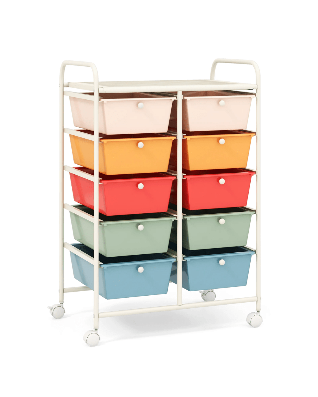 Whether you're a teacher looking for a way to store and organize classroom supplies, an office worker in need of extra storage for paperwork or a homeowner wanting to declutter your space, the 10-drawer rolling storage cart is a practical and stylish solution!This utility cart features 1 mesh top platform and 10 spacious drawers, allowing you to store and organize a variety of items such as tools, scrapbook paper, office supplies, or craft materials. And The drawers are also removable, making it convenient to take them out and organize your supplies even more efficiently. If you wanna move it, just grab the metal handles and push it through 4 universal wheels.