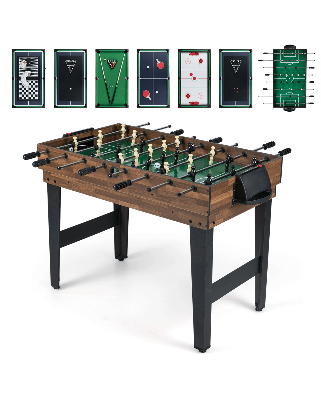 10 in 1 design includes hockey, foosball, billiards, shuffleboard, table tennis, chess, checkers, bowling, backgammon, and poker