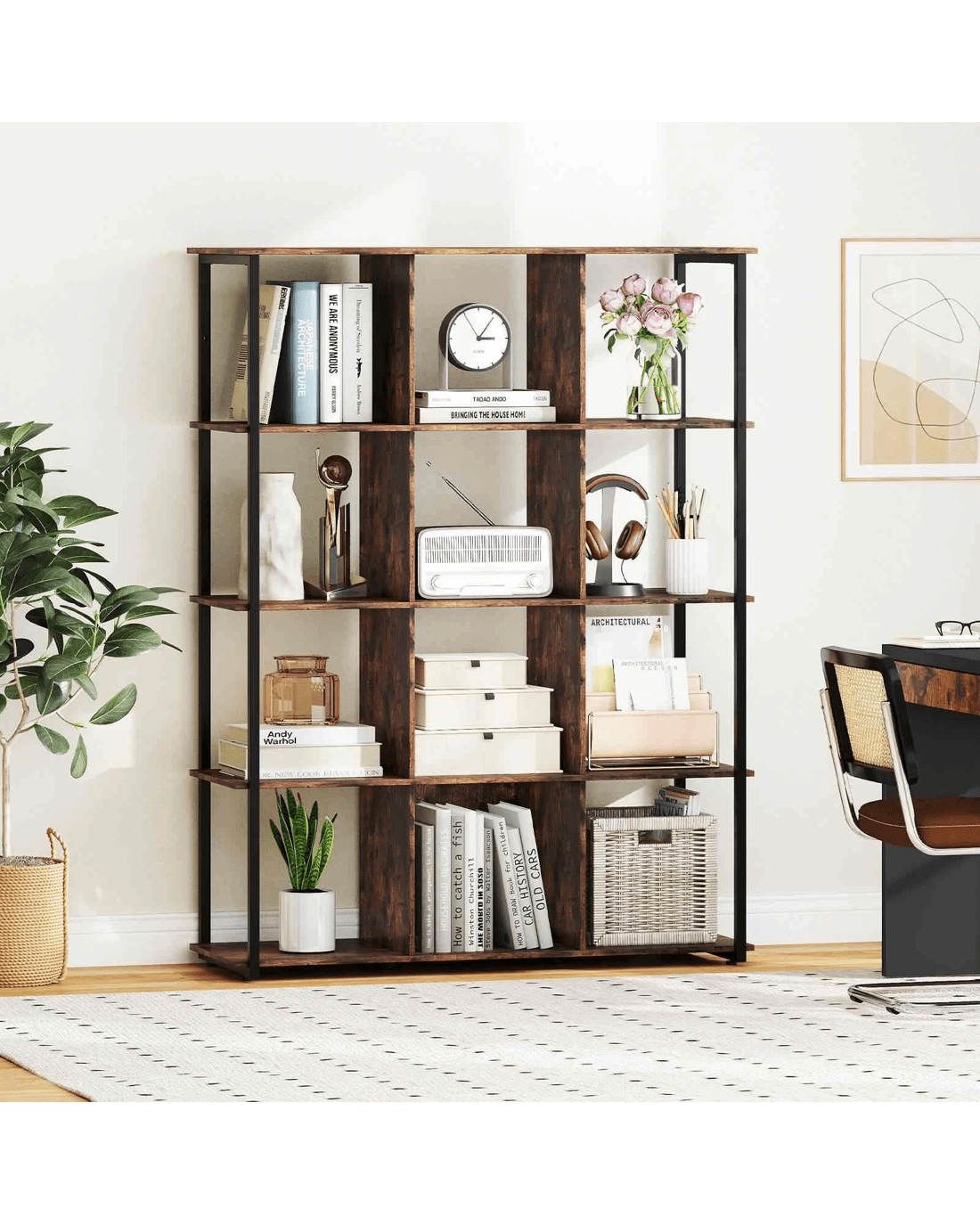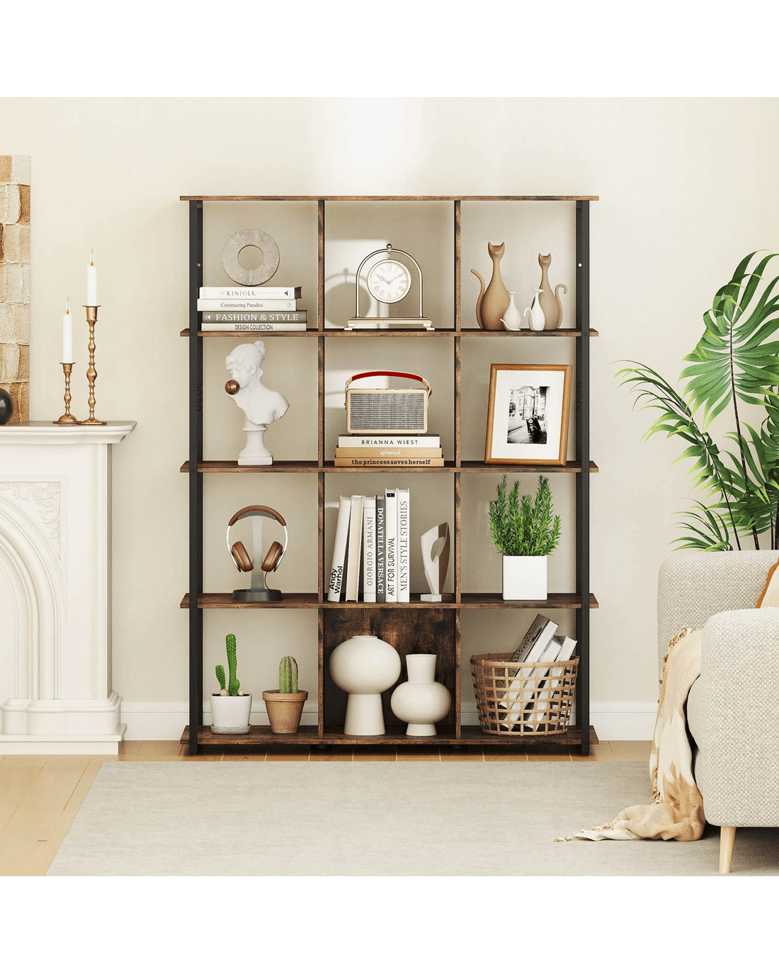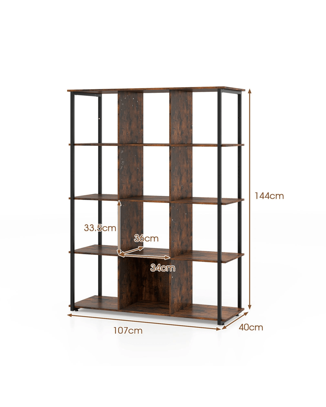 Revolutionize your space with our sleek and stylish 12-cube bookshelf, the perfect organizational and decorative addition to your home! Showcase books, cherished photos, and memorabilia on this sturdy, heavy-duty bookshelf, featuring an eye-catching rustic charm and a chic modern frame. Security is never a concern; it comes with 2 anti-tip kits for added stability. Measuring a versatile 107 x 40 x 144 cm (L x W x H), it’s as practical in the living room as it is in the office, easily doubling as a room divider. Upgrade your storage without sacrificing style and enjoy the effortless upkeep. Transform your space into a sanctuary of order and style now!