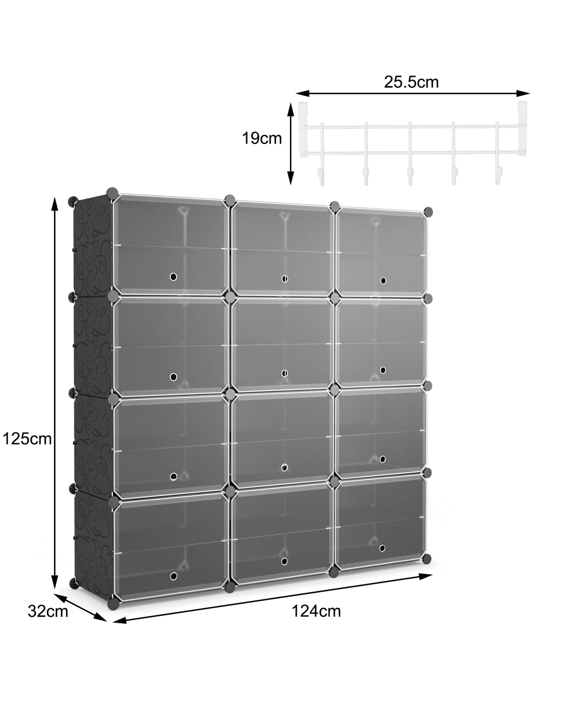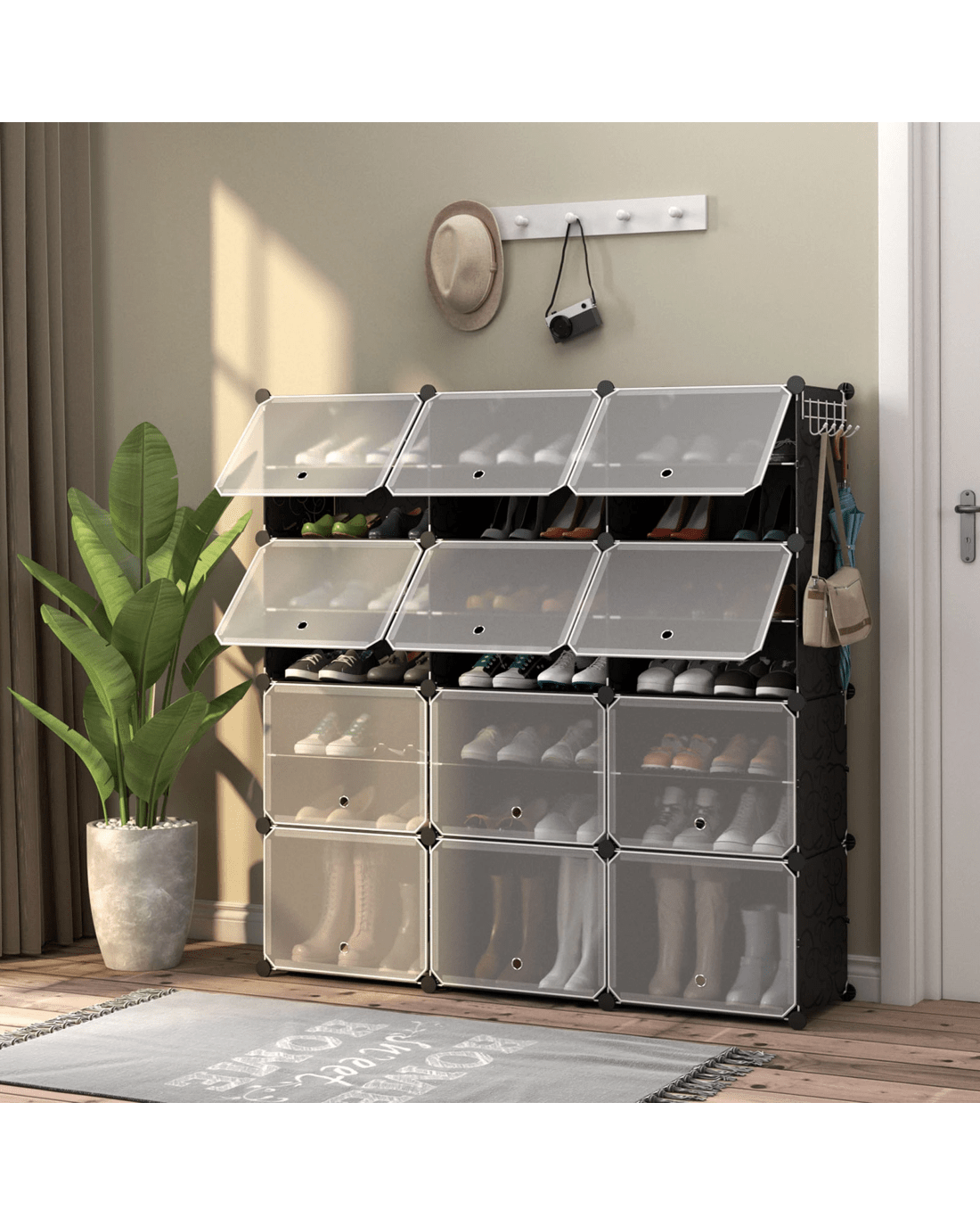 The 12-cube shoe rack organizer provides large storage capacity of 48 pairs for different kinds of shoes, such as slippers, causal shoes, leather shoes and so on. Each cube is divided into 2 layers with a partition that can be removed to fit high heels and boots. The transparent doors protect your items from dust while allowing you to find what you need quickly. The cut-out hole promotes air circulation to avoid peculiar smell. The sturdy steel support and durable PP panels endow the storage unit with a sturdy and durable structure. Also, the 8-tier storage organizer is definitely a good storage solution for lightweight items! It's ideal for storing clothing, bags, books and other sundries, suitable for entryway, little one's room, bedroom or dormitory. You can also hang your bags, hats and umbrellas on the side hook for easy access. Furthermore, the shoe stand is easy to assemble, and can be personalized according to your different needs.