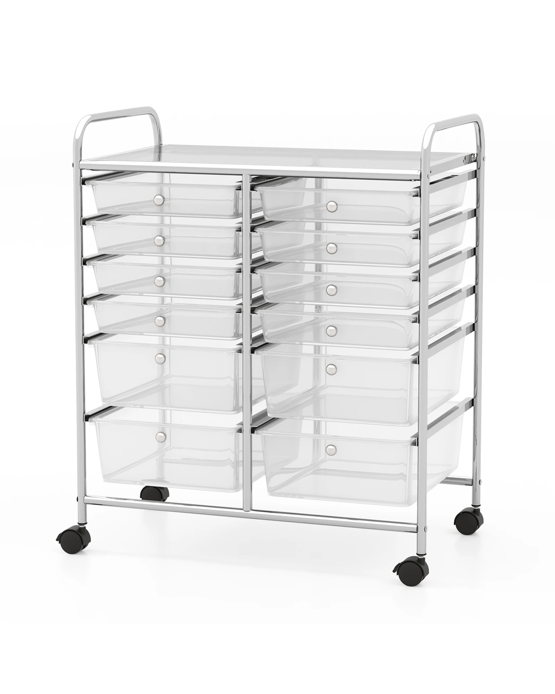 This 12-drawer rolling storage cart features 4 bigger drawers and 8 smaller ones, which provides you ample space to storage and classify. Premium metal frame makes this trolley cart have a stable load capacity and a long service life. Besides, it comes with easy-to-grab handles and 4 universal wheels, which is portable to move and flexibly store any things like kitchen essentials, office supplies or various tools. And 4 wheels with 2 lockable function make it stop easier. It is also perfect for placing at different occasions such as office, home, living room, garage, school or anywhere that needs to be organized.