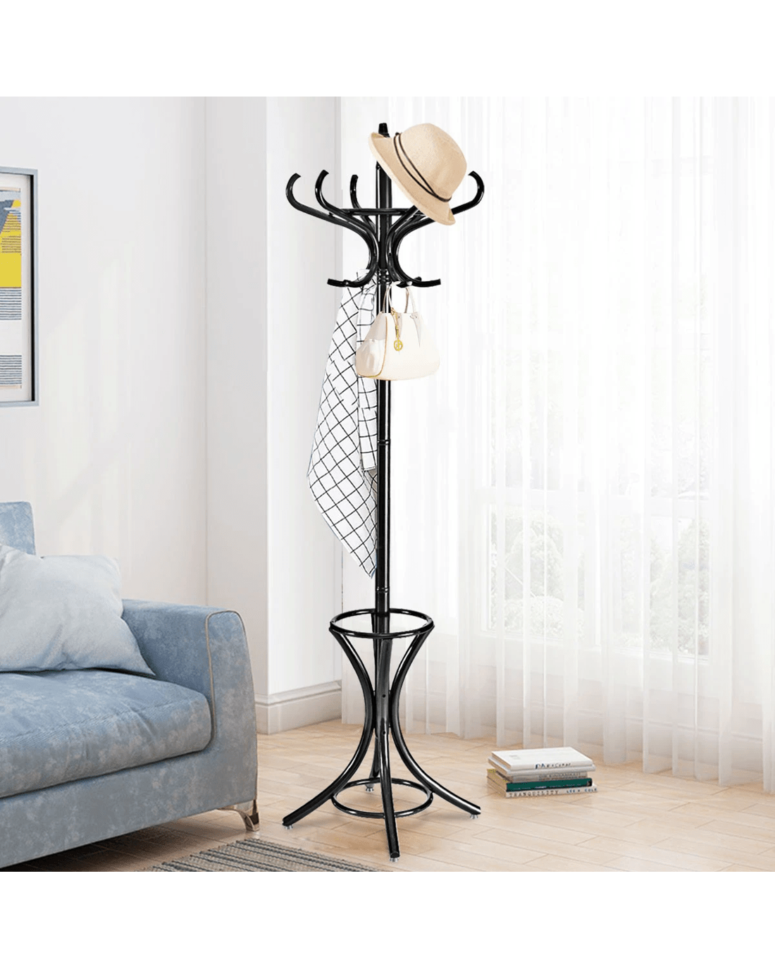 Costway 12 Hook Wood Coat & Hat Rack Clothes Stand Storage Tree Shelf - Black