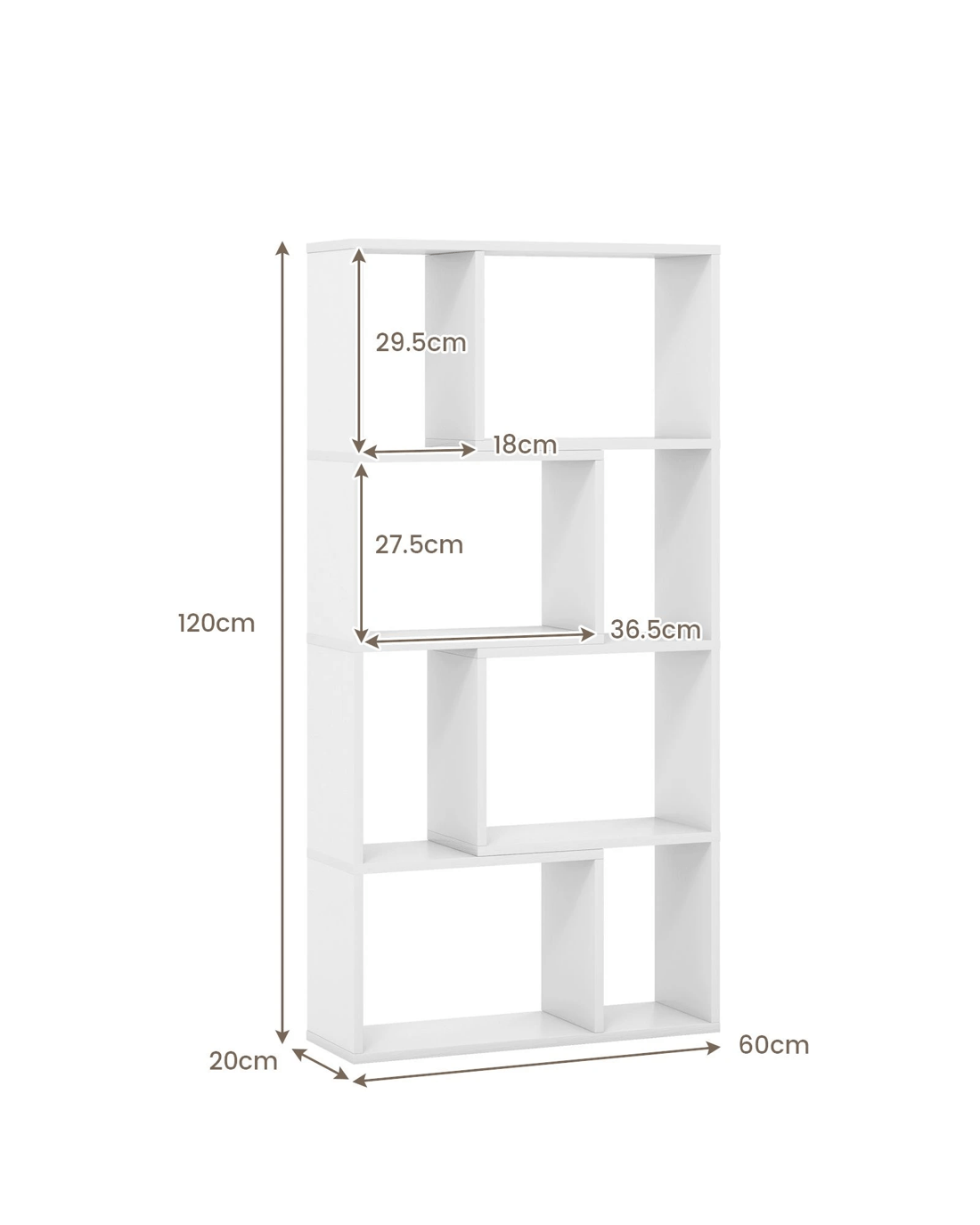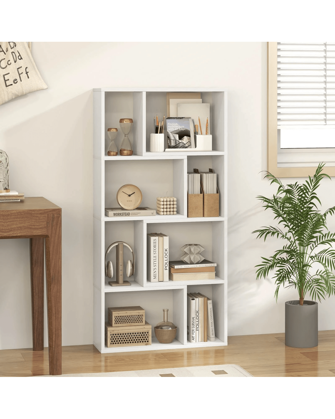 Introducing a chic and practical storage solution to meet all your needs! The sleek geometric design adds a striking touch to your living space, while the durable 8-cube storage organizer offers plenty of room for displaying and organizing your belongings. Constructed from sturdy thickened board, this free-standing bookcase ensures longevity and stability. With 2 anti-toppling devices included, you can safely place heavy items on the shelves without any concerns. Not only does this modern wooden organizer look great, but it also prioritizes functionality for a seamless storage experience.